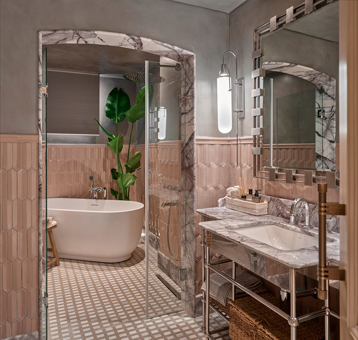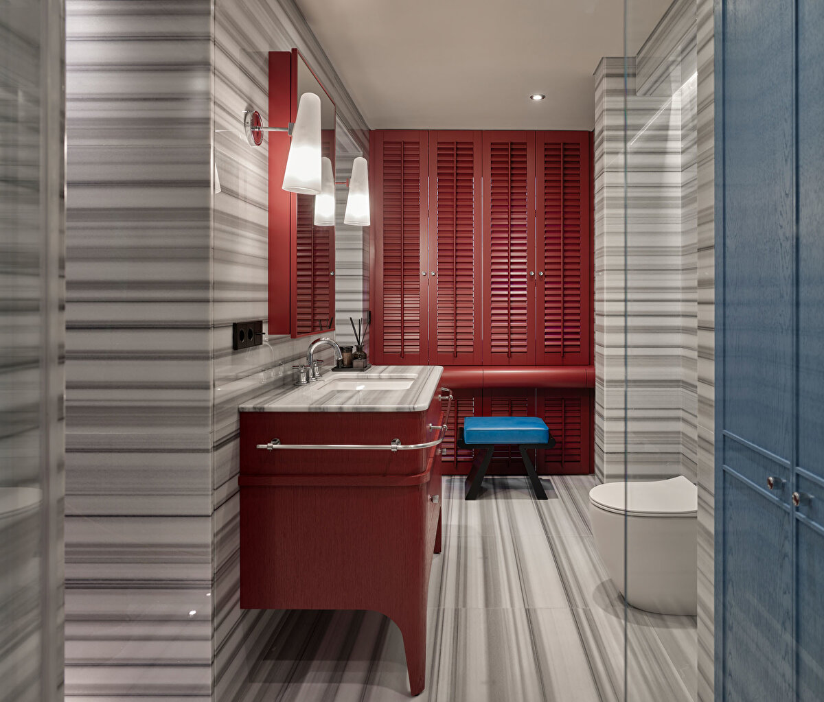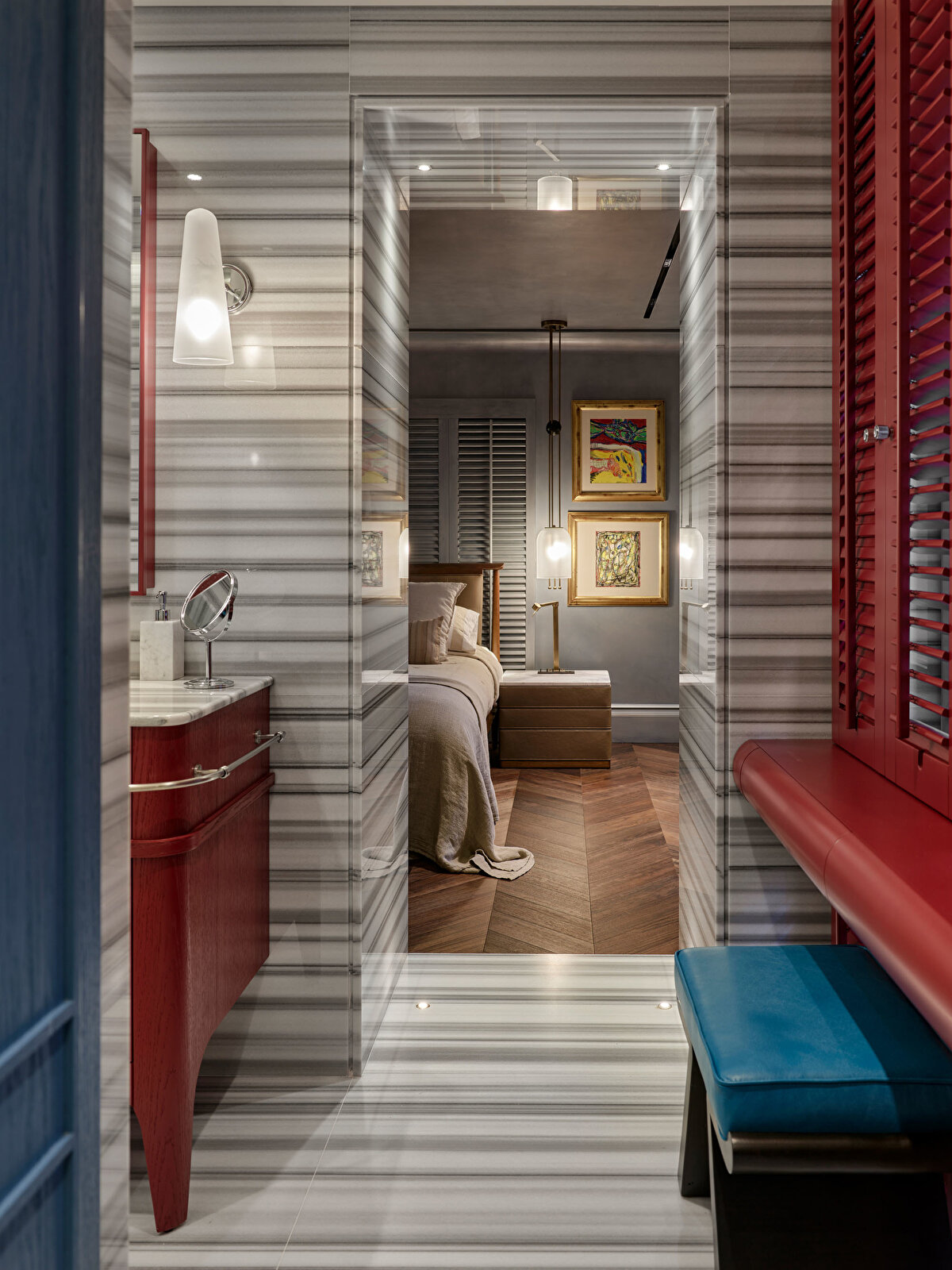 Orijinalini küçük olan mutfak yanındaki oda ile birleştirilerek genişletiliyor. Bu birleşme sonucunda hem mutfak hem de yemek alanı oluşturuluyor ve aralarında kemerli bir geçişle bağlantı sağlanıyor. Ebeveyn yatak odasına, apartmanın bahçesine panoramik bir görüntü sunacak şekilde sürpriz bir koridor ekleniyor. Bu koridor, evin orijinal balkonunu da kapsayacak şekilde oluşturuluyor. Evde kullanılan renkler ve materyaller doğal malzemelere dayanıyor. Meşe, seramik ve mermer gibi doğal malzemelerle pastel renk paletleri bir arada kullanılarak hem şık hem de sıcak bir atmosfer elde ediliyor.