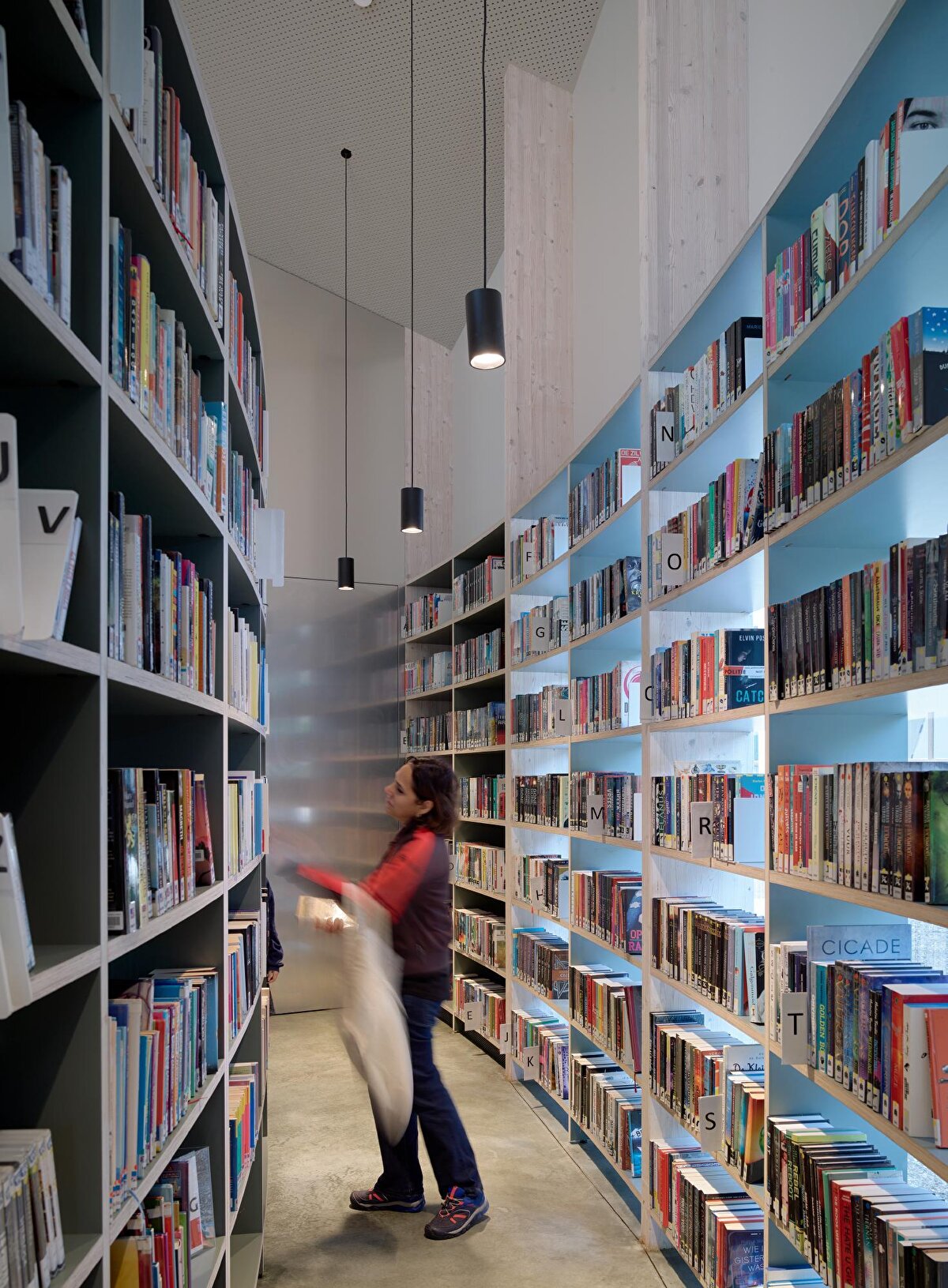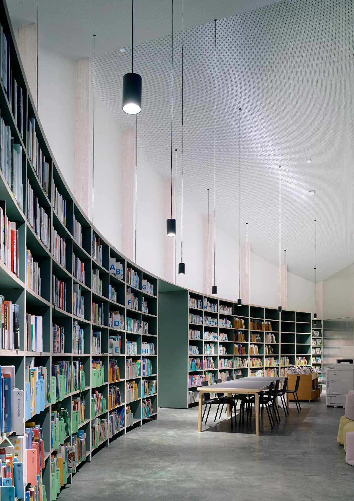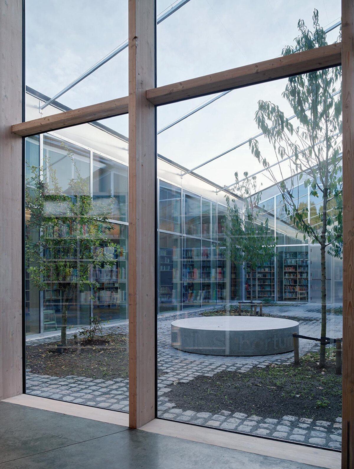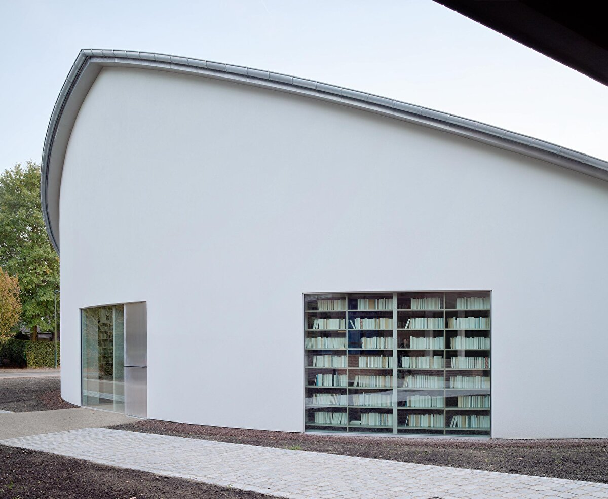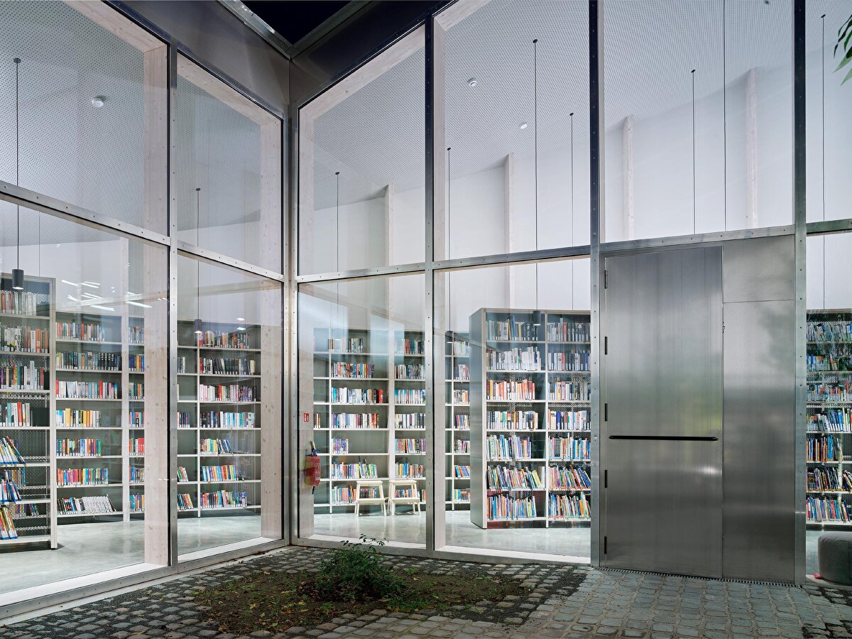 Eyer biçimli çatı ve dairesel sınır çizgisiyle tanımlanan yapı, belediye merkezinde konumlanan yeni kamu binalarının ilk öğesi olarak dikkat çekiyor. Çelik raflarla bütünleşen taşıyıcı sistem, kütüphane işleviyle yapısal öğeleri bir araya getiriyor. Ortadaki kare planlı avlu ise okuma bahçesi ve çok amaçlı salonla birlikte iç ve dış mekânlar arasında süreklilik kuruyor.