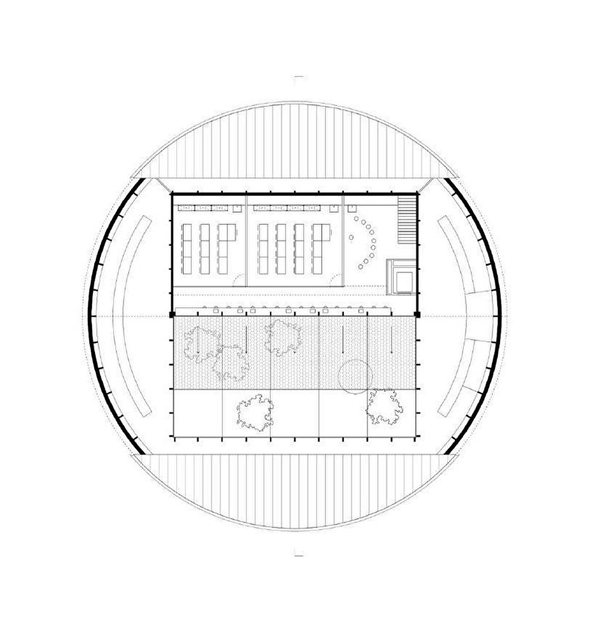 Defined by its saddle-shaped roof and circular boundary line, the building stands out as the first element of the new public buildings in the town centre. The structural system, integrated with steel shelves, combines the library function with structural elements. The central square courtyard, along with the reading garden and multi-purpose hall, establishes continuity between indoor and outdoor spaces.