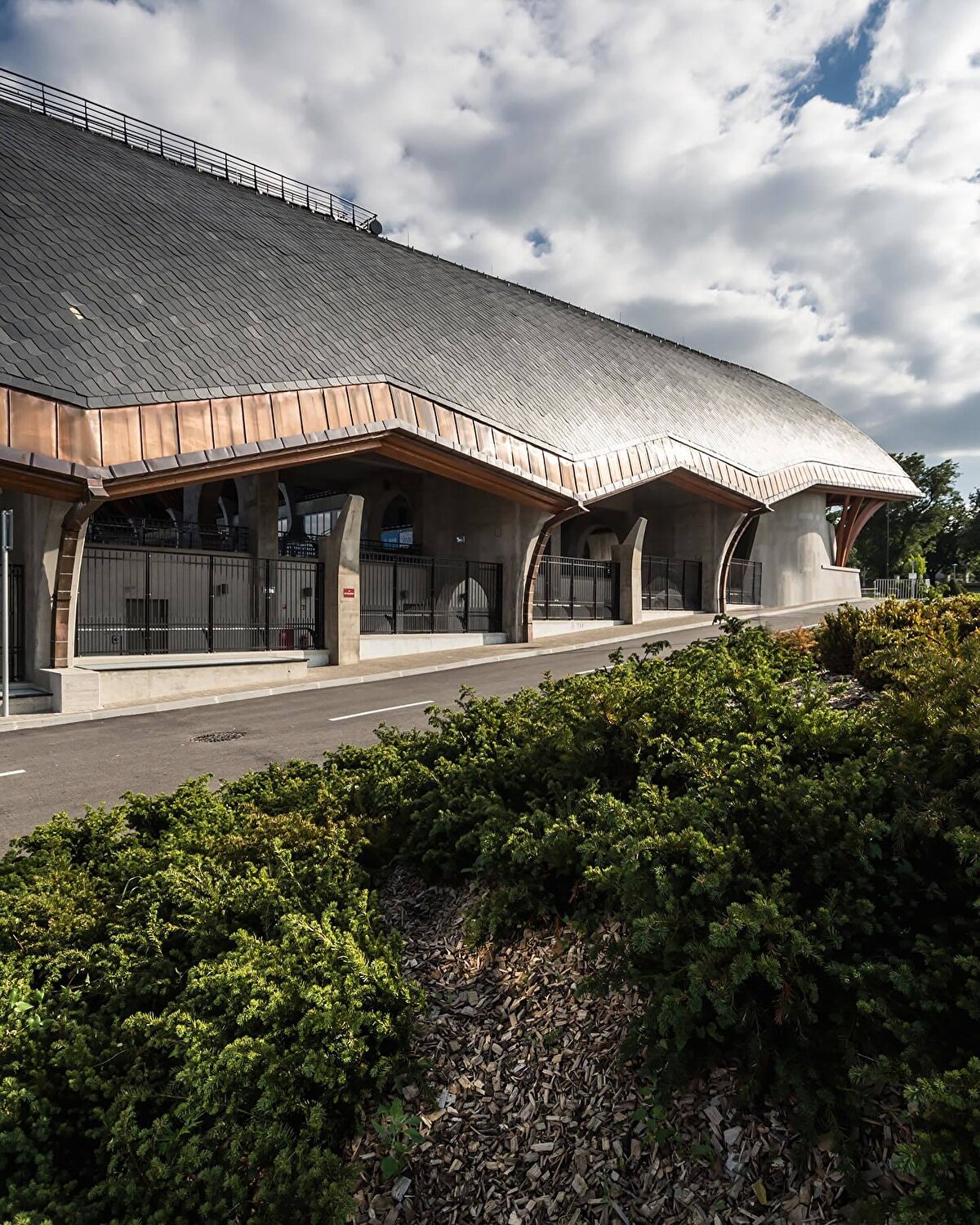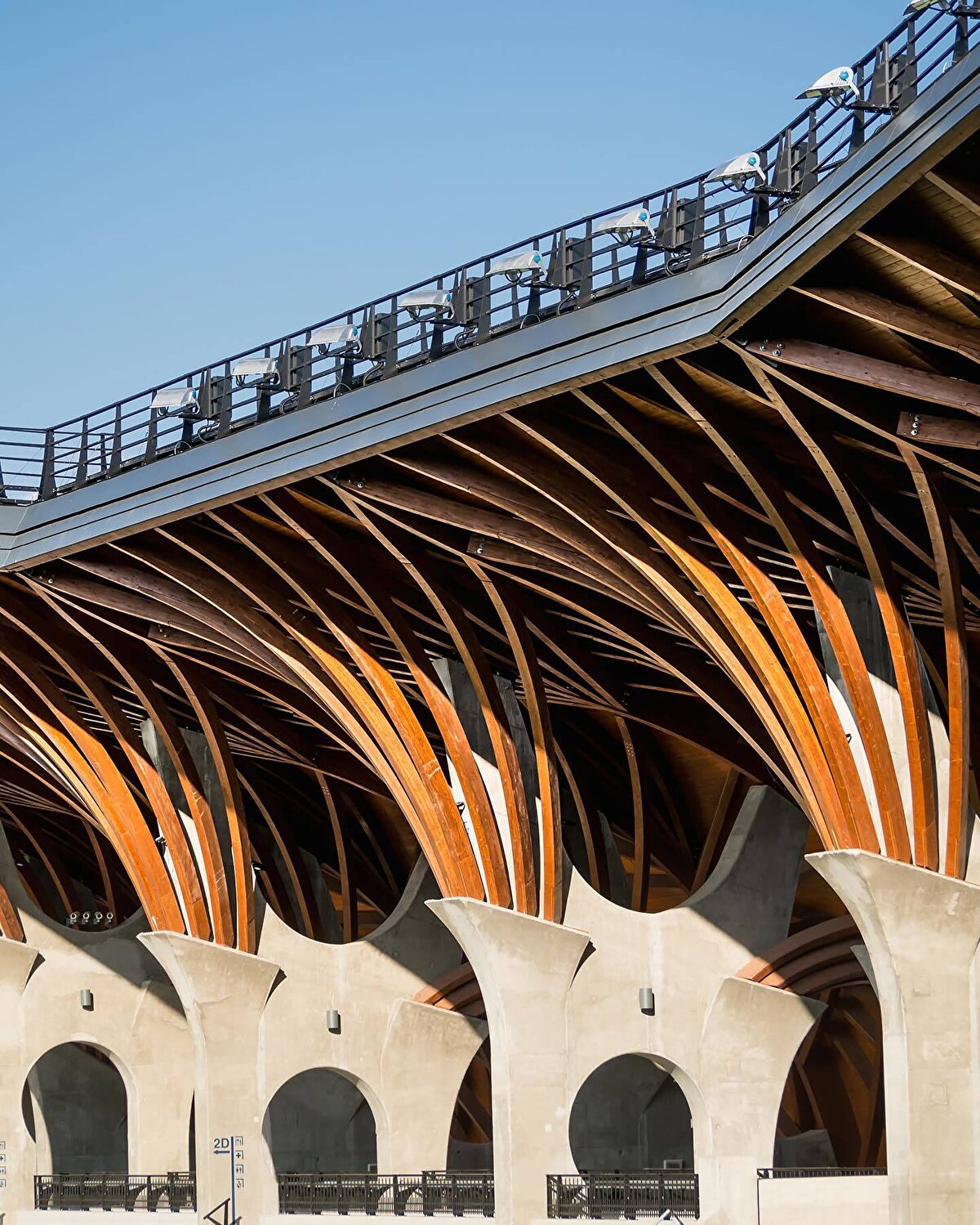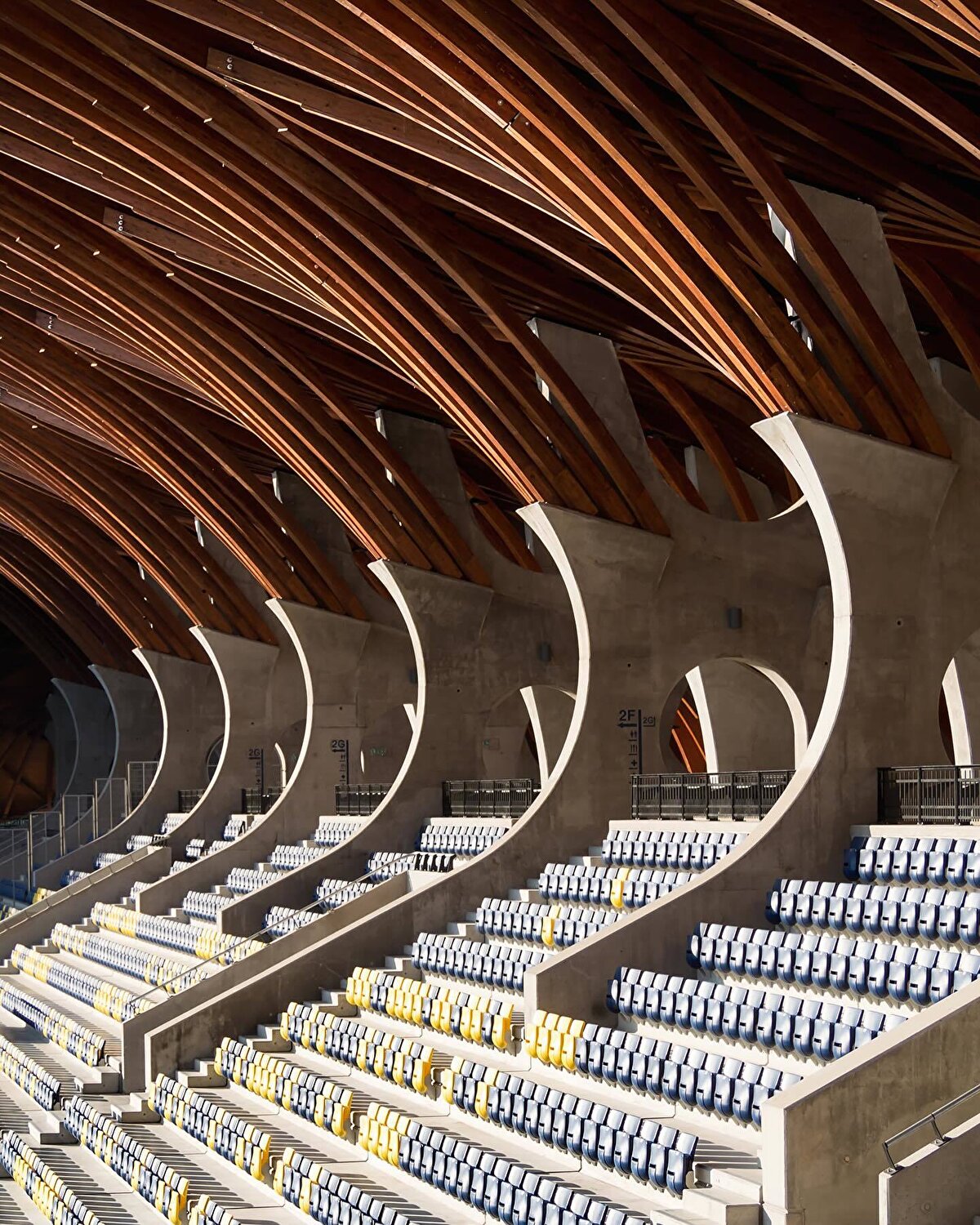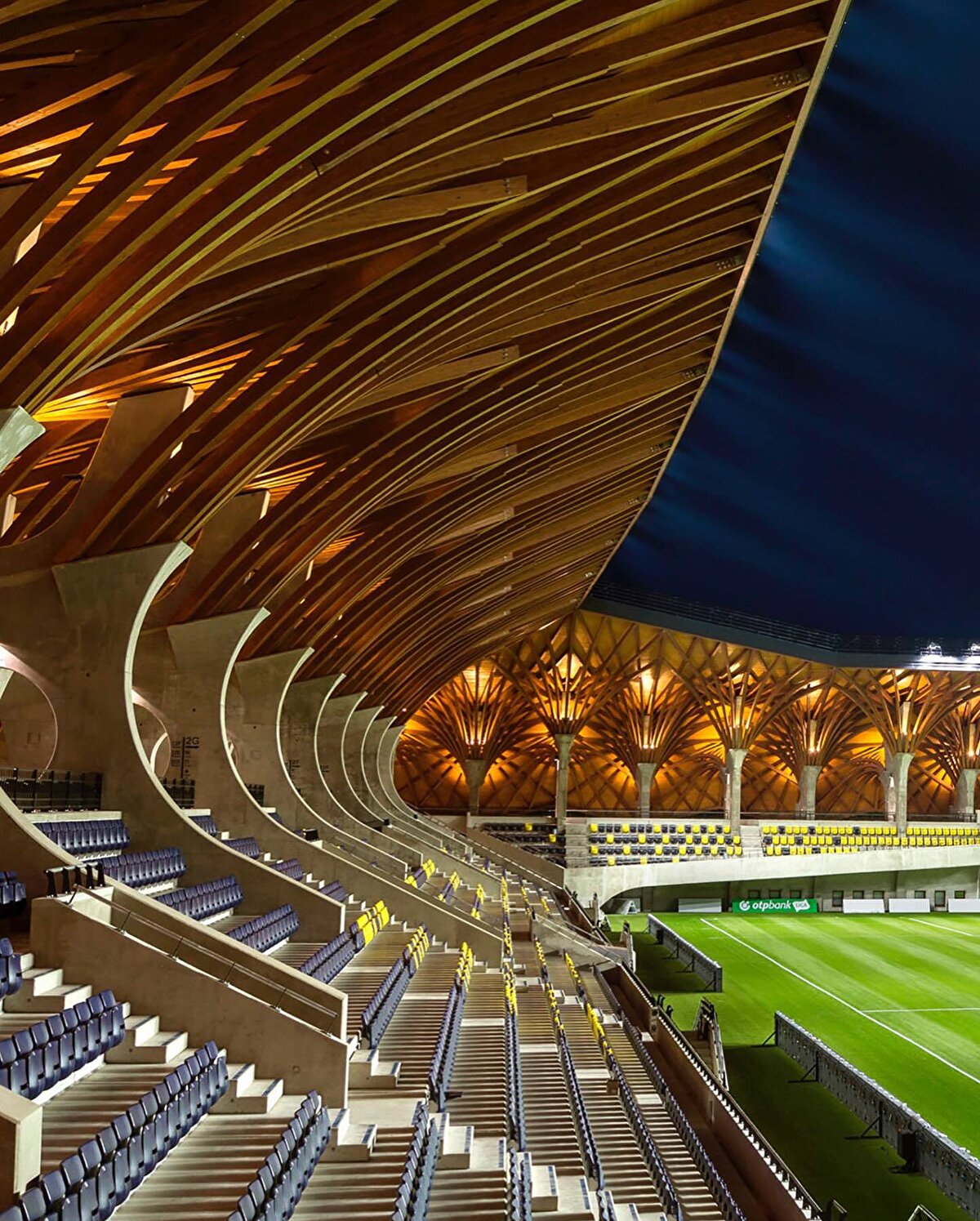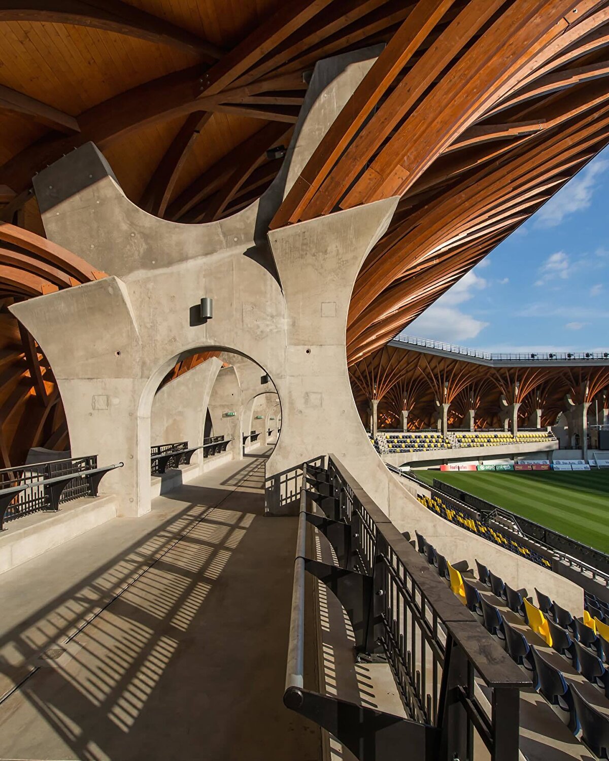 Betonarme ayakların üzerinde eğrisel ahşap taşıyıcılar yükseliyor. Ahşap çatı strüktür, stadyumun iç mekan kimliğini tanımlıyor. Koltuk sıraları arasında 100 cm ve koltuklar arasında 55 cm mesafe bulunan stadyum, Batı Avrupa stadyumlarındaki birinci sınıf bölüm konforunda planlanıyor.