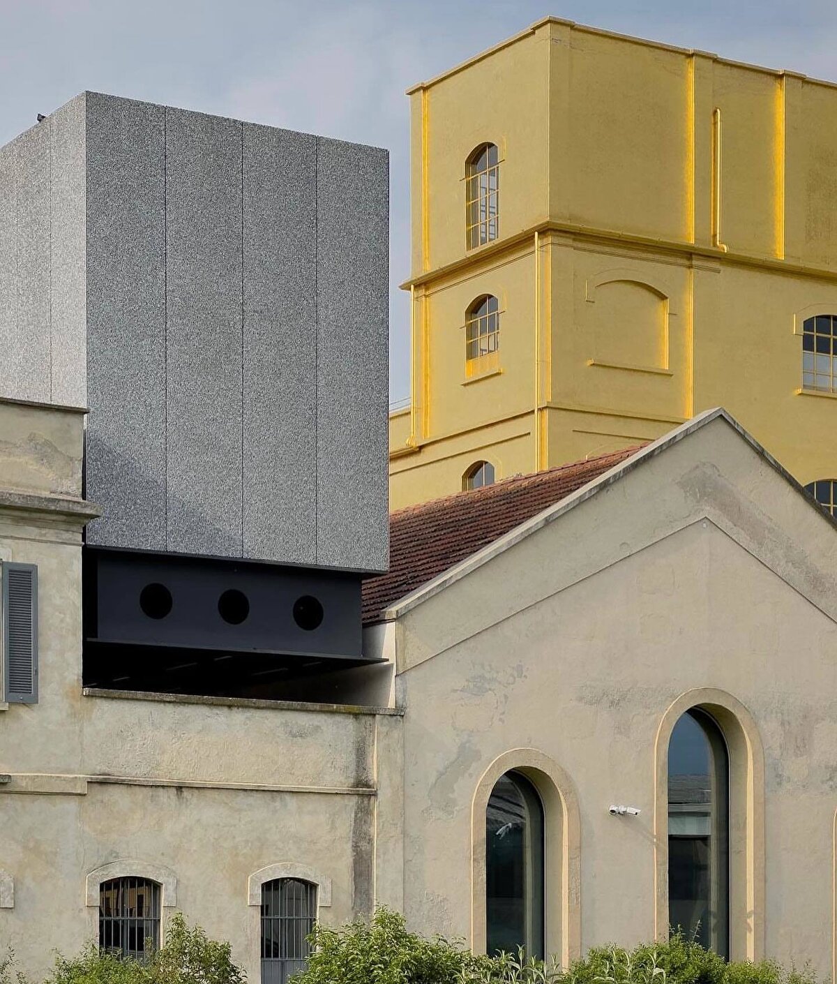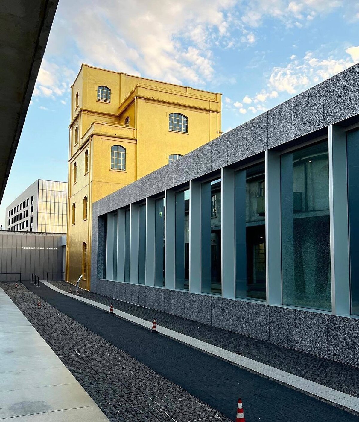Fondazione Prada'nın altın gibi parlayan dış yüzeyi, sanatın ışıltısını en yüksek seviyede yansıtıyor! ✨🏛️