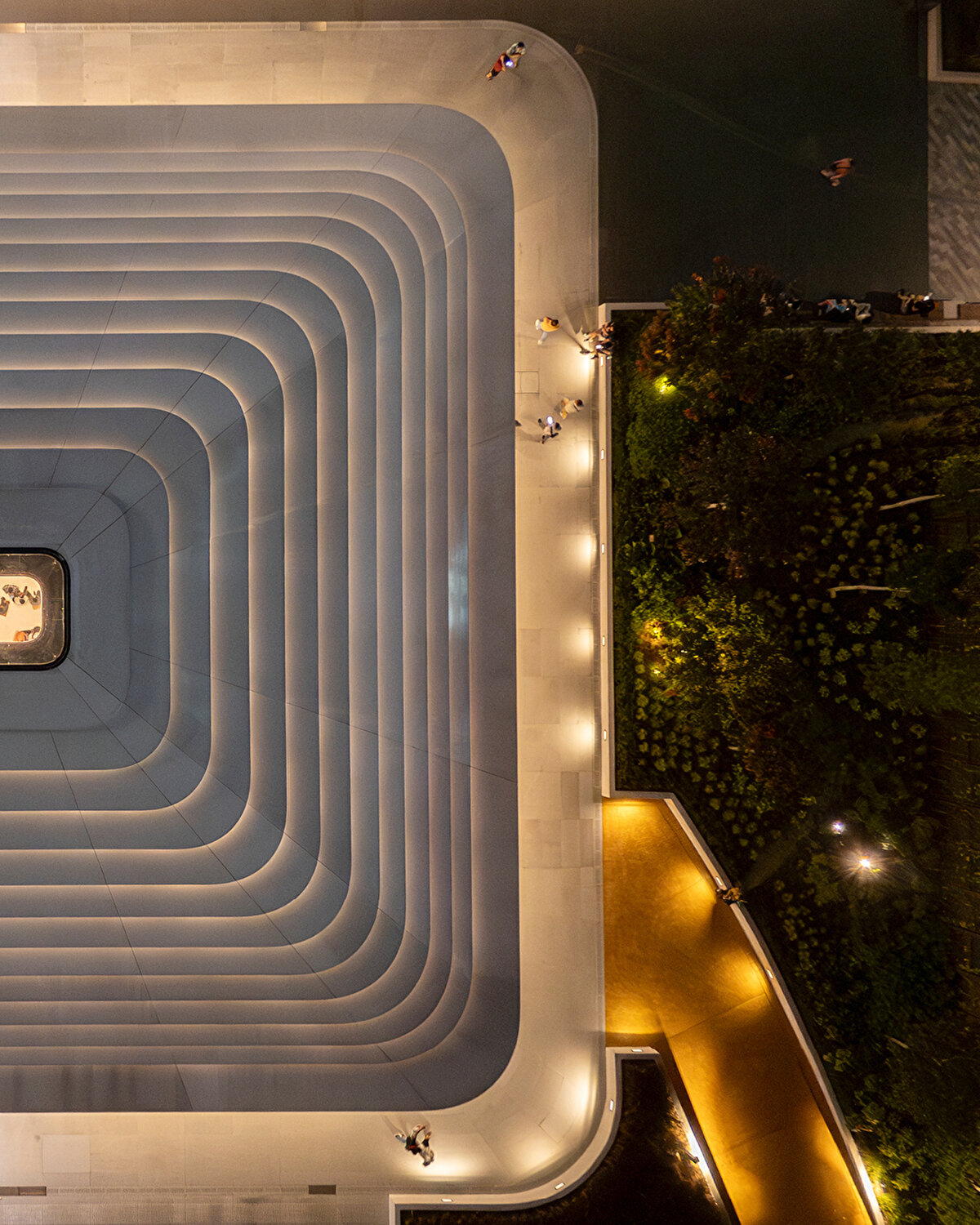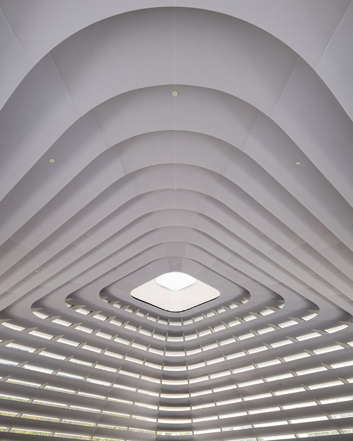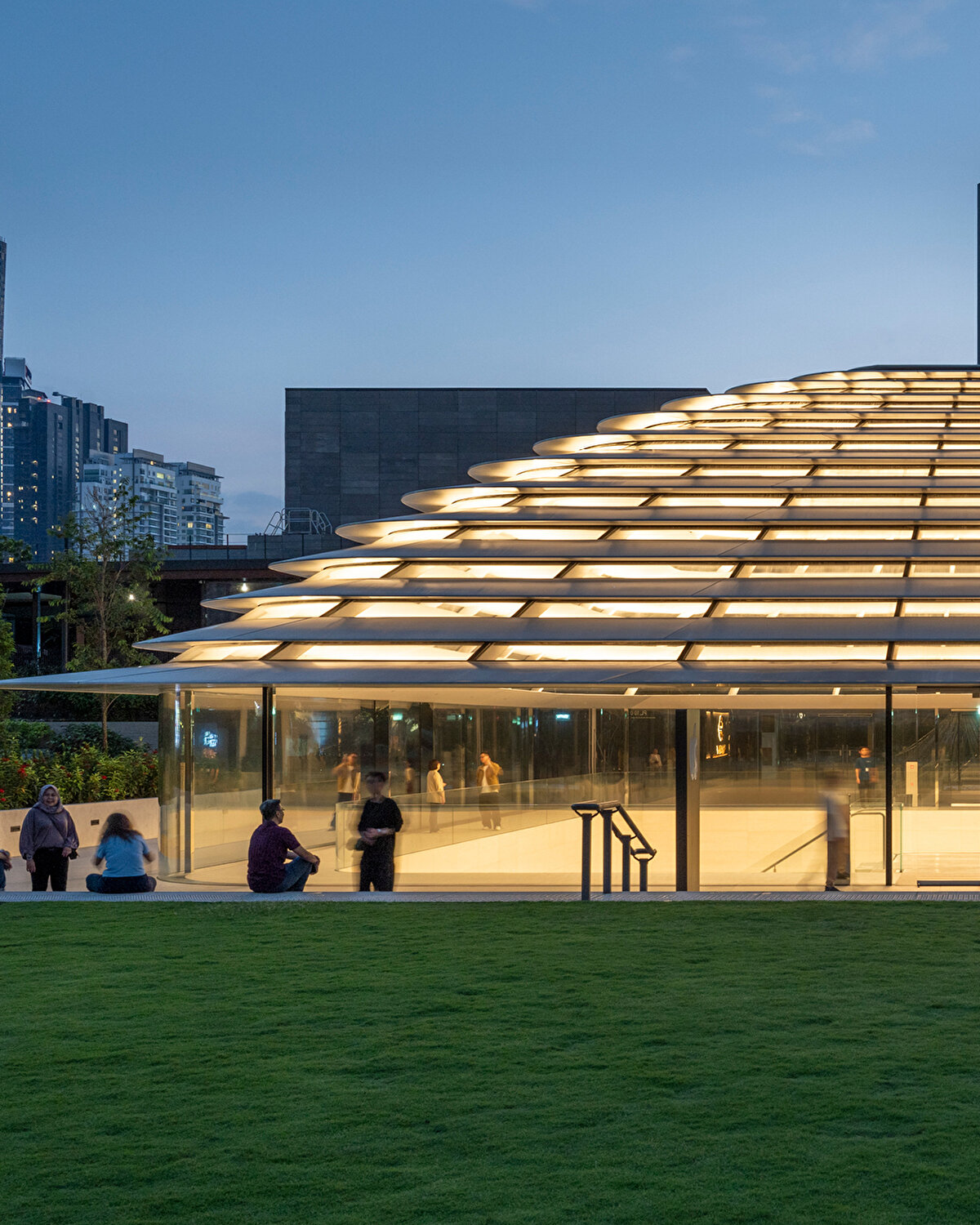Alt seviyelerde sağlam, üst seviyelerde ise geçirgen bir görünüme sahip olan çatı, tabandan tepeye kadar kare ve yuvarlak geometriler arasında geçiş yapıyor ve Malezya'nın tropikal iklimine uygun olarak güneş radyasyonunu kontrol eden kanatçıklarla gölgeleniyor. %30 seramik frit içeren merkezi camlı göz, iç mekana yumuşak gün ışığı alıyor ve dinamik bir aydınlatma sağlıyor.