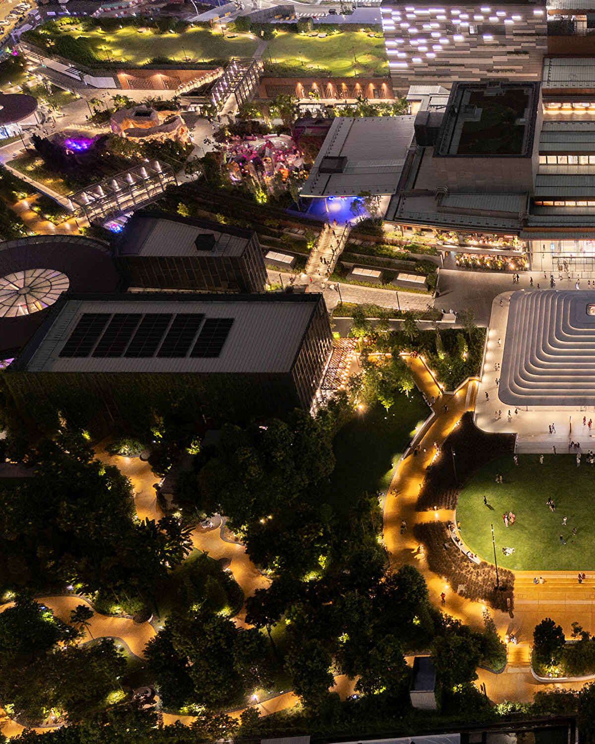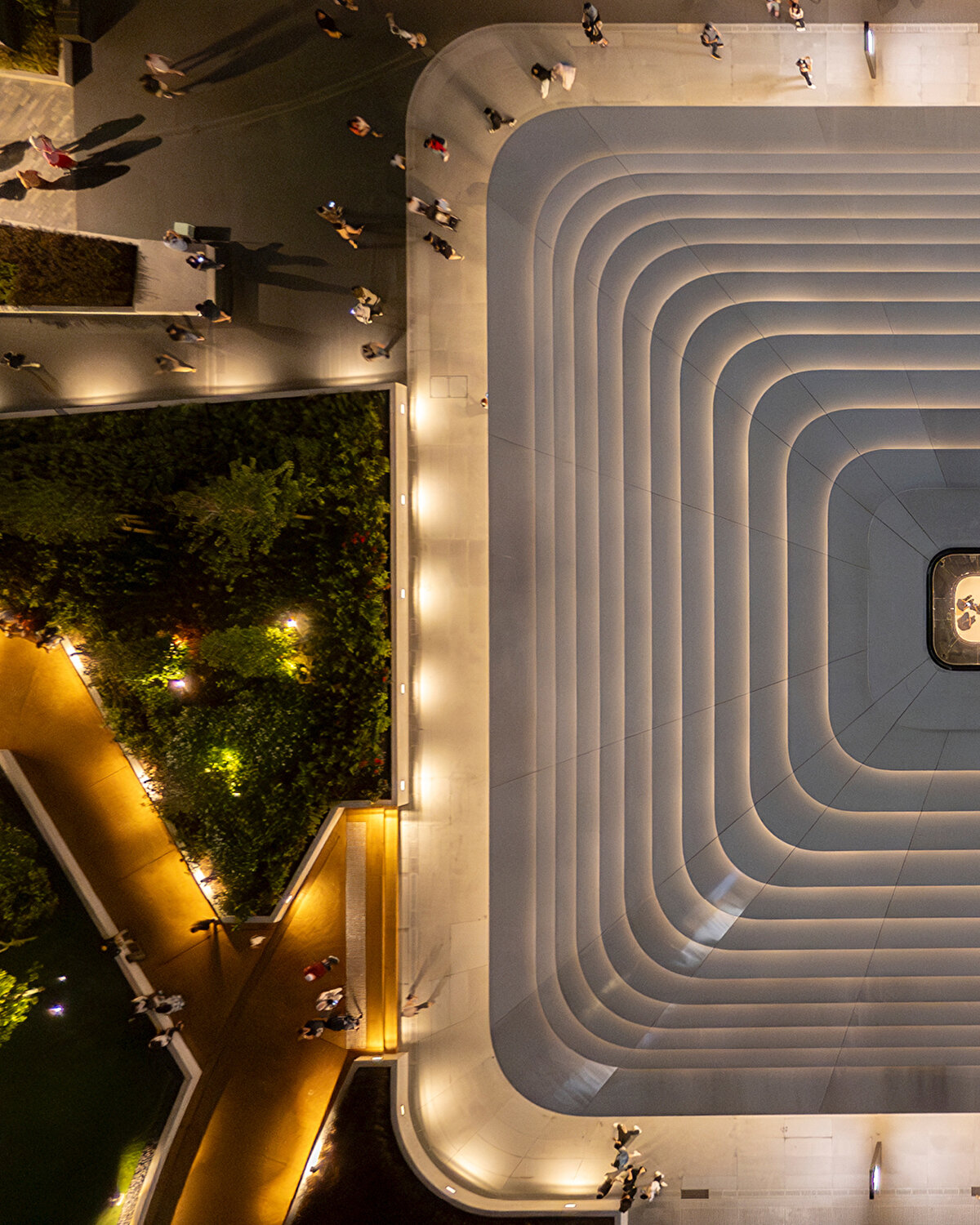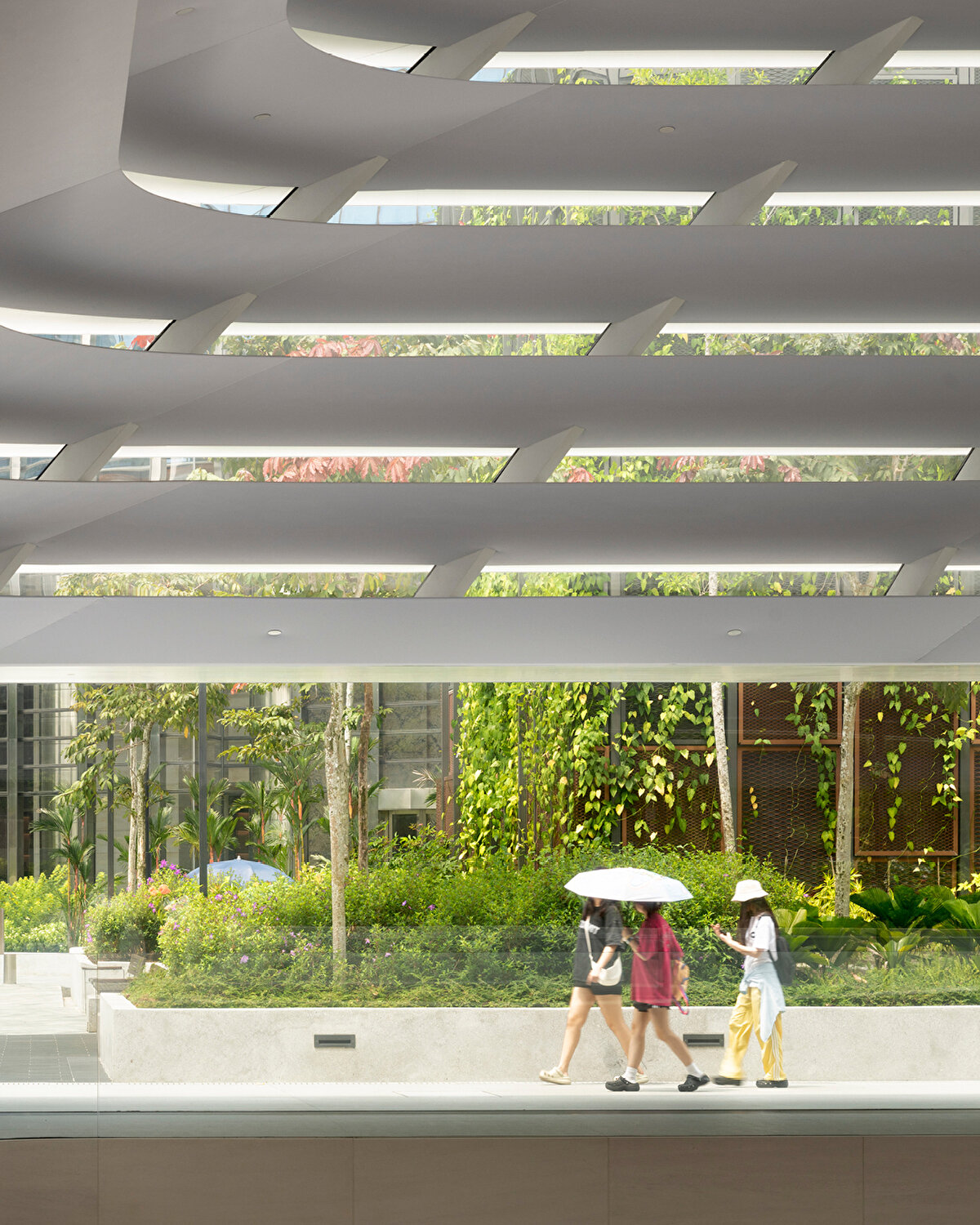 Alt seviyelerde sağlam, üst seviyelerde ise geçirgen bir görünüme sahip olan çatı, tabandan tepeye kadar kare ve yuvarlak geometriler arasında geçiş yapıyor ve Malezya'nın tropikal iklimine uygun olarak güneş radyasyonunu kontrol eden kanatçıklarla gölgeleniyor. %30 seramik frit içeren merkezi camlı göz, iç mekana yumuşak gün ışığı alıyor ve dinamik bir aydınlatma sağlıyor.