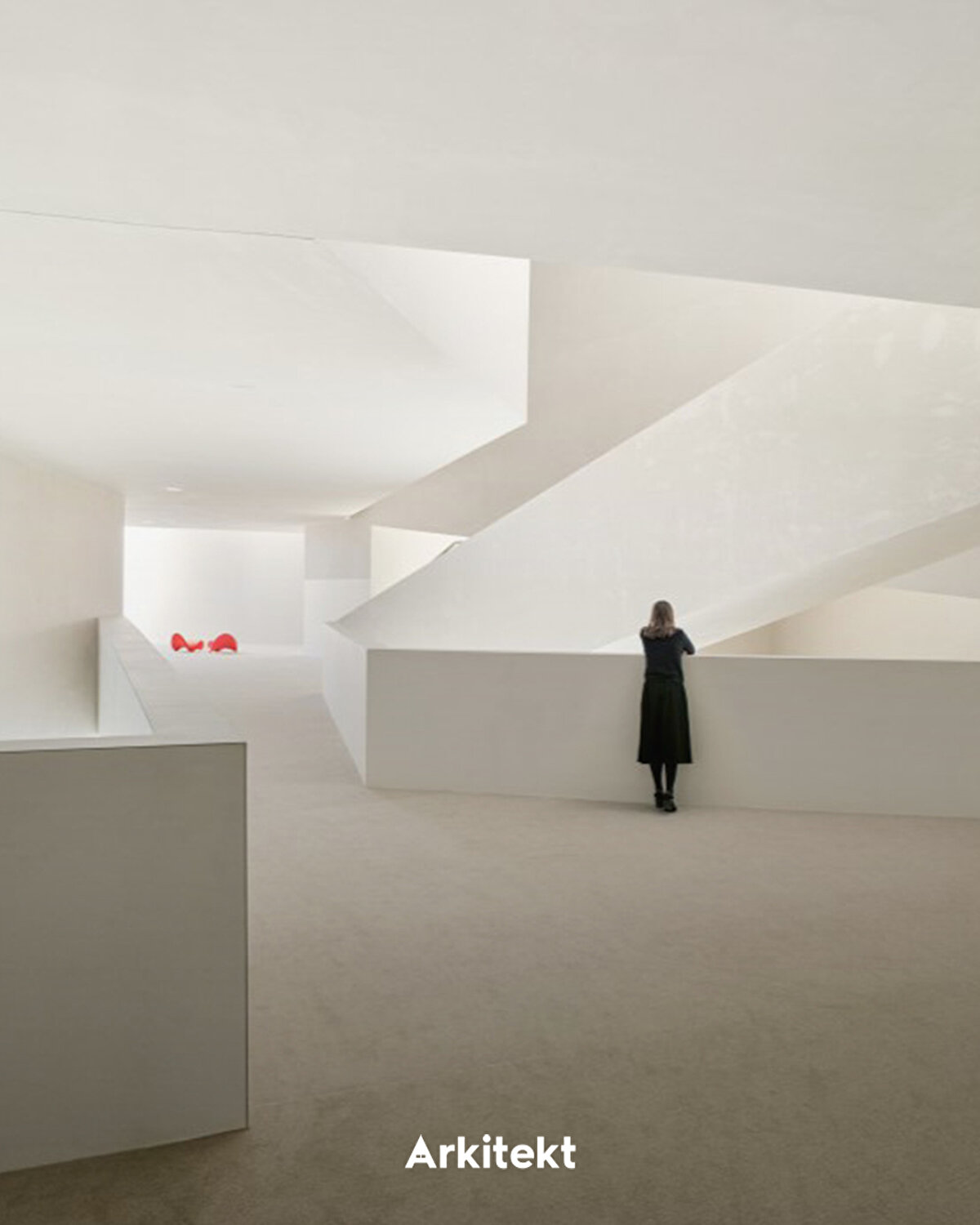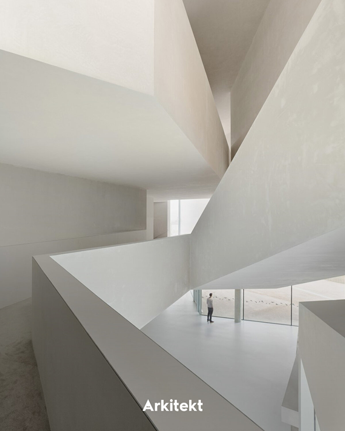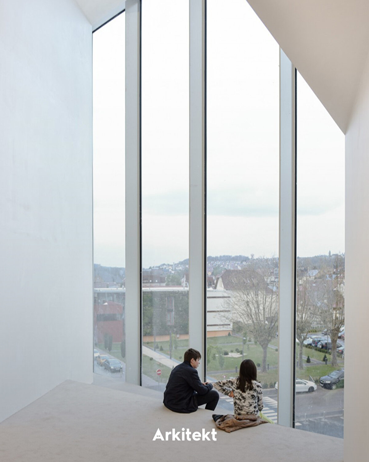 The Théodore Gouvy Theater in France, located in the center of the town of Freyming-Merlebach, forms a new public space alongside the town hall and shopping center. The structure, rising on a plinth, presents the town with a flawless white façade. The foyer, with its transparent surfaces defining the entrance axis, creates a vertical spatial arrangement with its intertwined staircases. The 700-seat auditorium adds intensity to the space with its red, pink, and orange tones. The auditorium offers an optimized viewing angle, with the furthest spectator seated only twenty meters from the front of the stage. Natural light highlights various features while revealing the building's shape and dimensions. Consequently, the path leading to the auditorium takes on a grand and theatrical character.