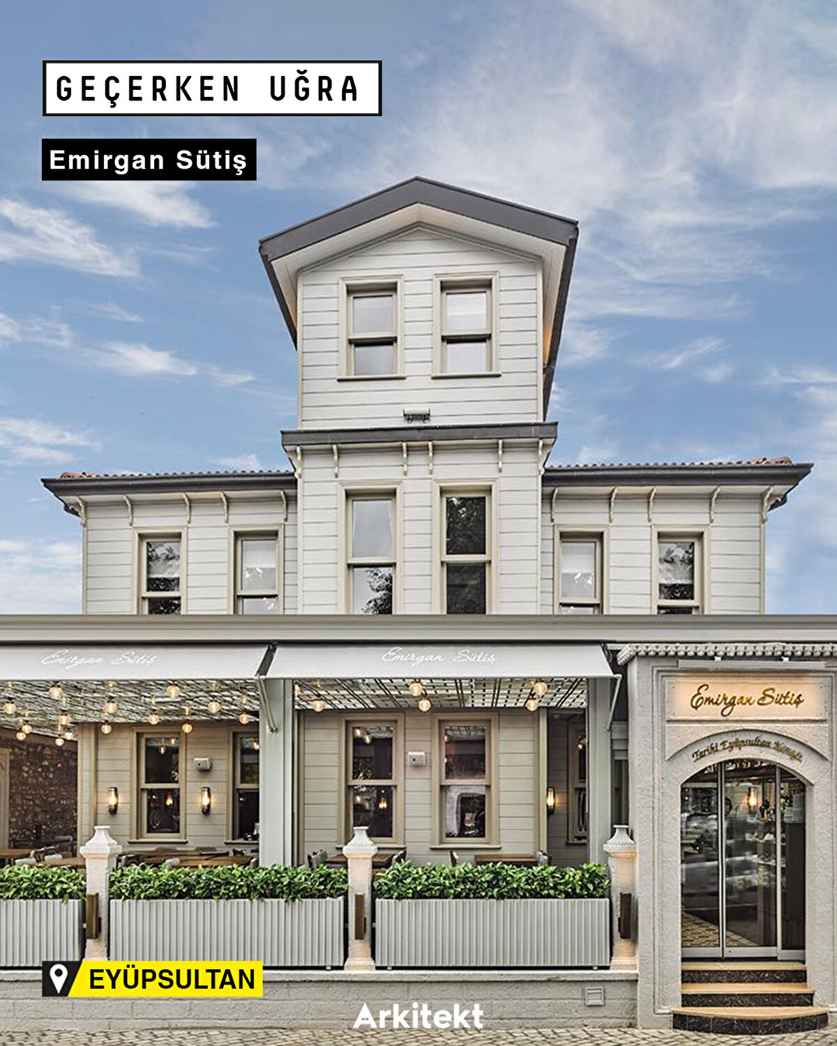 Tarihi Eyüp Sultan Konağı'nda yer alan Emirgân Sütiş, tarihi yapısı ve geleneksel dokusu korunarak modern mimariyle bir araya getirildi. Mekânda bulunan tüm mobilya, aydınlatmalar ve objeler mekâna özgü tasarlanıyor.