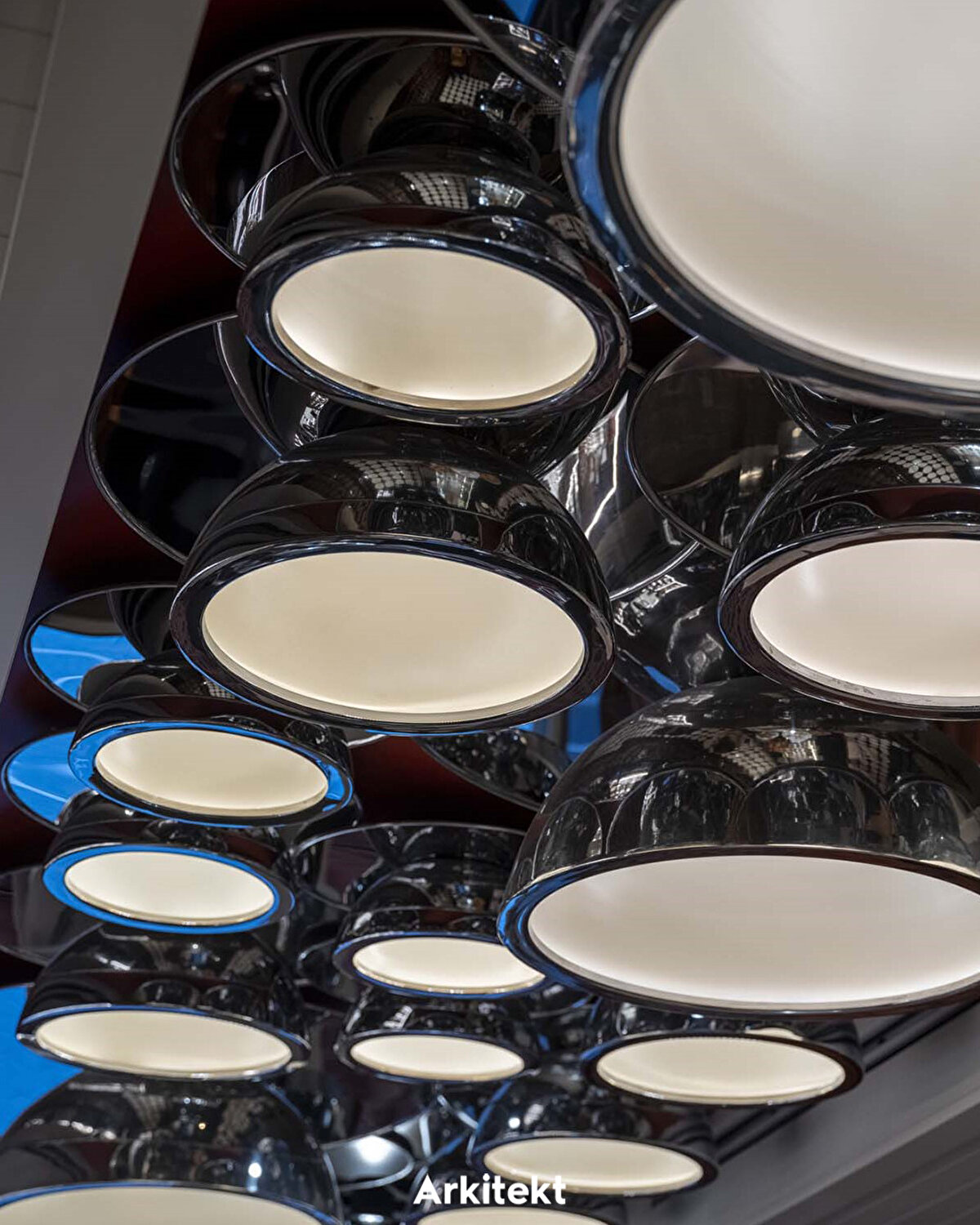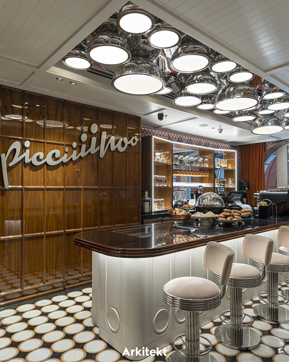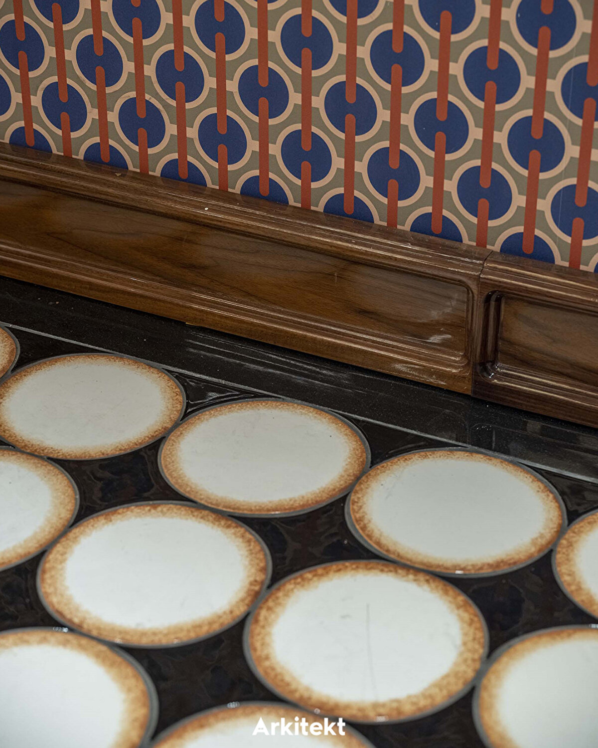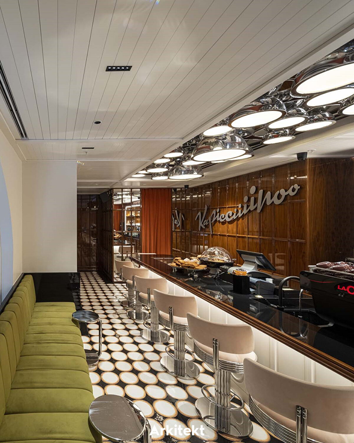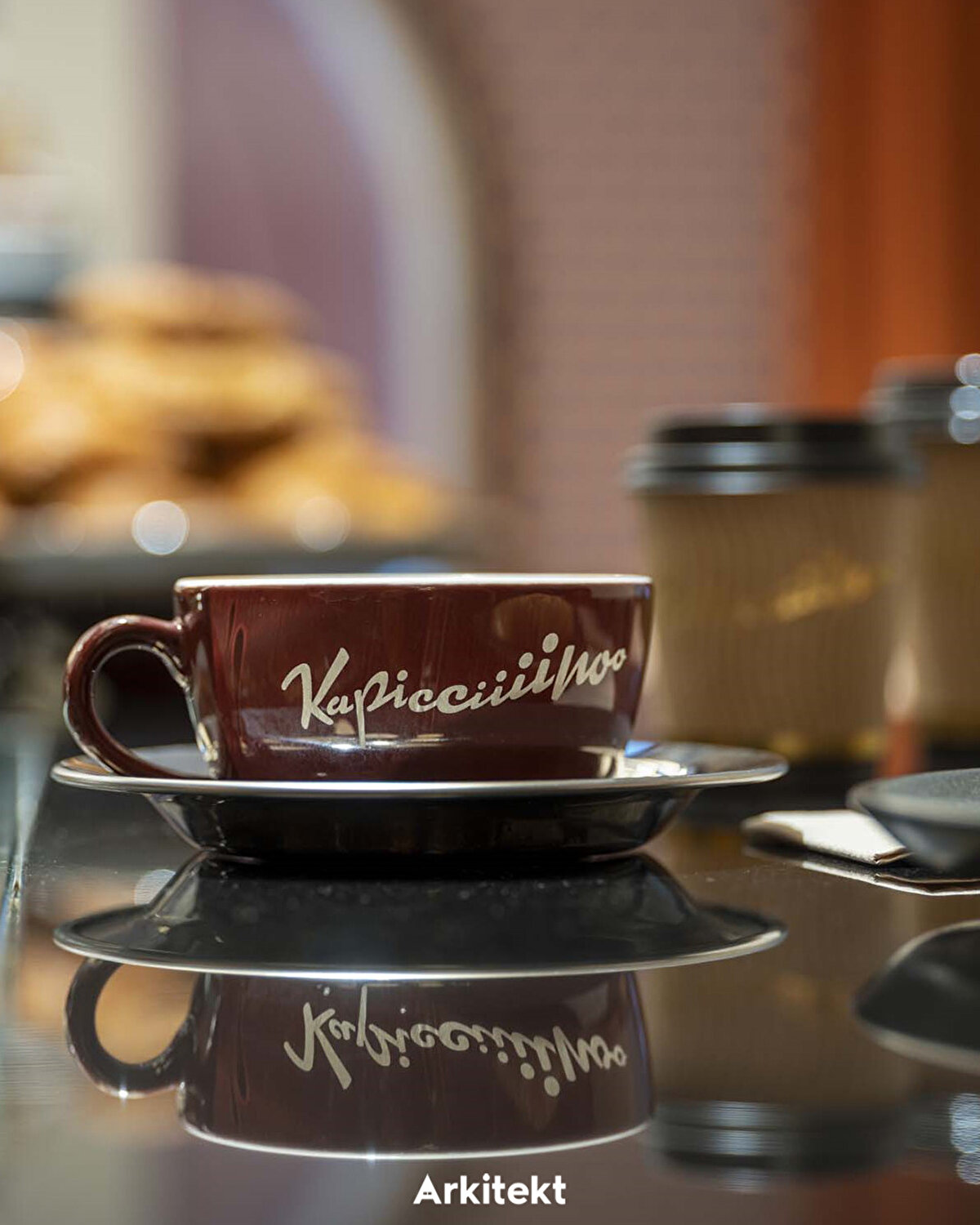 Tasarımda her detay kahve temasıyla bağlantılı: Duvar kağıtlarındaki desenler, kahve çekirdeklerinden ilham alıyor. Yer karoları, kahve sütü köpüğünü anımsatıyor. Tavan aydınlatmaları ise kahve fincanını çağrıştırıyor.