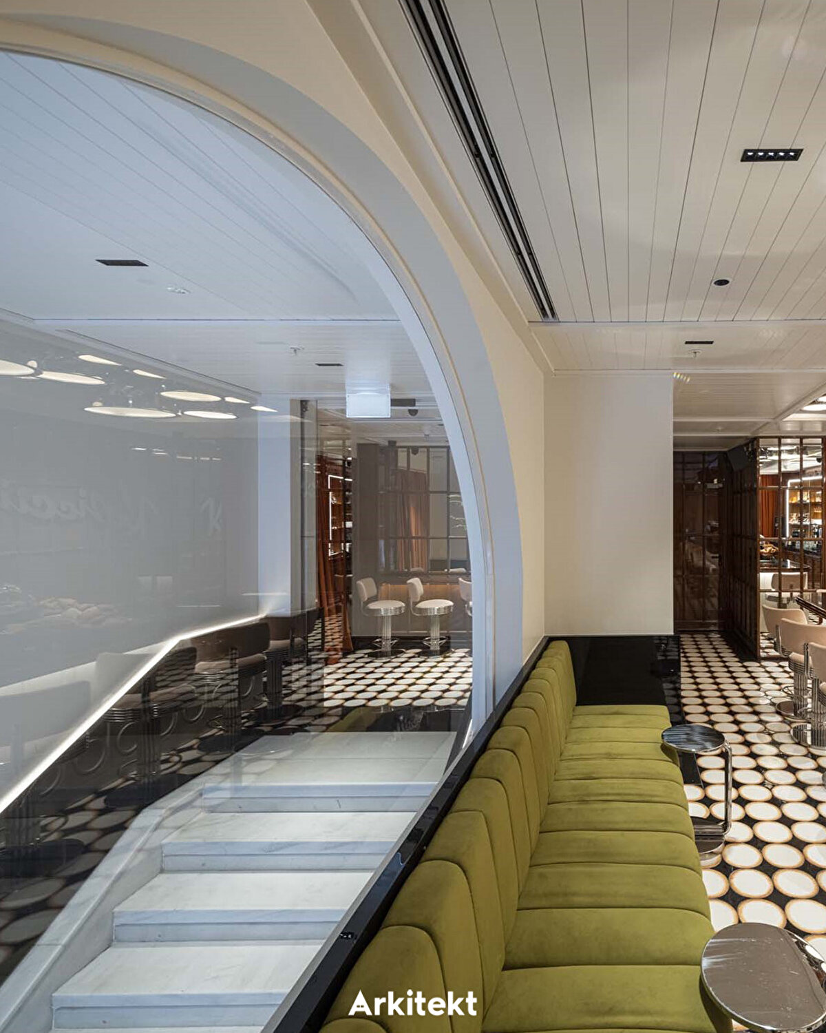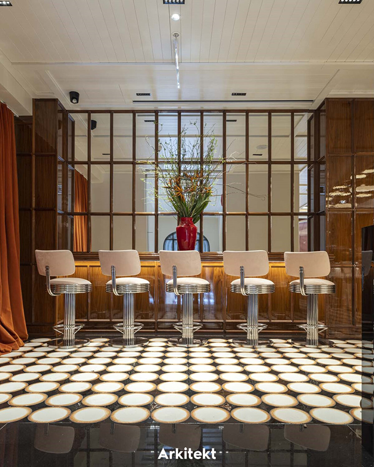 Bu ince detaylar, mekânda retro, dinamik ve sıcak bir atmosfer oluşturuyor. Ayrıca, geniş kahve barı hem servis alanı hem de masa olarak kullanılabilecek şekilde tasarlanıyor.