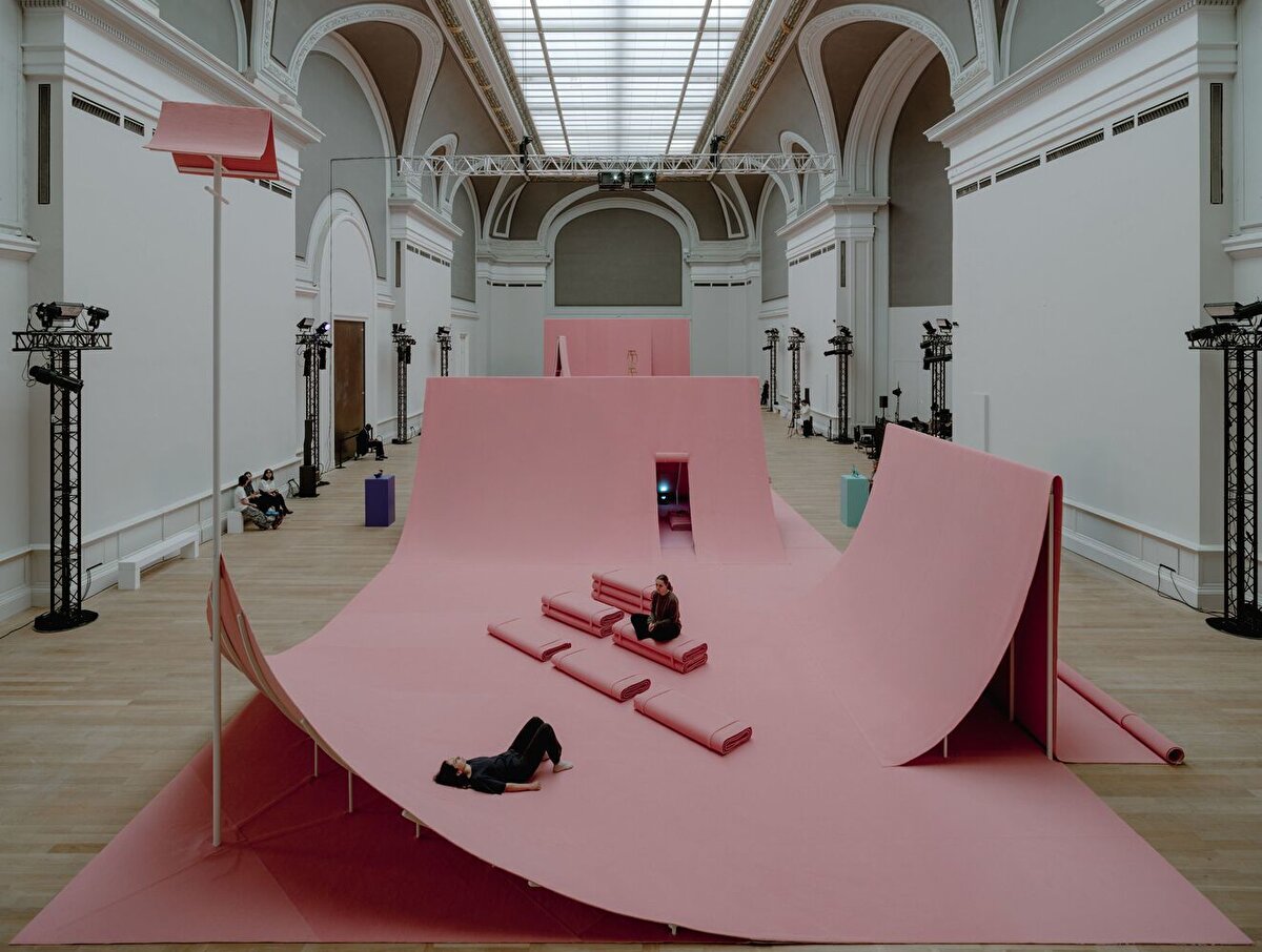 The installation, composed of large textile surfaces, spreads across the space like a giant garment, enveloping users with its folds, pockets, and layers. The soft floor encourages barefoot walking, sitting, lying down, and engaging with the space through everyday actions. Every corner can become a meeting point, a stage, or a refuge; thus, the space evolves into a constantly transforming public structure through collective choreographies. Soft Palace offers a flexible and permeable public experience that invites visitors to be both performers and spectators.