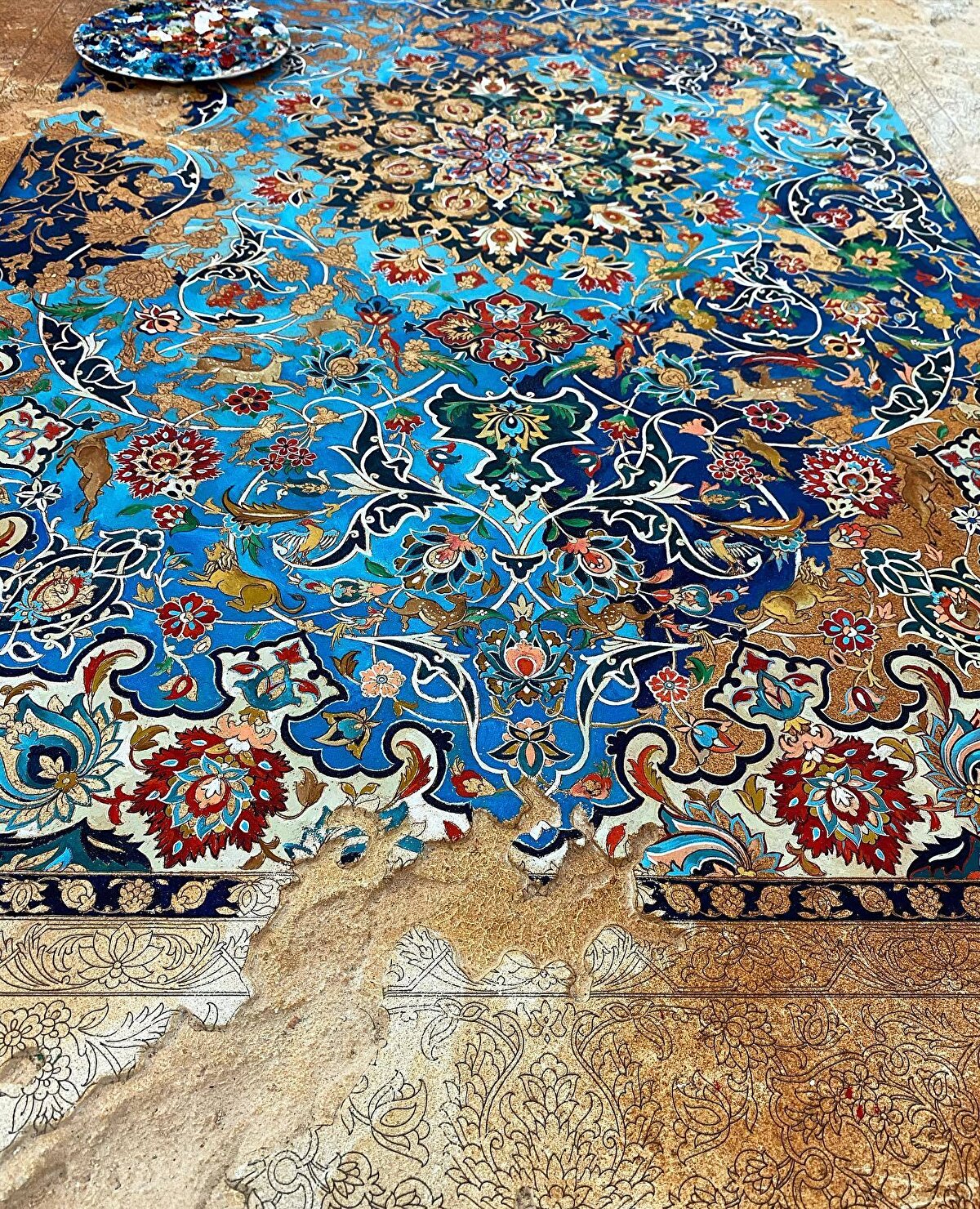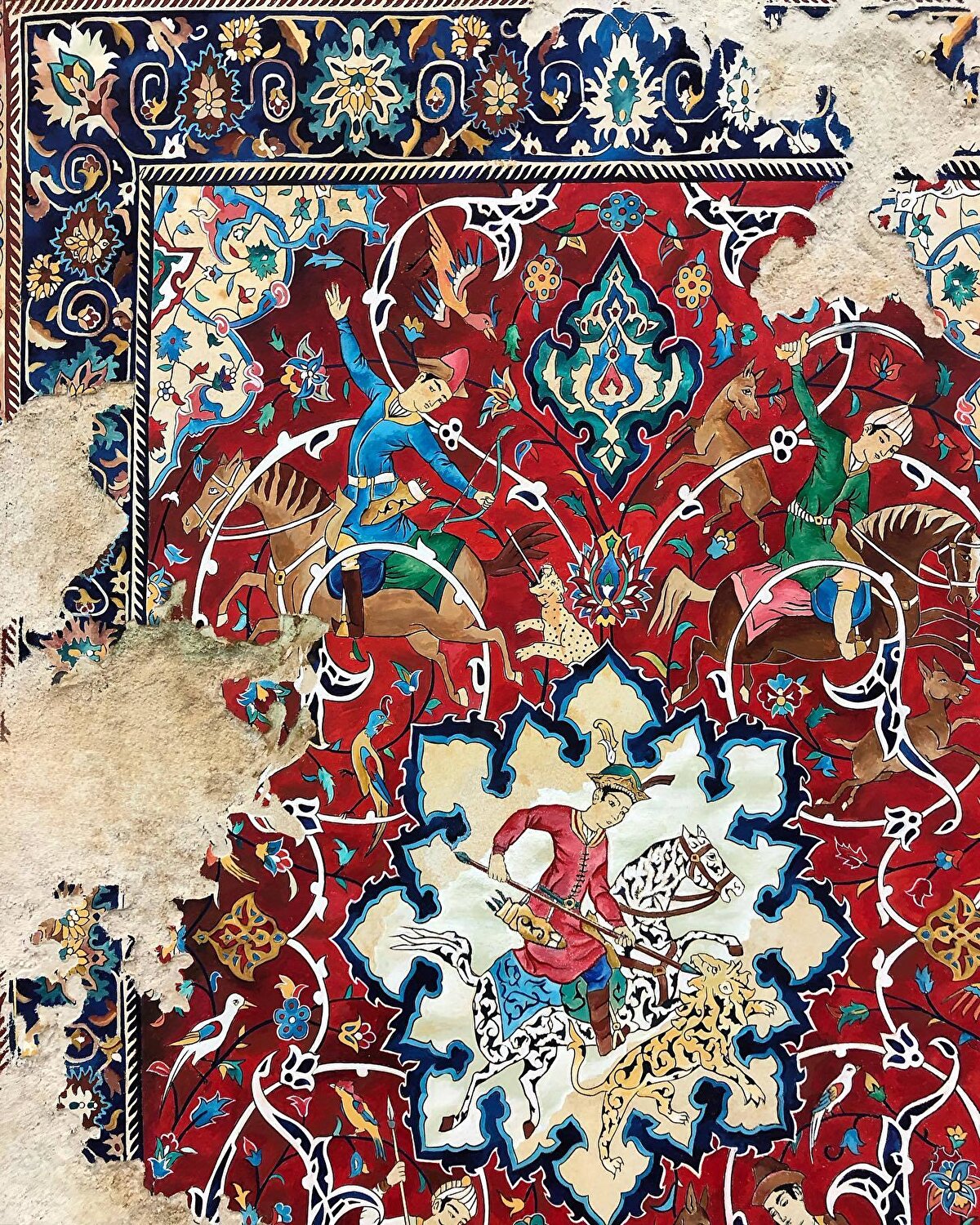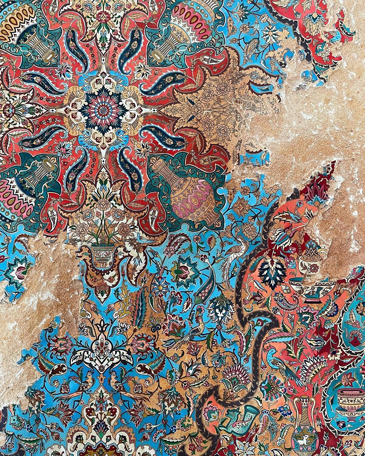 Seife, beton üzerine akrilik boyama tekniği ile mimaride ve geleneksel halılarda kullanılan desenleri farklı boyutlara taşıyor.