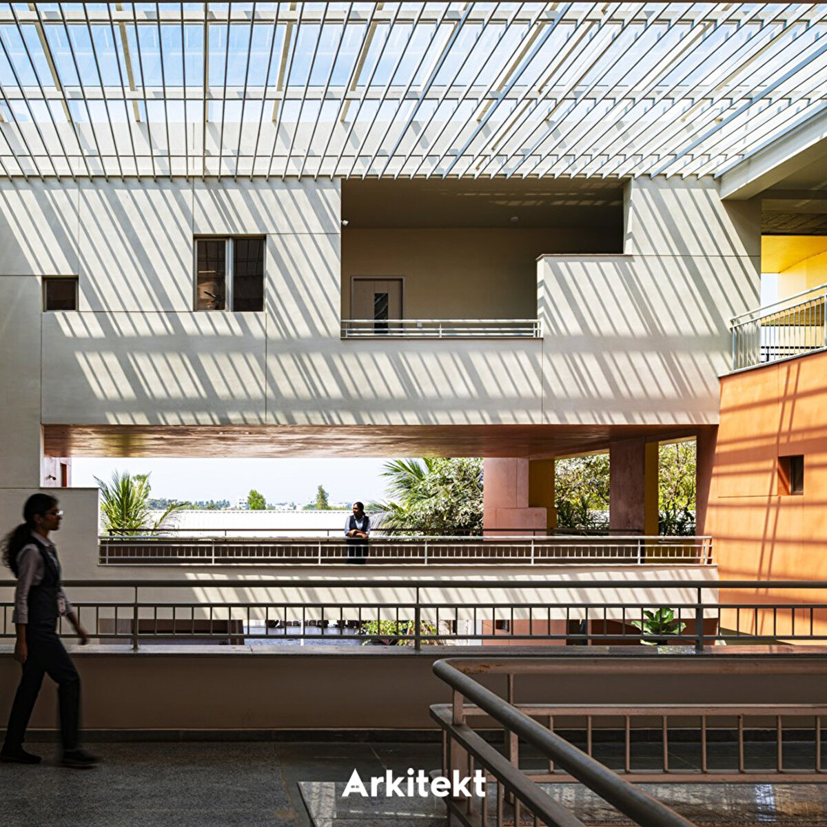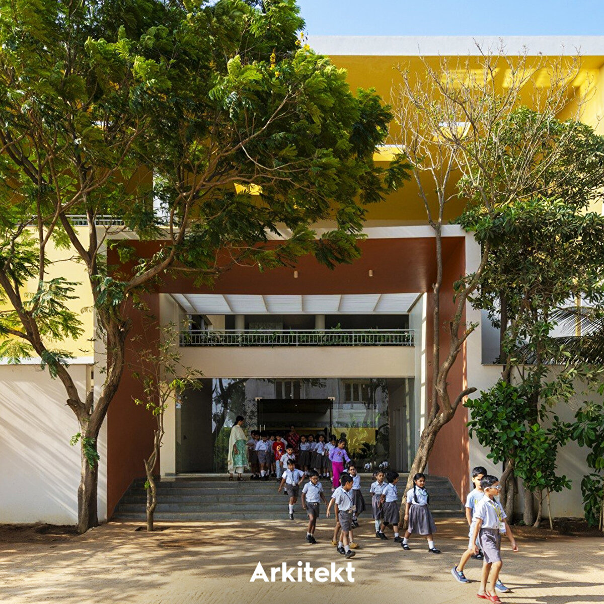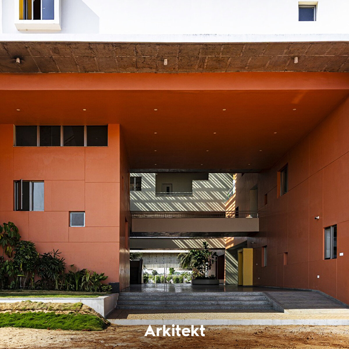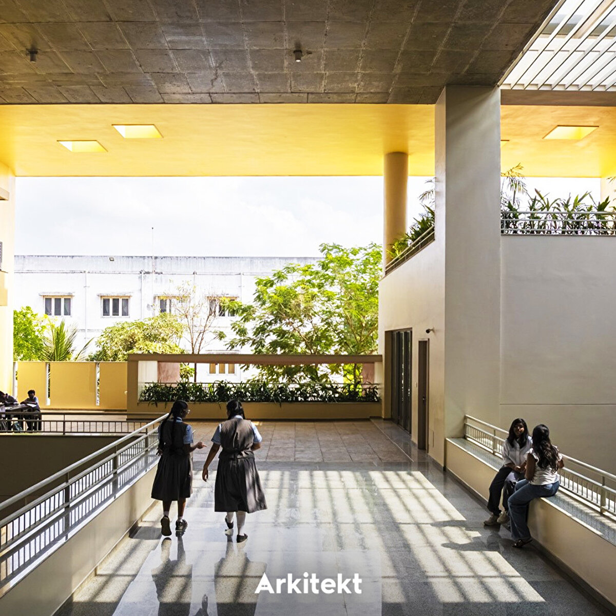 Rainbow International School'un tasarımında, geleneksel gurukul (guru–öğretmen, kul–ev) anlayışındaki açık ve doğaya yakın öğrenme kültürü yeniden yorumlanıyor. Mevcut kampüse eklenen üç katlı yapının uzun cepheleri kuzey-güneye açılarak ısı kazanımını azaltıyor. Merkezi üç kat yüksekliğindeki iç boşluk, kuzey ve güney kanatları ayırıyor ve farklı kotlardaki köprülerle birbirine bağlıyor. Işıklıklar gün ışığını içeri alarak tropik bitkilerle bütünleşen bir iç mekân oluşturuyor. Güney kanat kademeli çözümlenerek alt katları güneşten koruyor. Zemin kattaki sınıflar gölgeli avlulara açılıyor; üst katlarda ise sınıflar doğu veya batıya yönelerek ortak avlularla ilişki kuruyor. Sirkülasyon hattı boyunca planlanan açık ve yarı açık alanlar, sınıf dışı öğrenme birimlerini birbirine bağlıyor. - The design of Rainbow International School reinterprets the open and nature-oriented learning culture of the traditional gurukul (guru–teacher, kul–home) system. The three-story extension added to the existing campus positions its long façades towards the north and south to reduce heat gain. A central three-story atrium separates the north and south wings and connects them through bridges at different levels. Skylights bring natural light into the interior, creating a space that integrates with tropical vegetation. The south wing is designed with staggered volumes to shield the lower floors from direct sunlight. Ground-floor classrooms open onto shaded courtyards, while those on the upper floors face east or west and connect with shared courtyards. Open and semi-open areas planned along the circulation route link learning environments beyond the classroom.