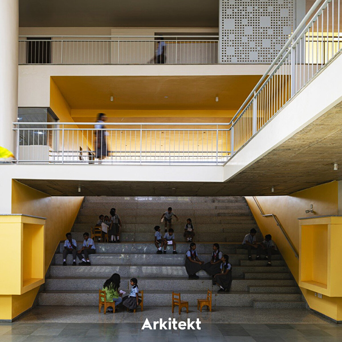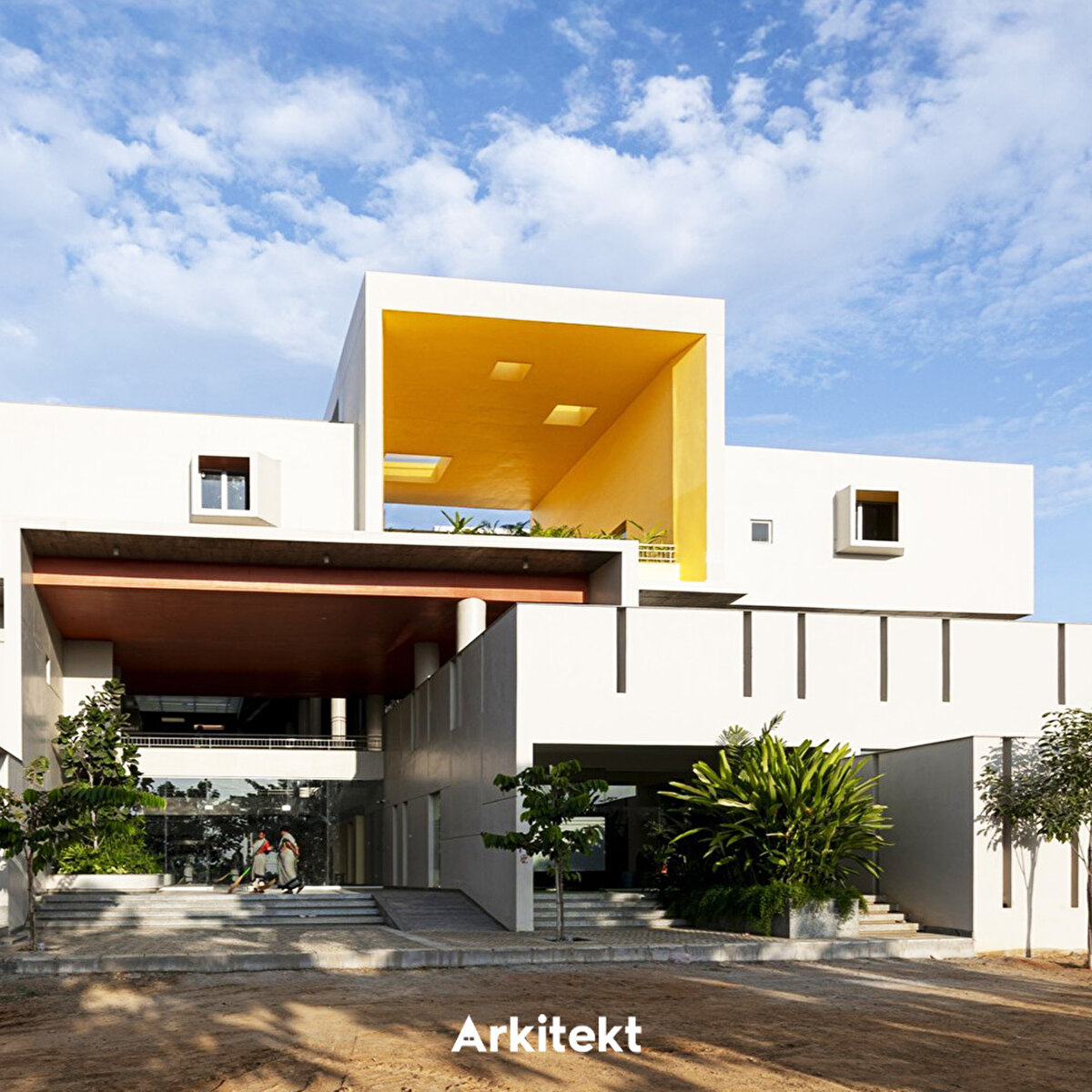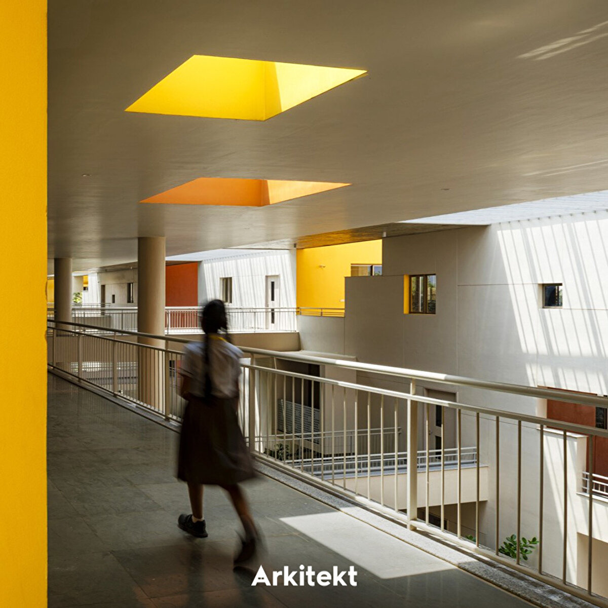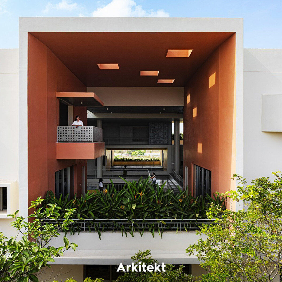 Rainbow International School'un tasarımında, geleneksel gurukul (guru–öğretmen, kul–ev) anlayışındaki açık ve doğaya yakın öğrenme kültürü yeniden yorumlanıyor. Mevcut kampüse eklenen üç katlı yapının uzun cepheleri kuzey-güneye açılarak ısı kazanımını azaltıyor. Merkezi üç kat yüksekliğindeki iç boşluk, kuzey ve güney kanatları ayırıyor ve farklı kotlardaki köprülerle birbirine bağlıyor. Işıklıklar gün ışığını içeri alarak tropik bitkilerle bütünleşen bir iç mekân oluşturuyor. Güney kanat kademeli çözümlenerek alt katları güneşten koruyor. Zemin kattaki sınıflar gölgeli avlulara açılıyor; üst katlarda ise sınıflar doğu veya batıya yönelerek ortak avlularla ilişki kuruyor. Sirkülasyon hattı boyunca planlanan açık ve yarı açık alanlar, sınıf dışı öğrenme birimlerini birbirine bağlıyor. - The design of Rainbow International School reinterprets the open and nature-oriented learning culture of the traditional gurukul (guru–teacher, kul–home) system. The three-story extension added to the existing campus positions its long façades towards the north and south to reduce heat gain. A central three-story atrium separates the north and south wings and connects them through bridges at different levels. Skylights bring natural light into the interior, creating a space that integrates with tropical vegetation. The south wing is designed with staggered volumes to shield the lower floors from direct sunlight. Ground-floor classrooms open onto shaded courtyards, while those on the upper floors face east or west and connect with shared courtyards. Open and semi-open areas planned along the circulation route link learning environments beyond the classroom.