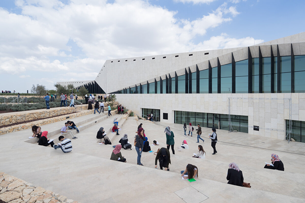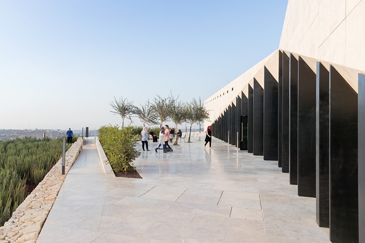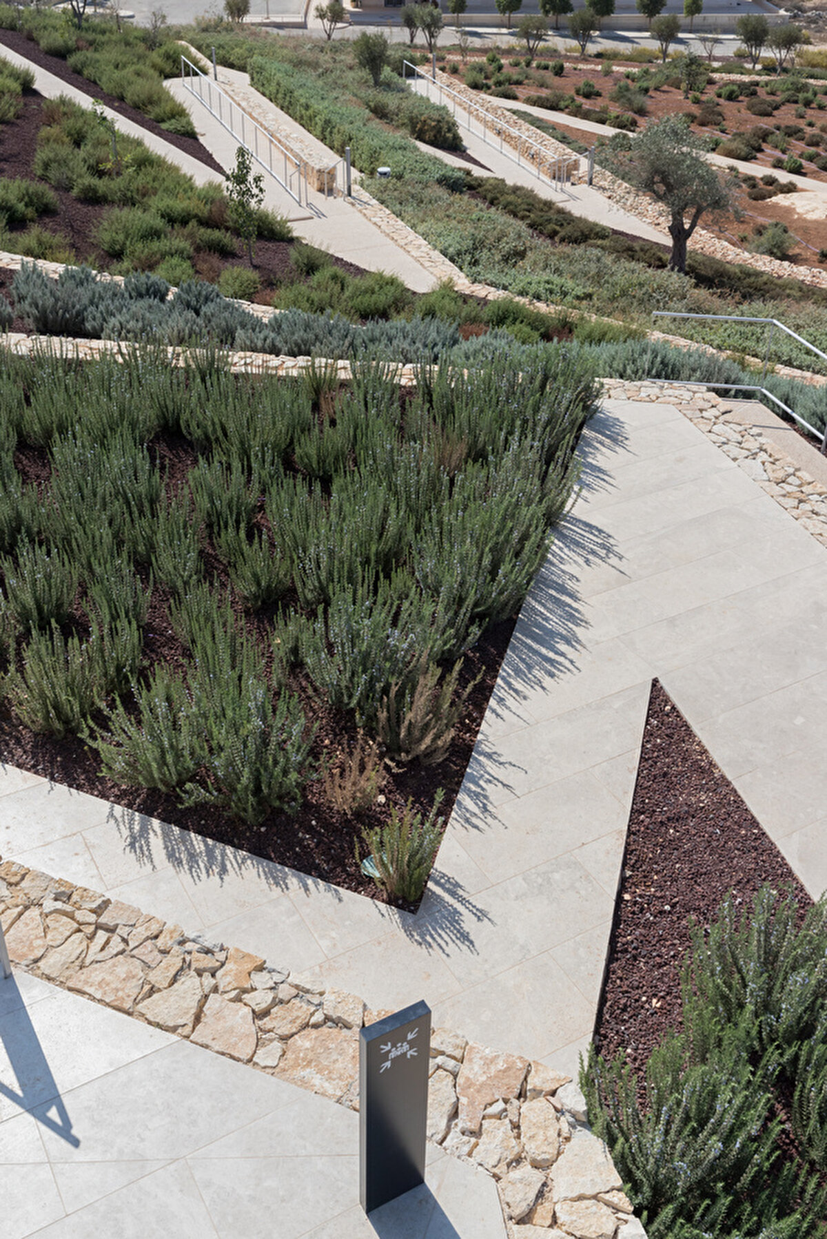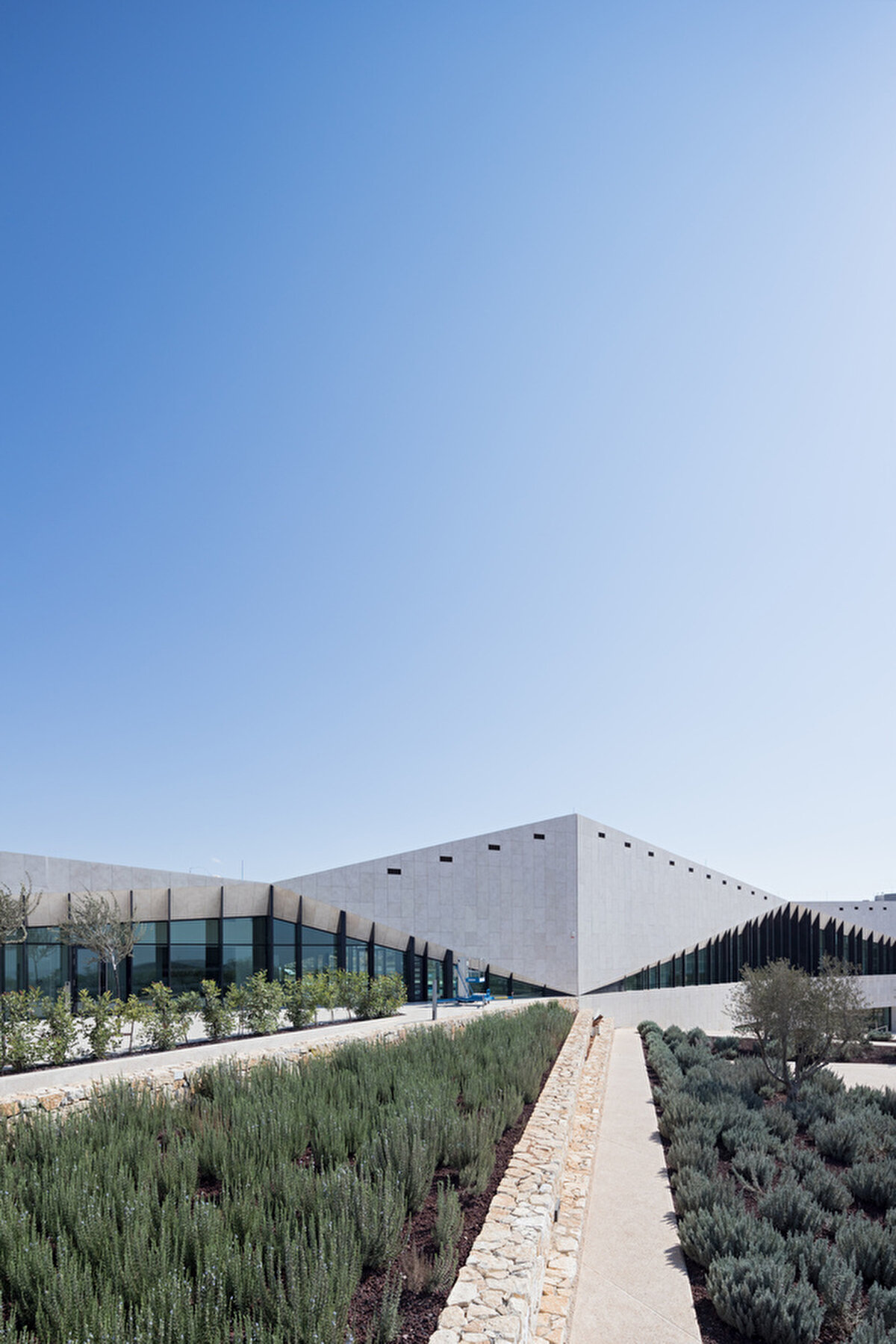 Açılı geometrik cephede yerel kireçtaşı kullanıyor ve yapı, doğal topografyanın devamı gibi geliştiriliyor. Eğimli topoğrafyayı takip eden bir dizi teras bitkilendirilerek bölgenin verimli topraklarına atıfta bulunuyor. Yerel bitkiler, bölgenin tarihi ticari bağlantılarını vurgulamak için çeşitli türlerle bir arada ekiliyor.