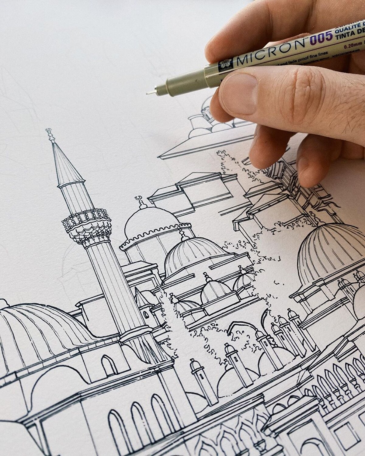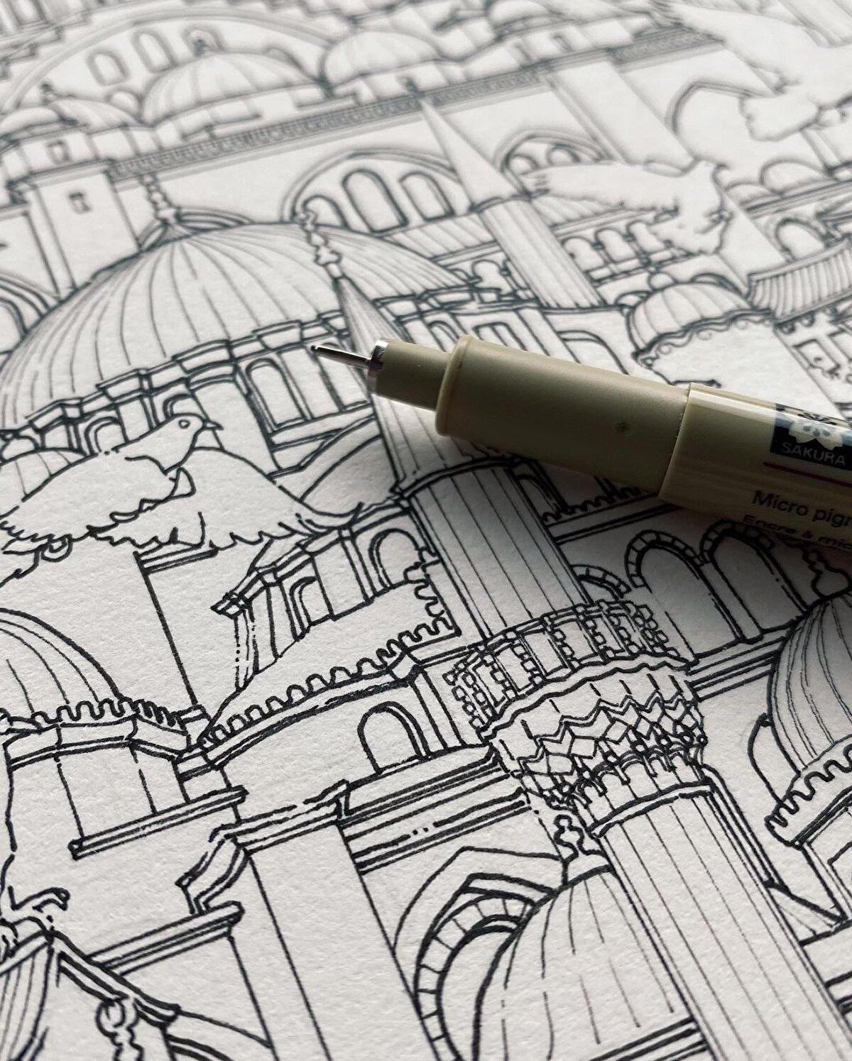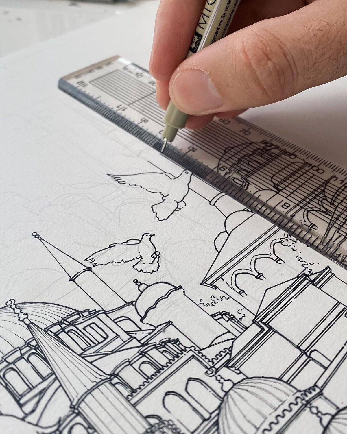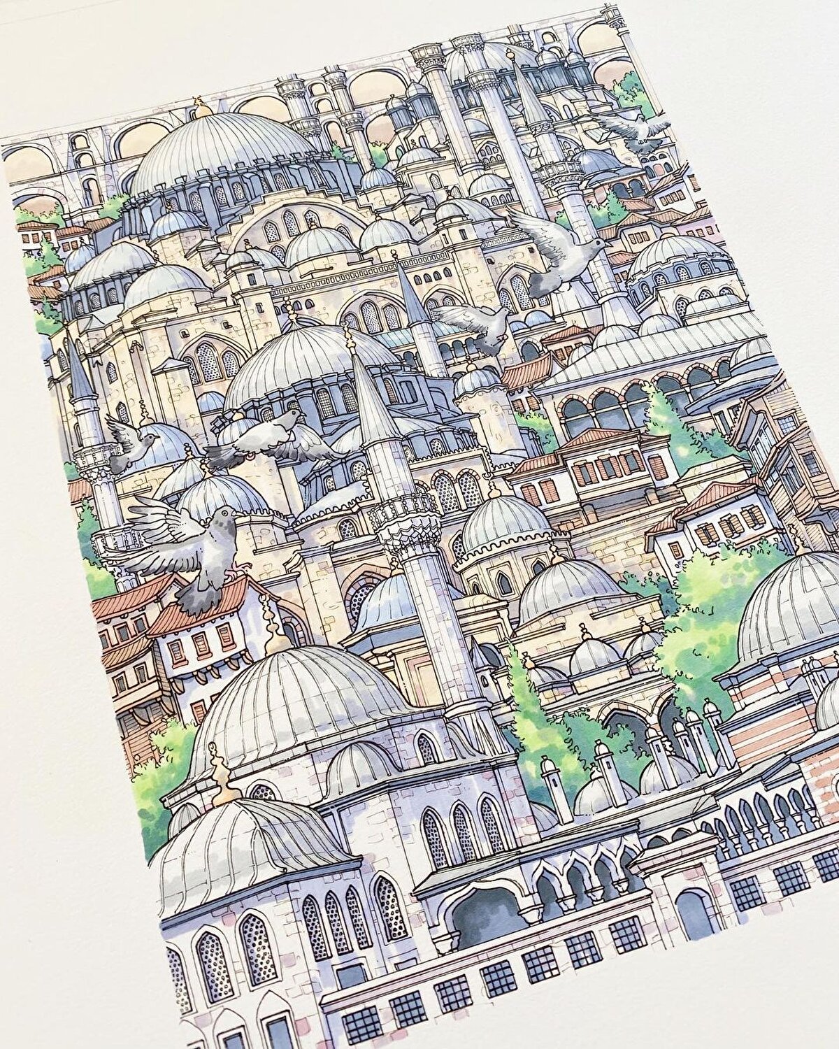 Sanatçı, 2015 yılından bu yana yaptığı gezilerinde şehirlerin küçük çizimlerini oluşturarak Avrupa seyahatlerini belgeliyor.
