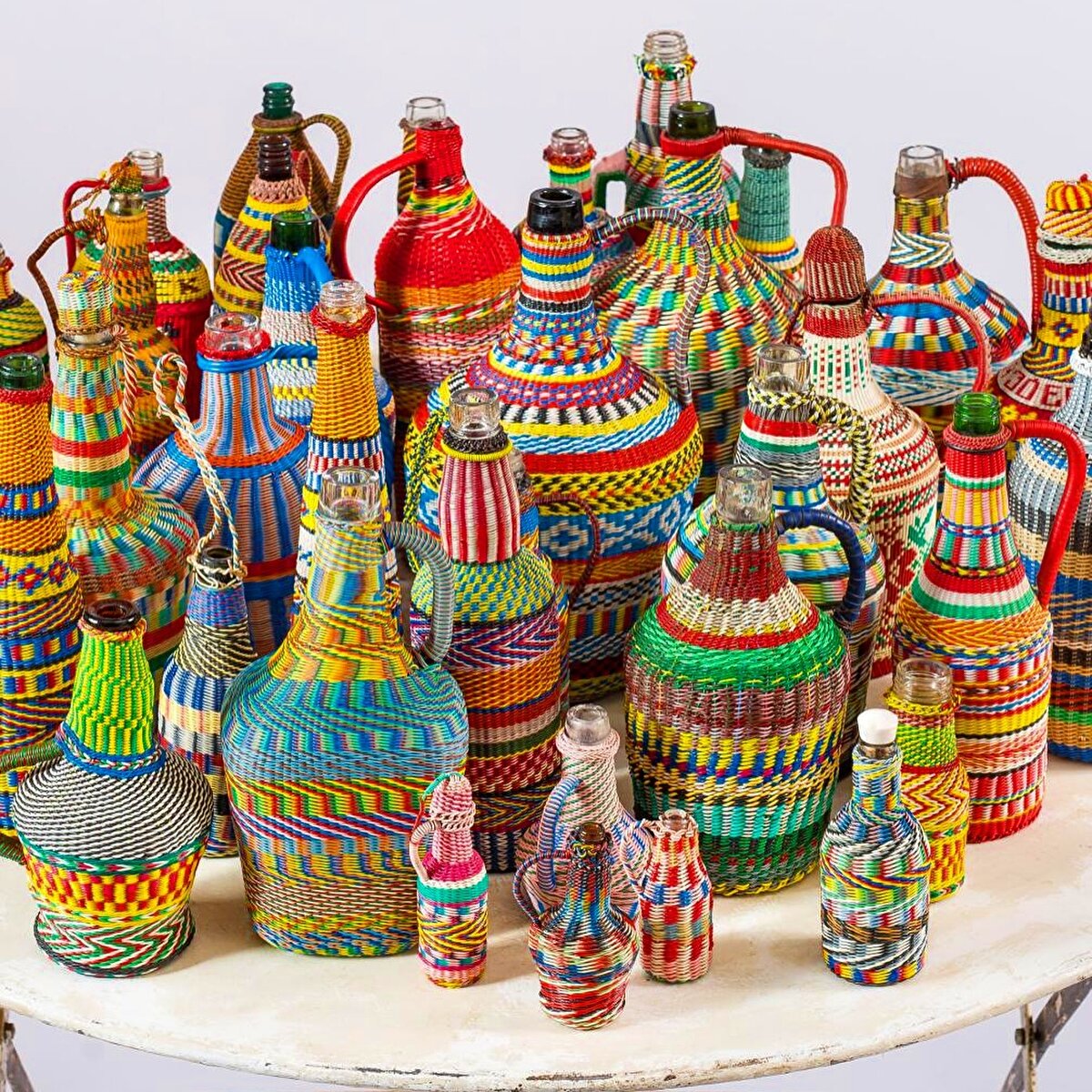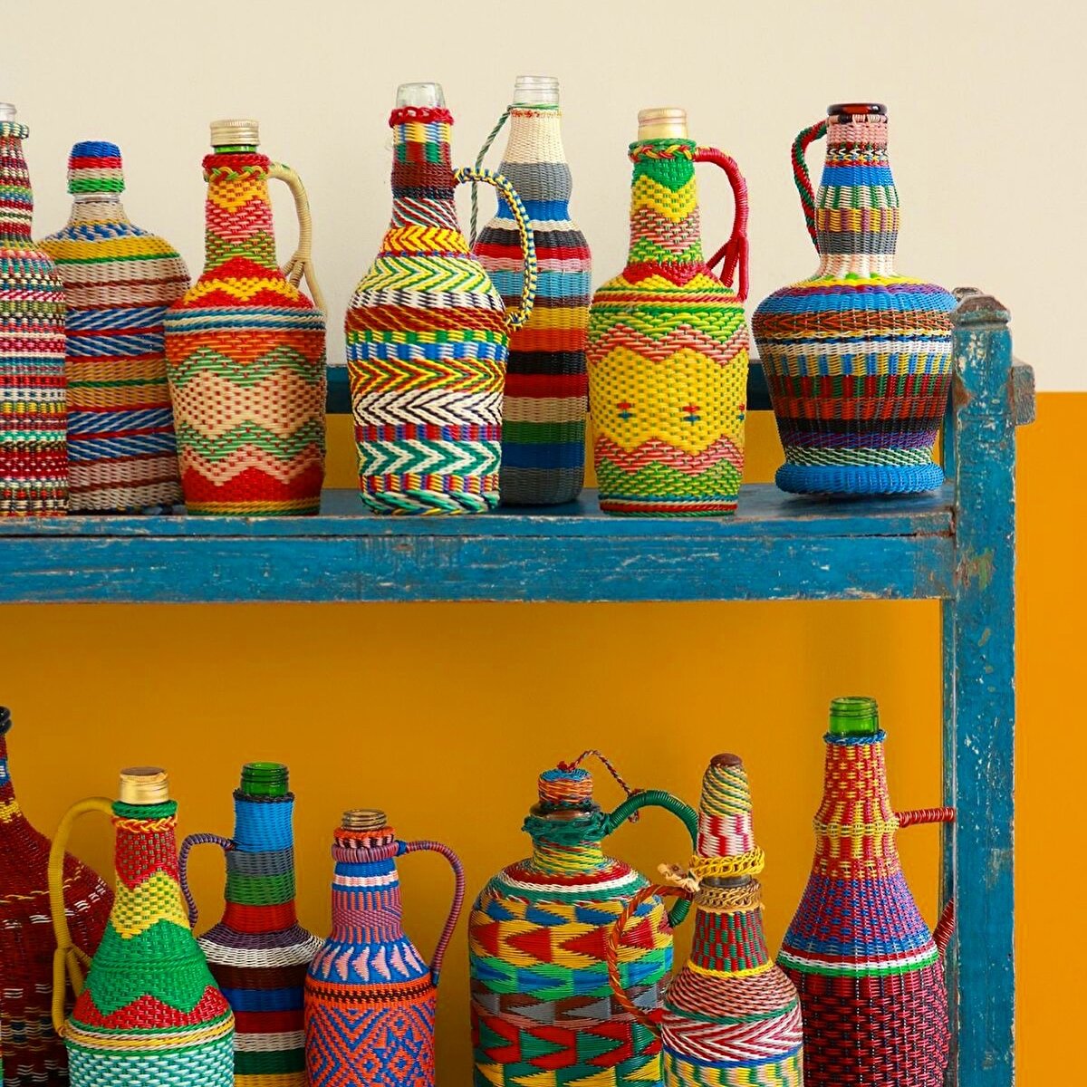 @refoundobjects 'in "Miners Bottle" isimli serisi cam şişelere el dokuması desenlerin örülmesiyle oluşturuluyor.