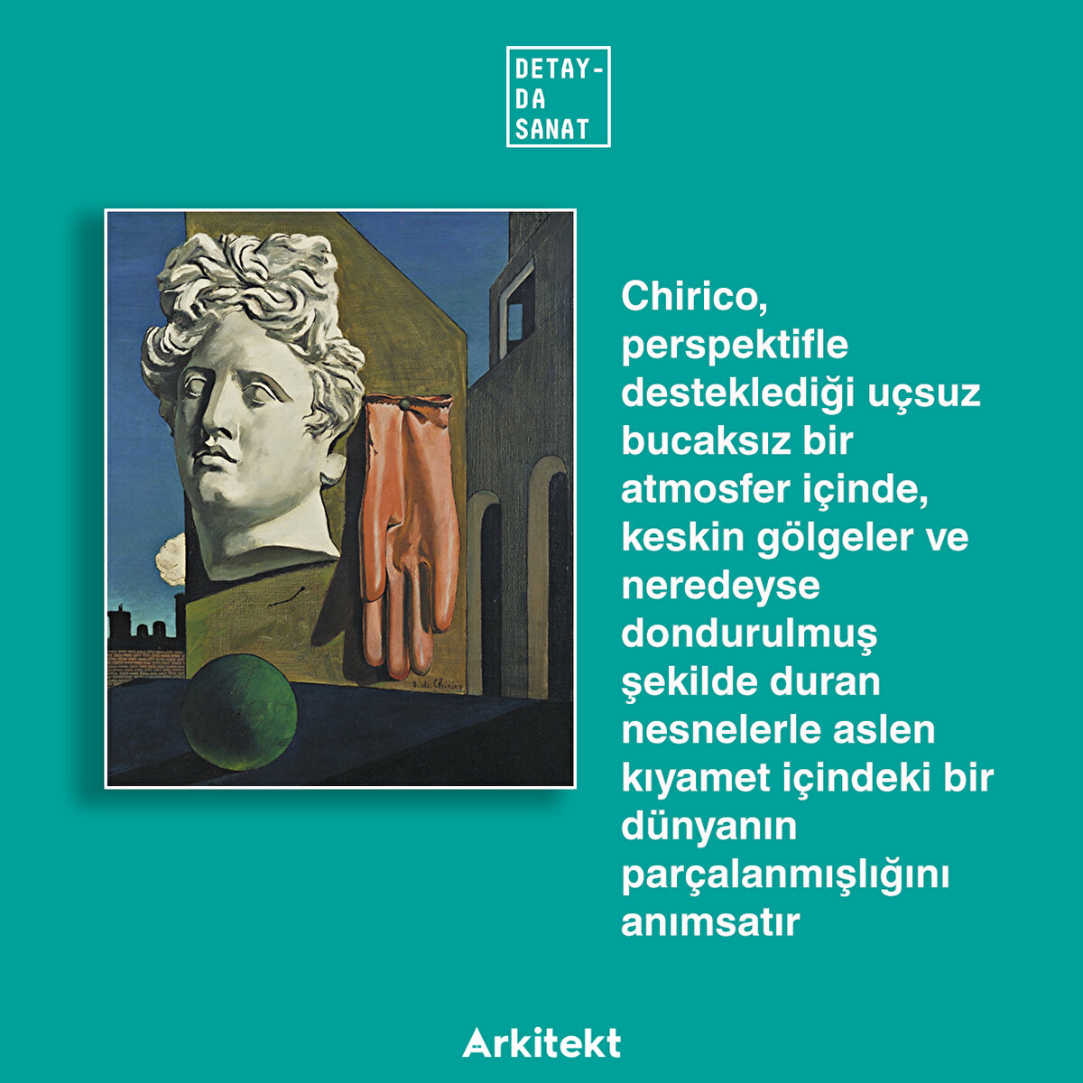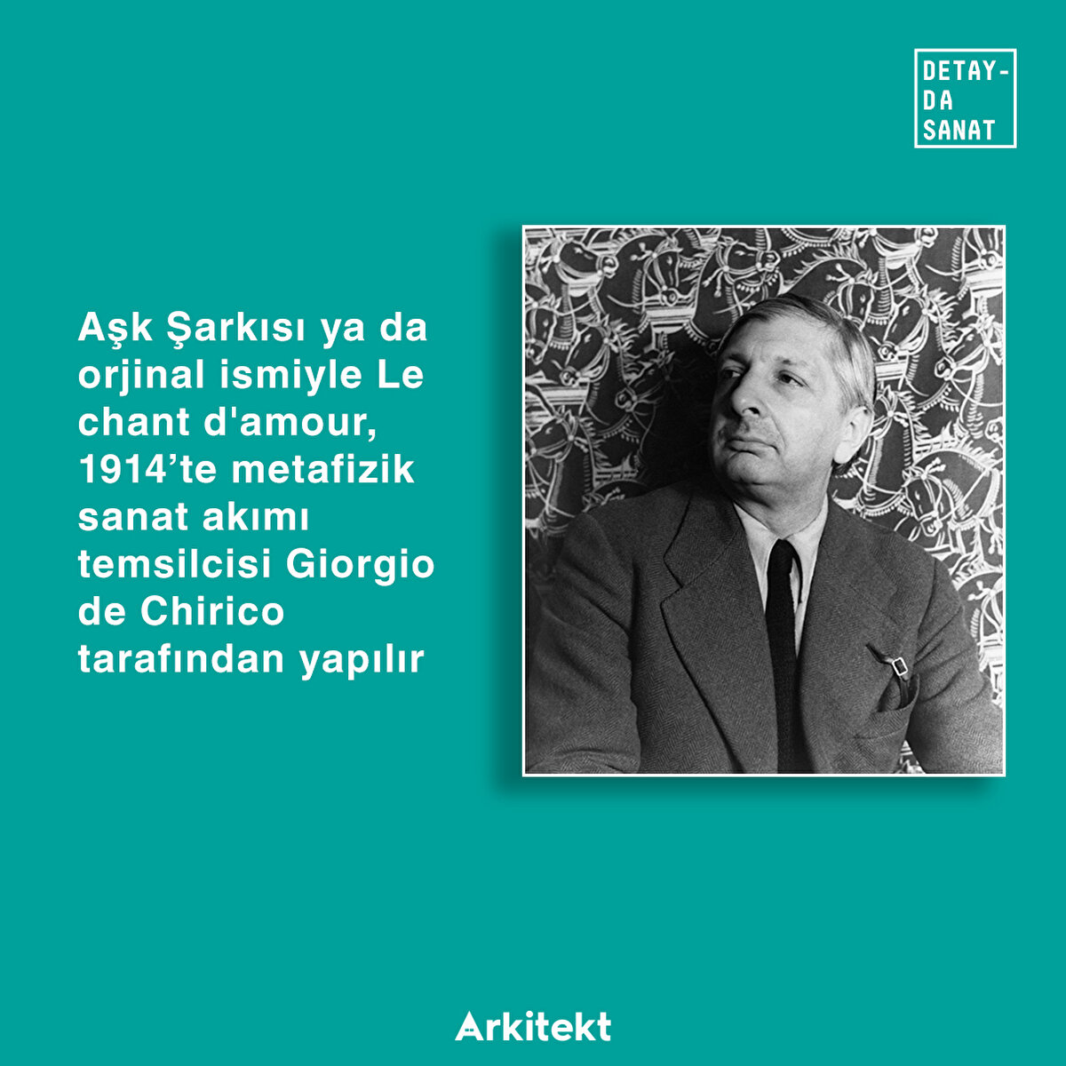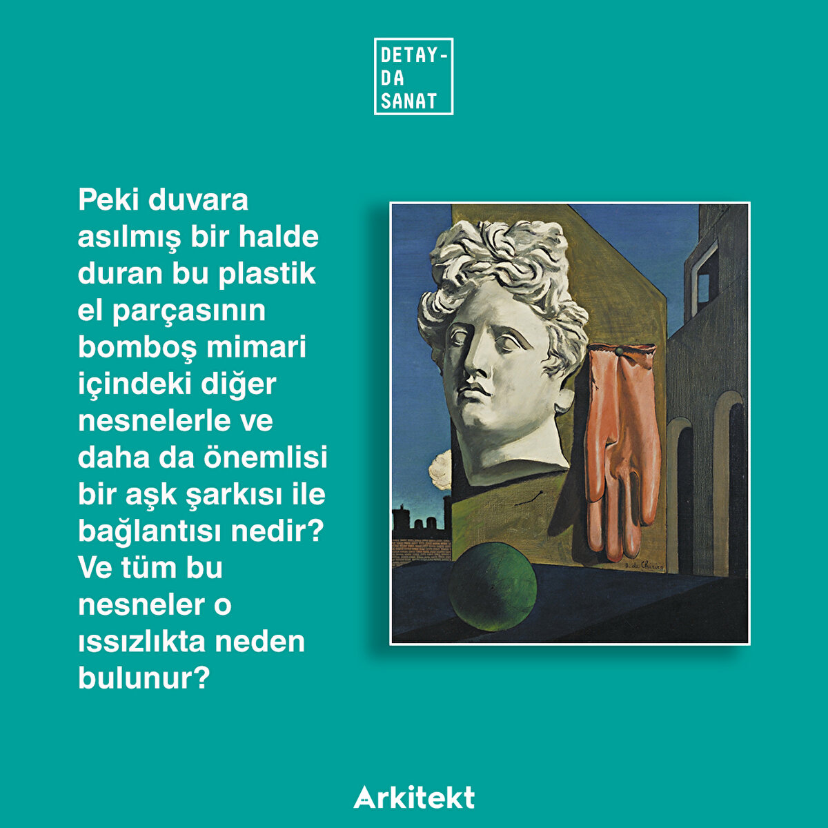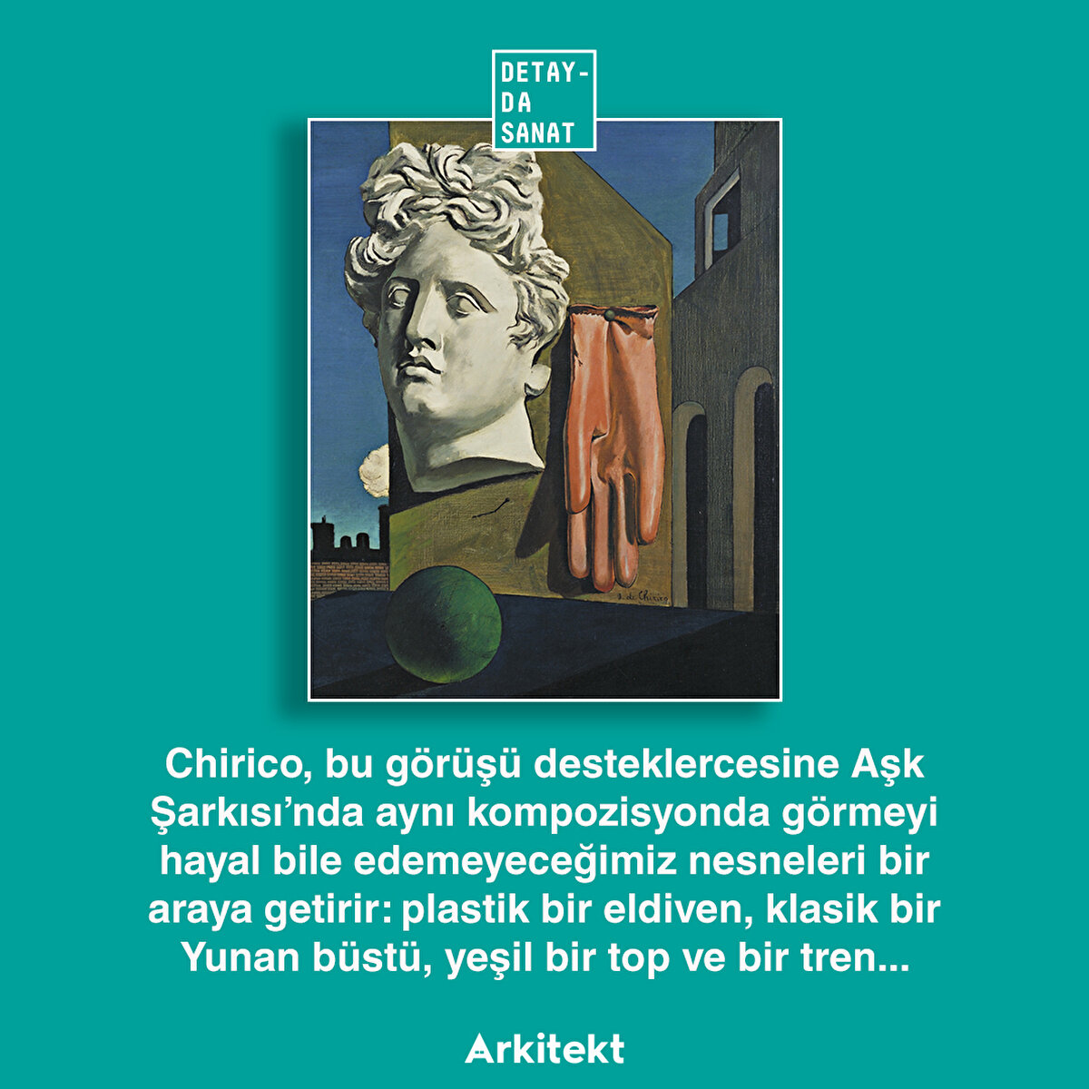 Geleceğin sanatını, işaret noktası olarak, bir simgeyi, bir olguyu ya da düşünceyi ifade etmek için insanı bütünüyle ortadan kaldıran bir sanat şeklinde tanımlayan ve Breton'un ondan on yıl sonra başlatacağı sürrealist akımın öncüsü kabul edilen Giorgio di Chirico bu hafta Aşk Şarkısı ile Detayda Sanat'ta!