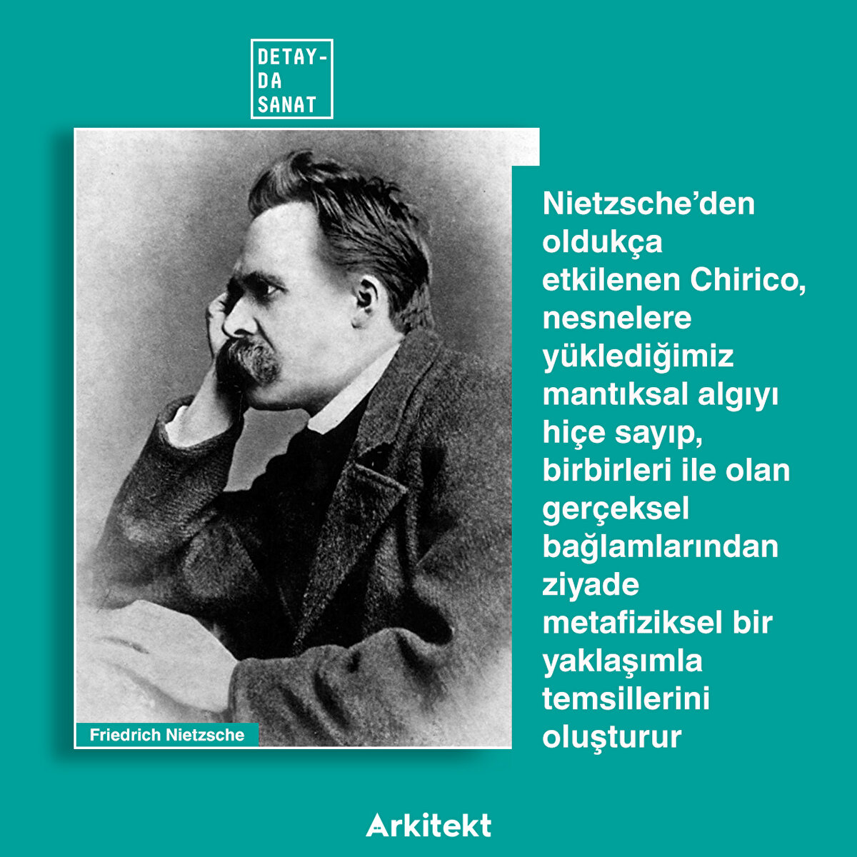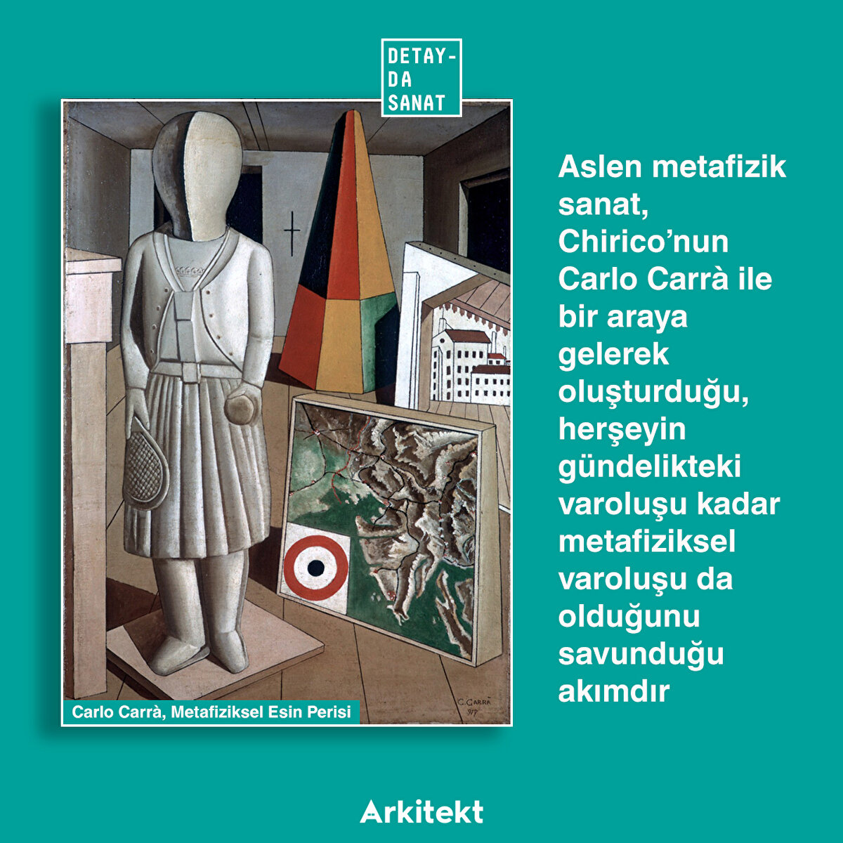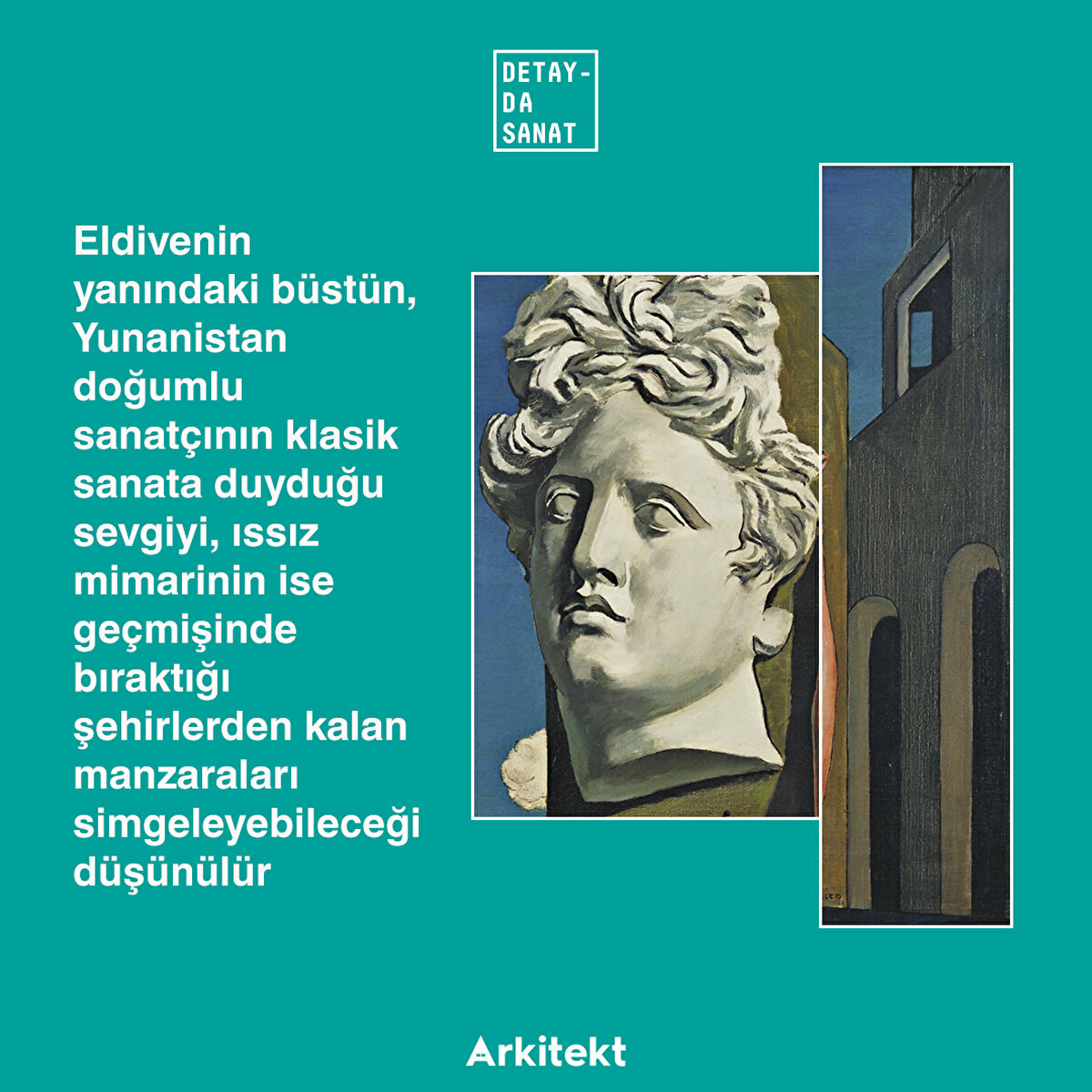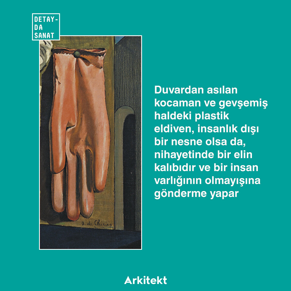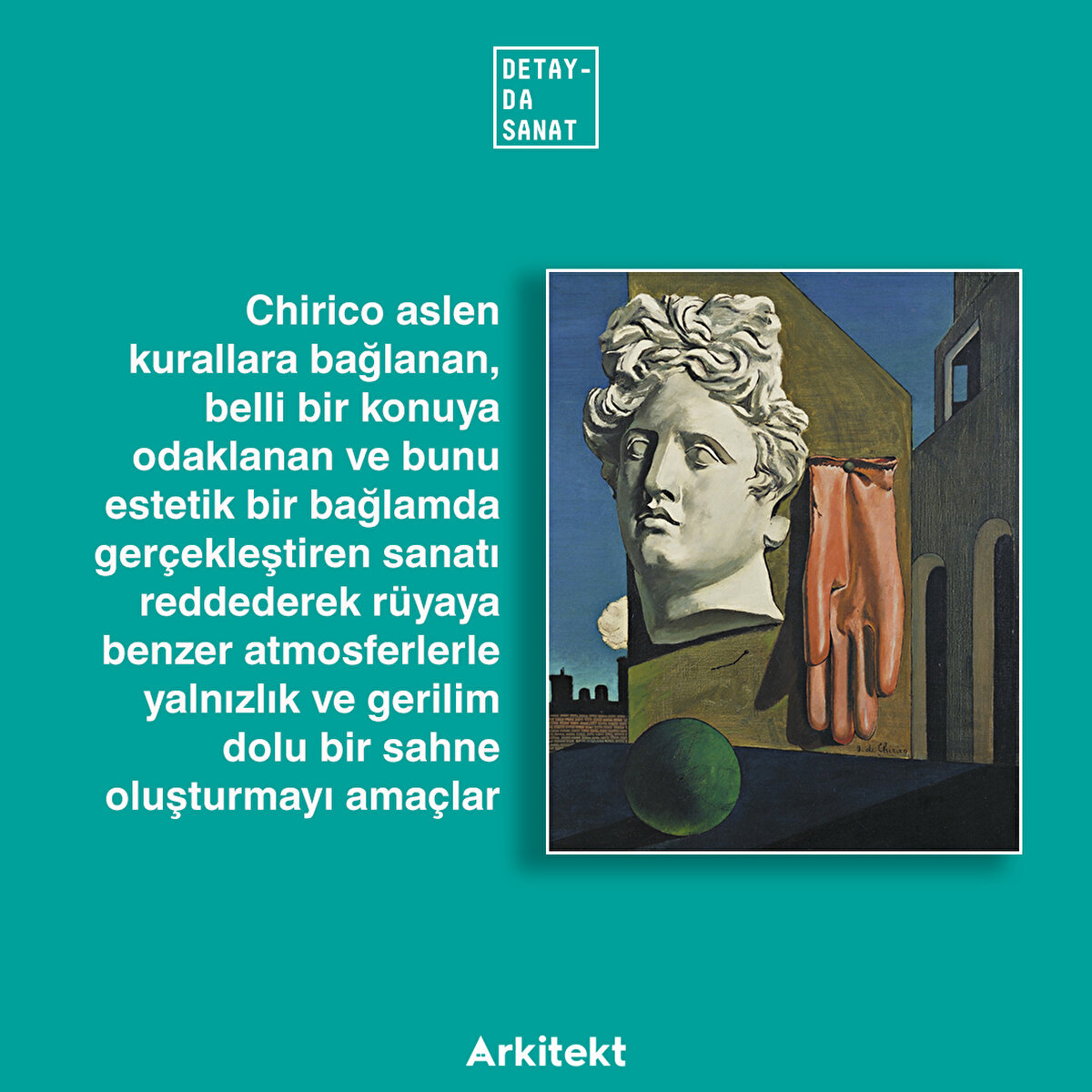 Geleceğin sanatını, işaret noktası olarak, bir simgeyi, bir olguyu ya da düşünceyi ifade etmek için insanı bütünüyle ortadan kaldıran bir sanat şeklinde tanımlayan ve Breton'un ondan on yıl sonra başlatacağı sürrealist akımın öncüsü kabul edilen Giorgio di Chirico bu hafta Aşk Şarkısı ile Detayda Sanat'ta!
