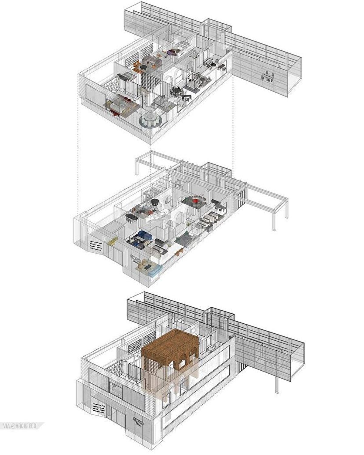 İç tasarımcılar, dinginlik, çeşitli yaşam manzaraları ve geleneksel unsurları yansıtan uyumlu bir mekansal düzen oluşturmayı tercih ediyor. Bu amaca yönelik olarak, iki grup siyah fiberglastan yapılan kare bir gölet ekleyerek ziyaretçileri mekanın merkezinde karşılamayı planlıyorlar. Atriyum, tuğlalarla inşa edilmiş Avrupa tarzı kemerli cephelerle çevriliyor. Böylece alanlar arasında görsel bir etkileşim sağlanıyor. İşlevsellik ve davetkarlık açısından çeşitli öğeler, büyüleyici bir meydanda birleştiriliyor. Atriyumun içinde, malzemenin sağlamlığını hafifletmek ve bir tören duygusu oluşturmak için beyaz bir sarmal merdiven bulunuyor.