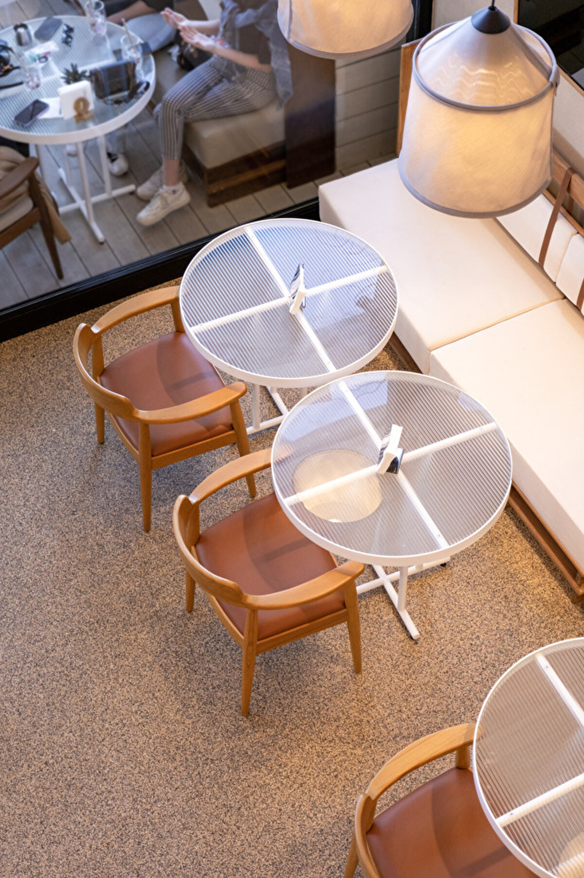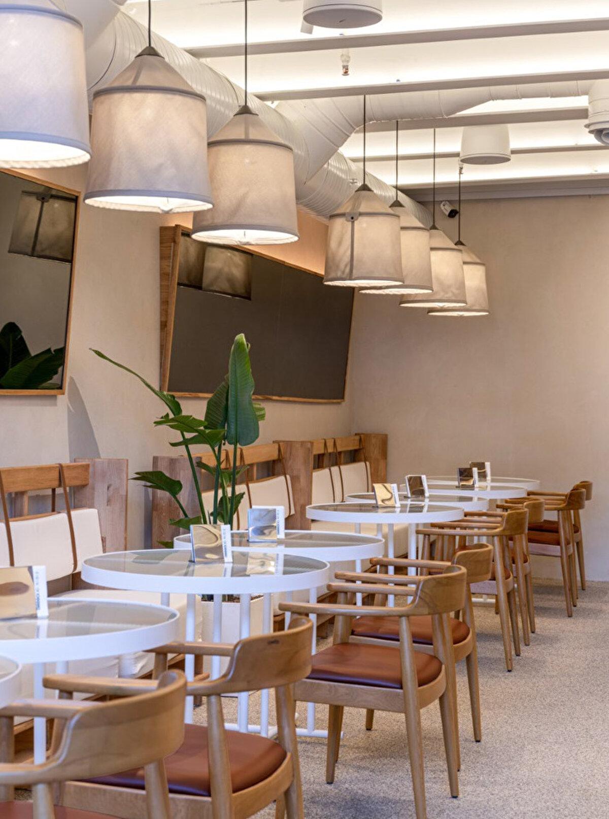 Mekanın yüksekliğinden faydalanarak metal bir asma kat oluşturulup giriş alanında galeri boşluğu kullanılarak yükseklik hissi veriliyor. Asma katı, mekanın sıcaklığına kontrast bir unsur olarak endüstriyel tarzda ve beyaz renkte kurgulanıyor. Büyük doğramalar, doğal ışığın içeri girmesine olanak sağlarken ahşap kabuk sisteminin yansımalarıyla birlikte özel seramik teşhir bankosu ve deri detaylı oturma gruplarında gölgeli etkiler oluşturuyor. Markanın kimliğini yansıtan el yapımı seramik karolarla birleştirilerek hareketli satış ve teşhir üniteleri oluşturuluyor. Masif meşe ahşap detaylarının kullanımı, mekanın sıcaklık ve rahatlık hissini artırıyor.