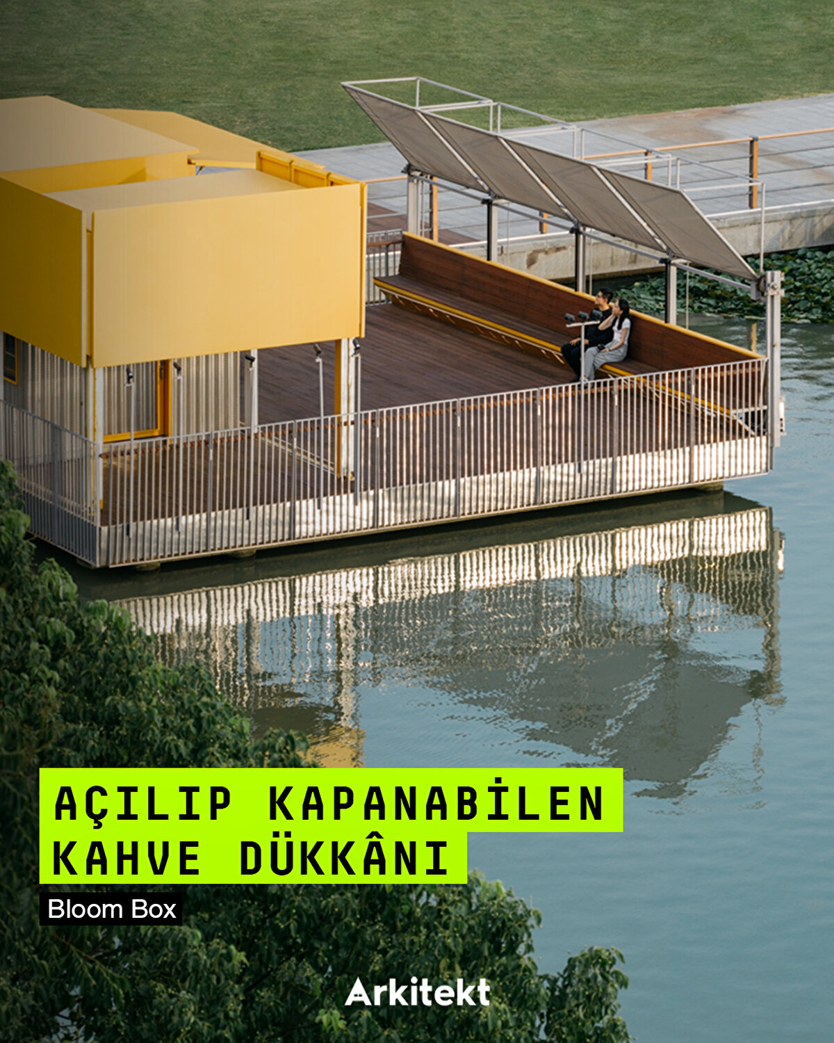 Göl kıyısındaki Bloom Box kahve dükkânı, kente uyumlu tasarımıyla dikkat çekiyor