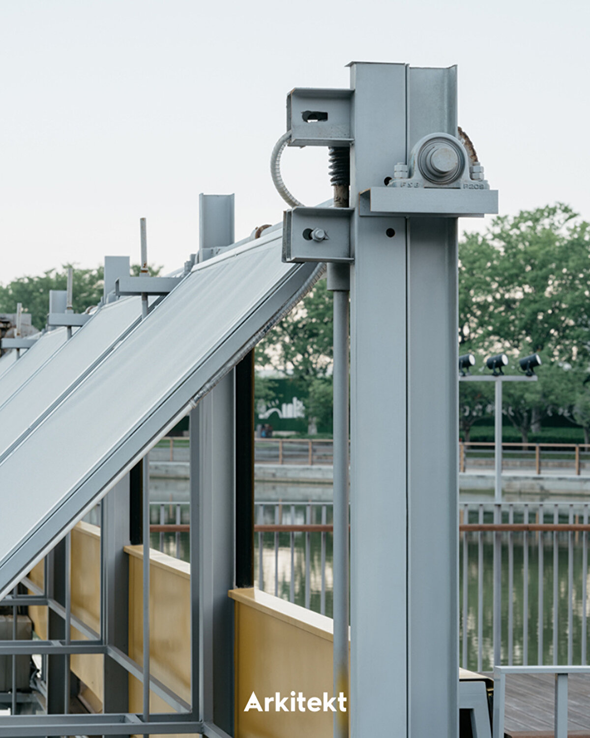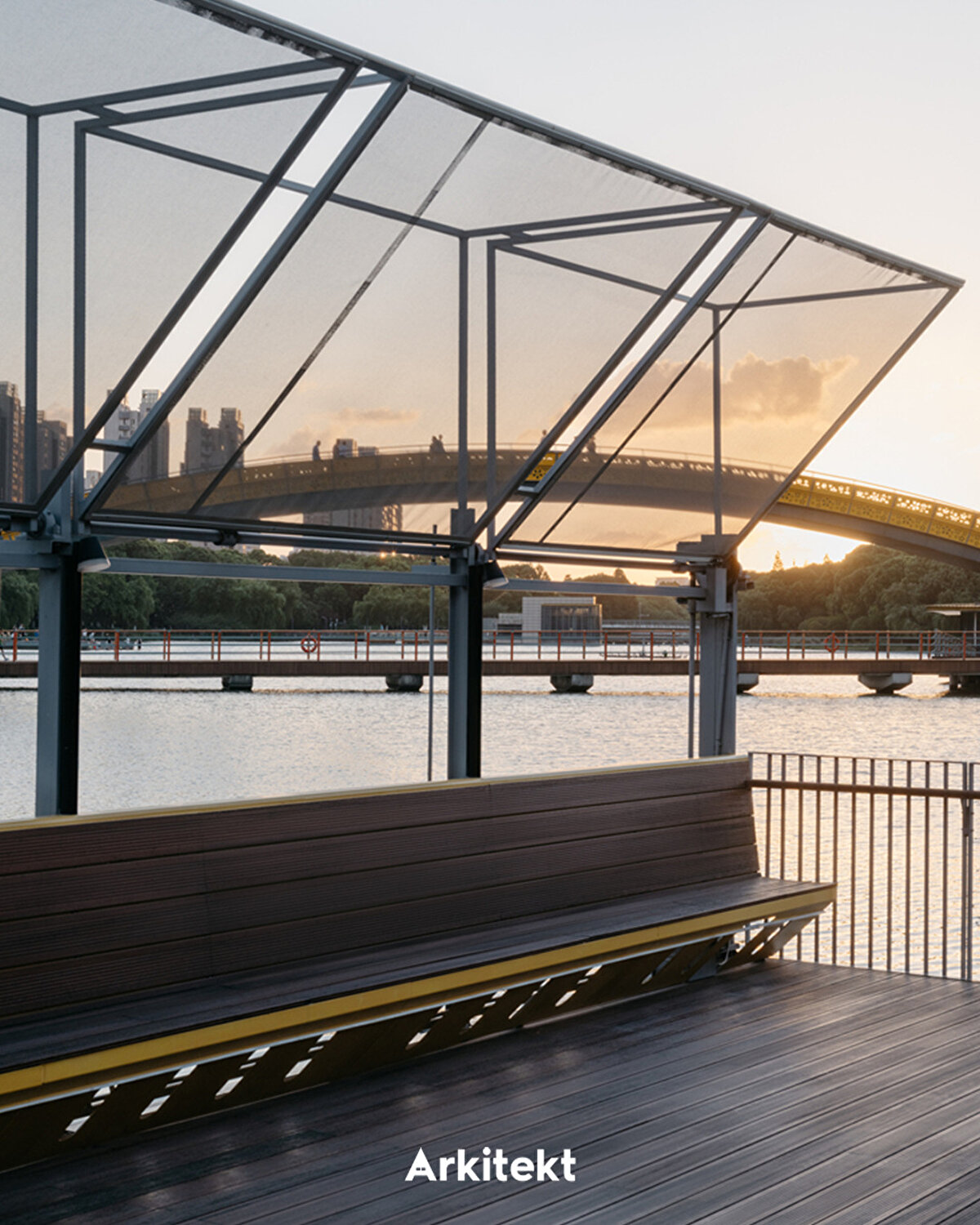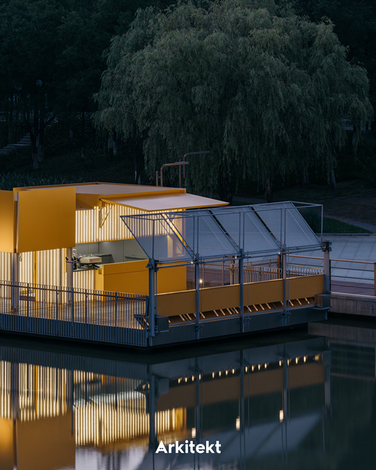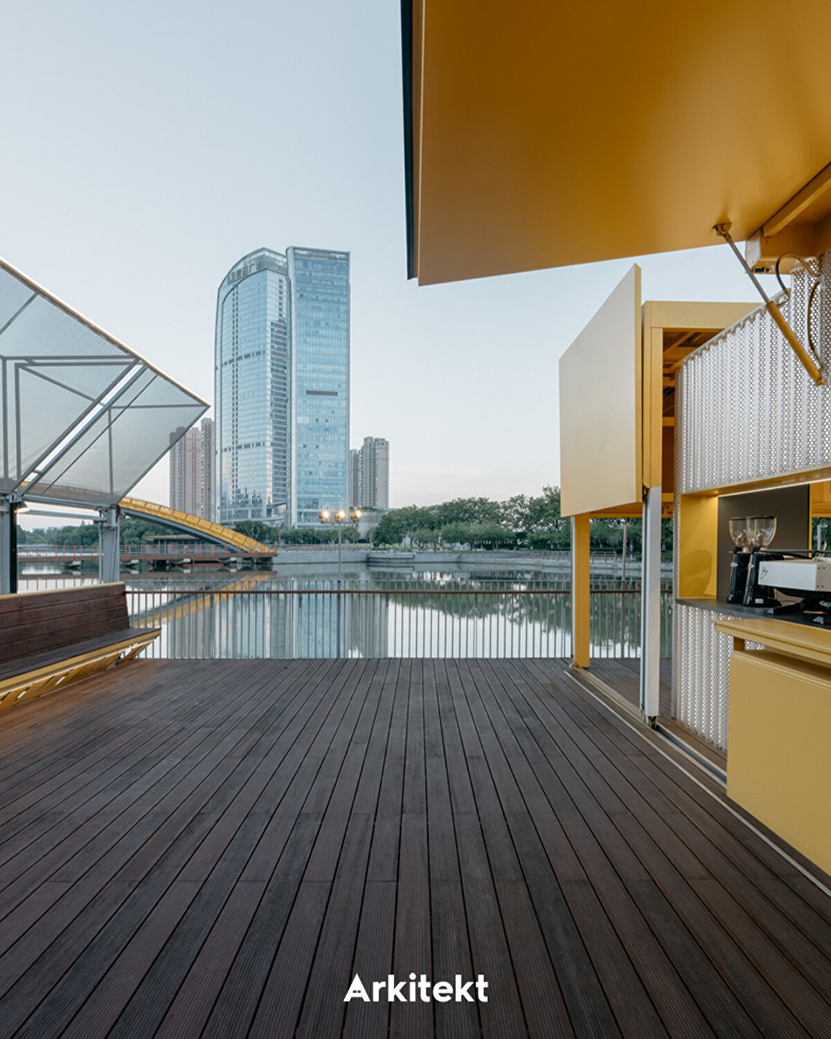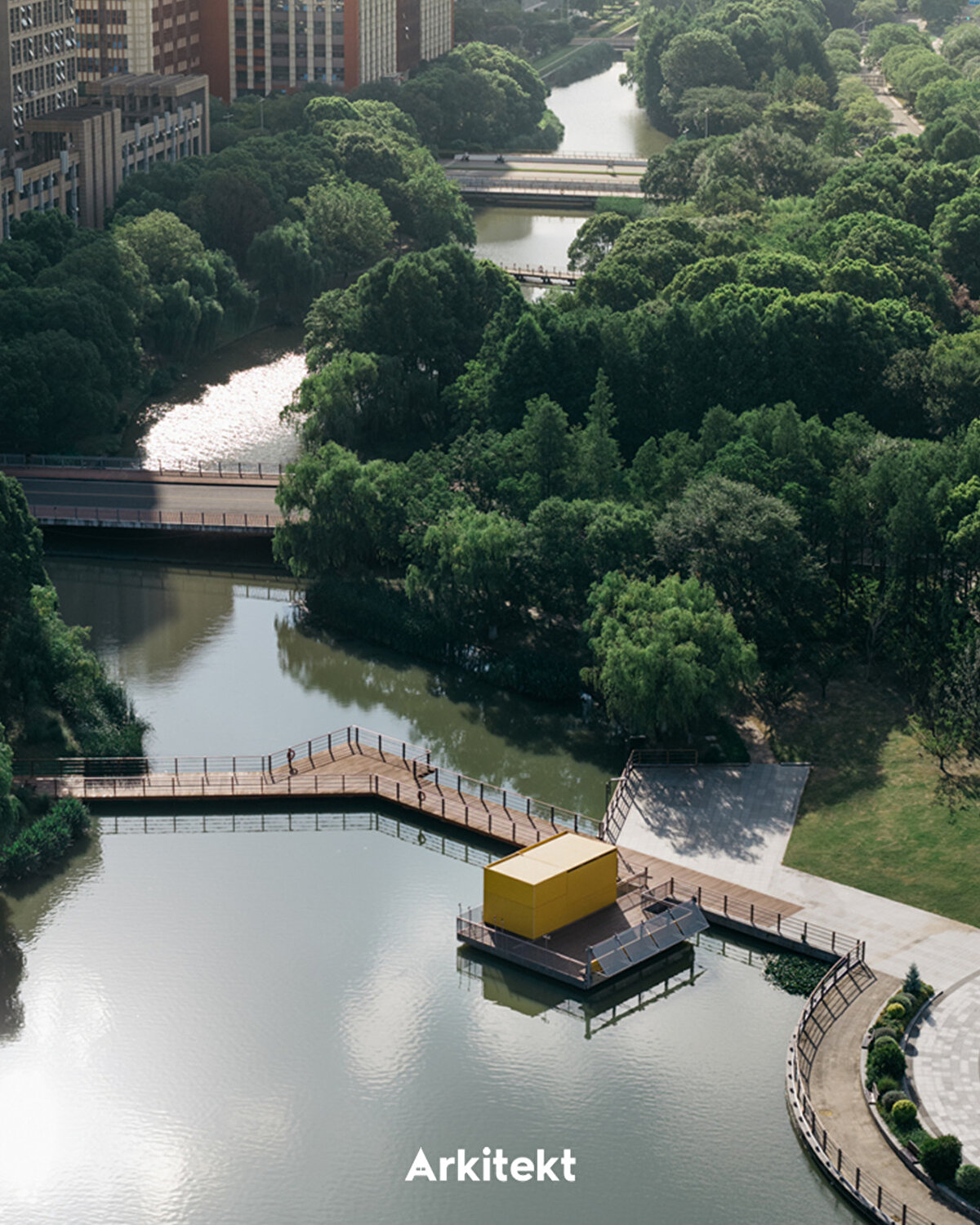 Bloom Box repurposes an old platform located on the lakefront in Kunshan Central Park. Built on a lightweight steel frame and bamboo flooring, the structure is clad in aluminum panels and adapts to different usage scenarios thanks to folding doors and sliding facades. Its dynamic exterior, responsive to the rhythm of daily life, blurs the boundary between interior and exterior spaces. Openable sunshades and semi-transparent surfaces create a permeable spatiality between shadow, light, and breeze. This approach transforms the structure from a static object into an interface that interacts with public life. Users experience the space as a coffee stop, meeting point, or event venue, and the structure integrates into the urban fabric as a small-scale, flexible intervention.