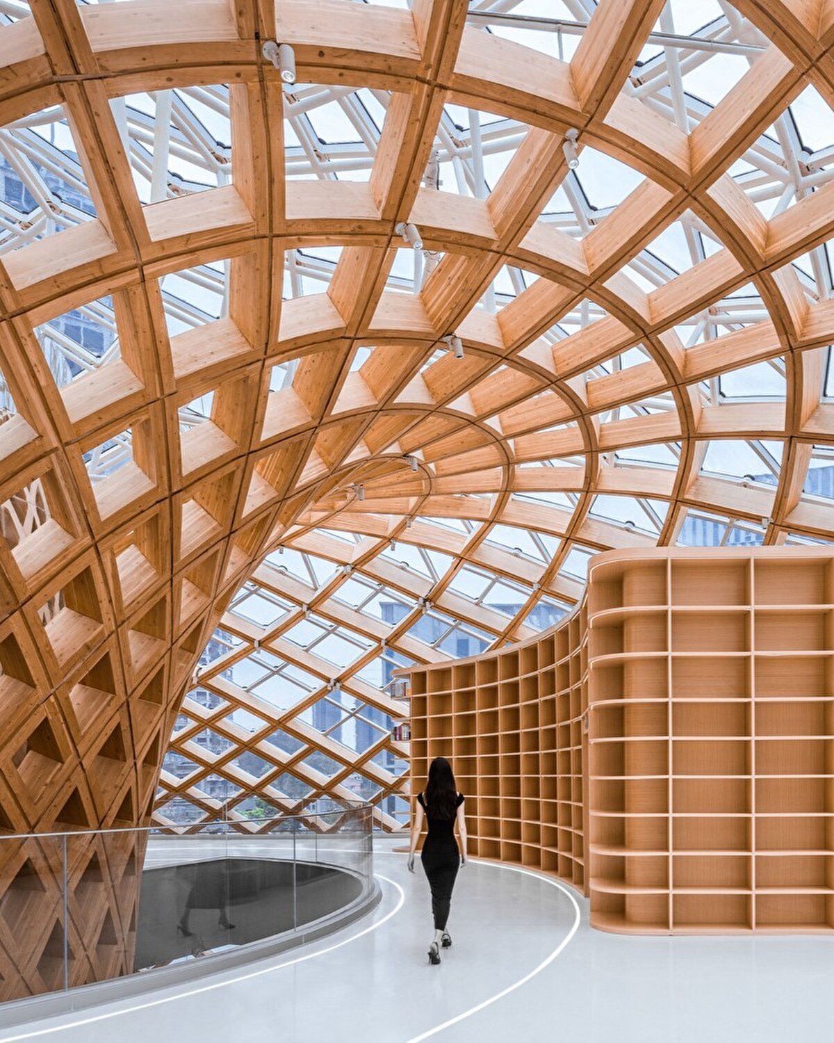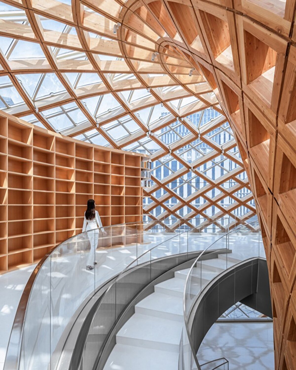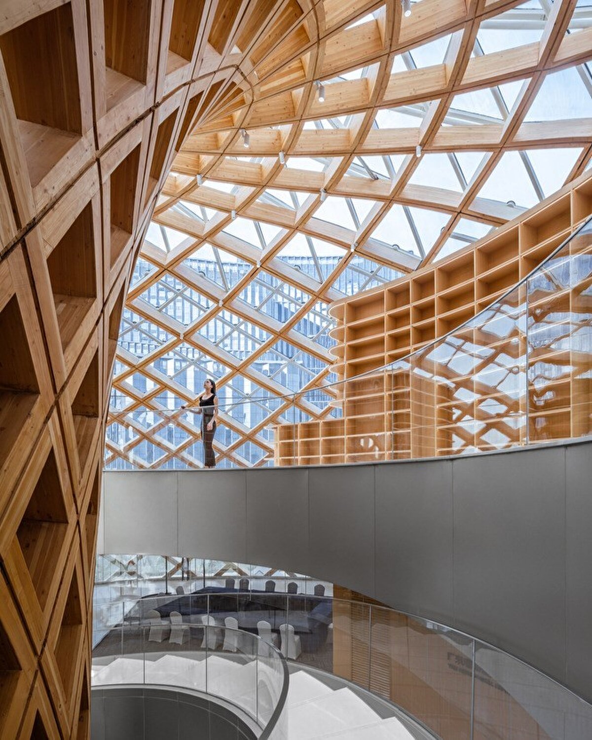 The structure consists of two independent systems; a timber glulam truss shell and a steel frame. The wooden shell forms an apple core-like form from the inside out with the “redwood tree" concept, symbolizing academic collaboration. The steel structure provides large column-free spaces thanks to three core tubes spaced at 120-degree intervals.