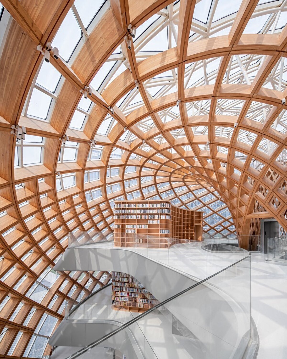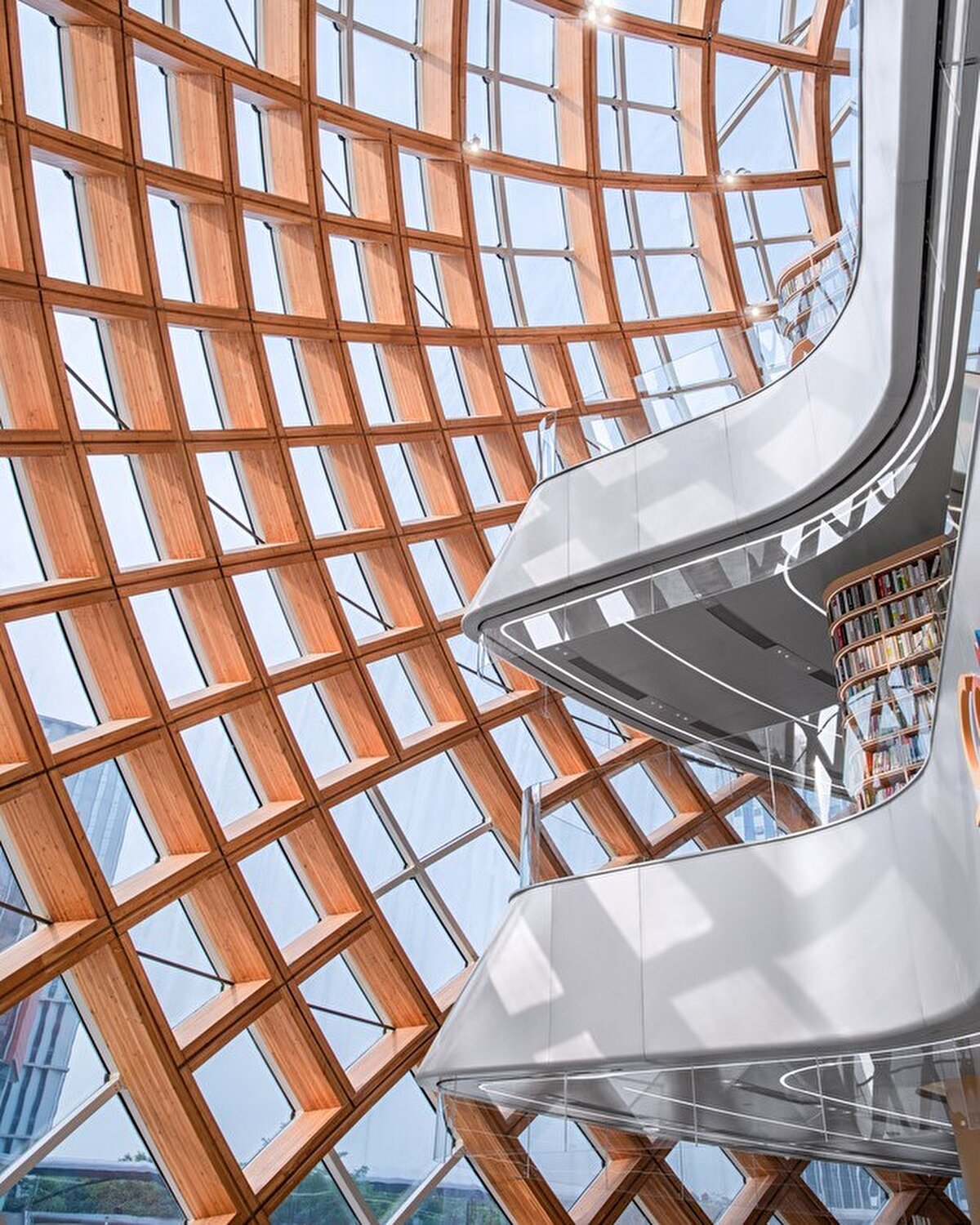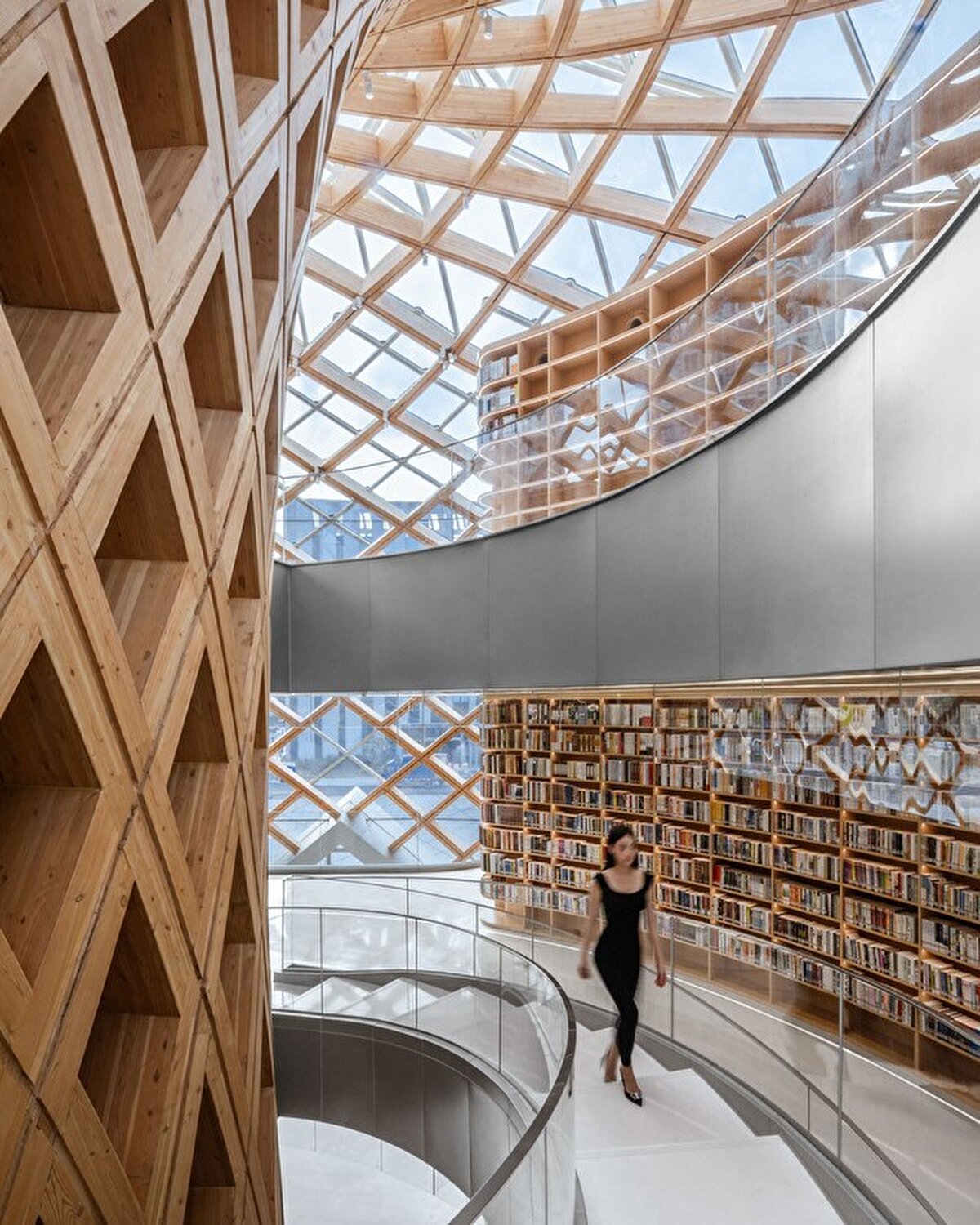 The structure consists of two independent systems; a timber glulam truss shell and a steel frame. The wooden shell forms an apple core-like form from the inside out with the “redwood tree" concept, symbolizing academic collaboration. The steel structure provides large column-free spaces thanks to three core tubes spaced at 120-degree intervals.