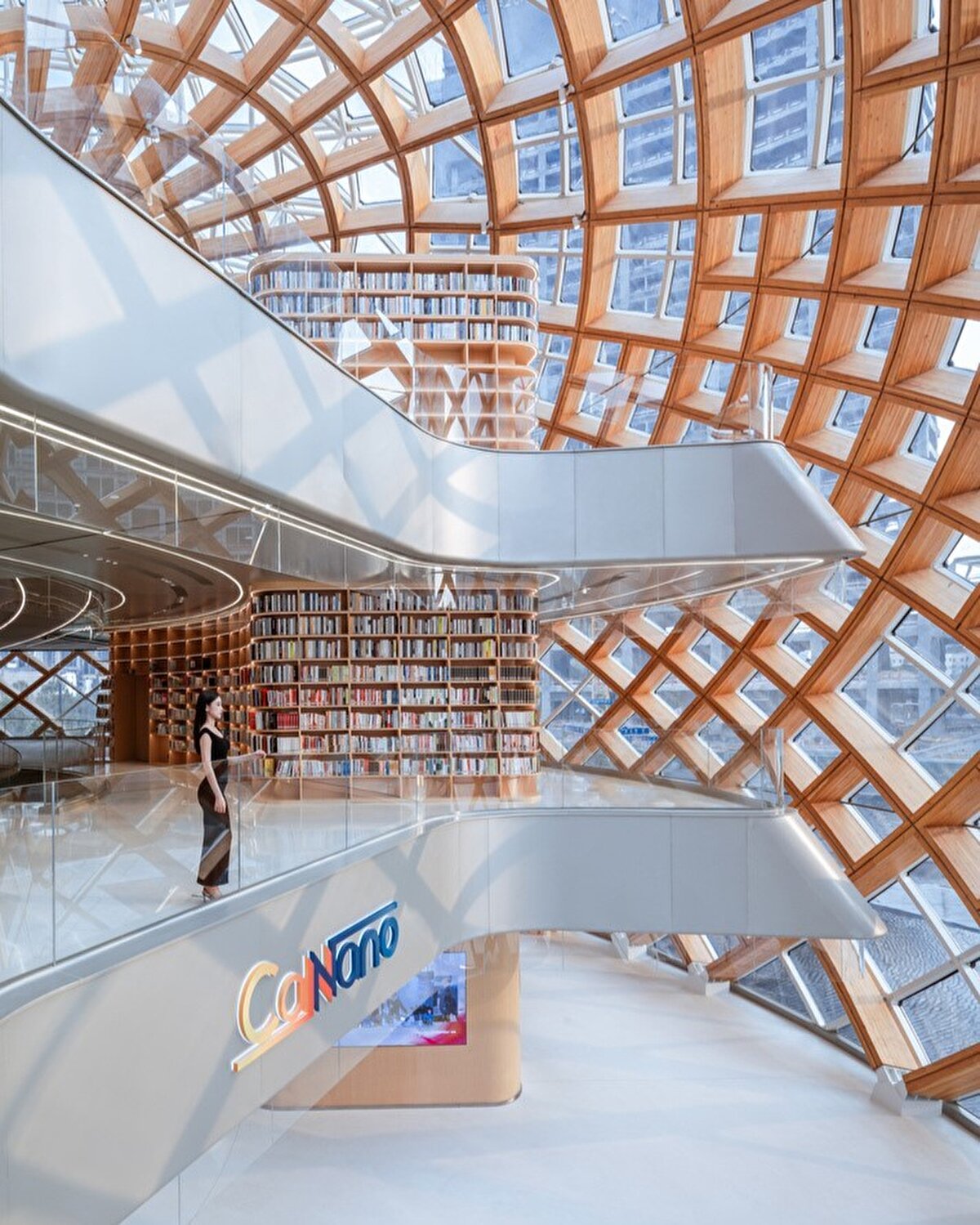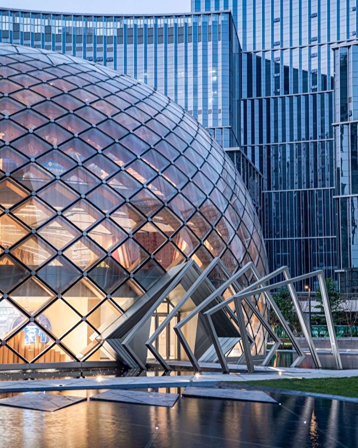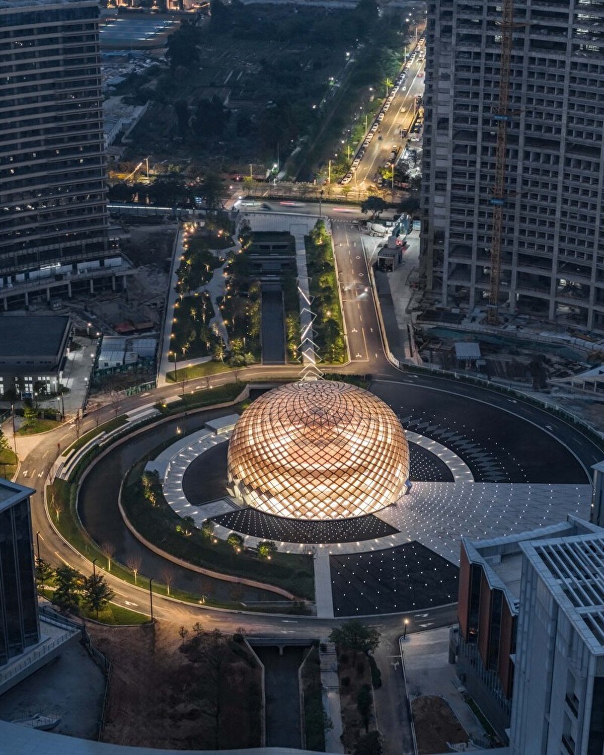 Located in Huangpu District, Guangzhou and designed by Hot Design, the Exhibition Center is a 39 m diameter and 21 m high dome structure located in the central landscape area of Cannano Park. With an area of 4,159 square meters, the building houses equipment and auxiliary spaces in the basement, while the upper three floors function as exhibition halls, reception areas and conferences.
