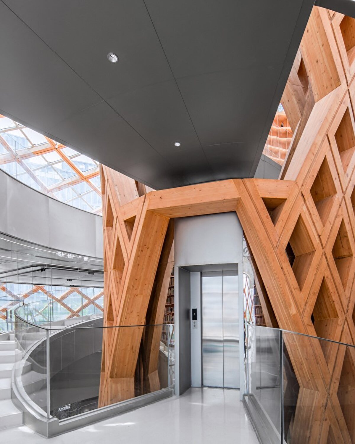 The first floor is designed as exhibition spaces, the second floor as conference and reading areas, and the third floor as a media bulletin and 360° panoramic indoor platform.