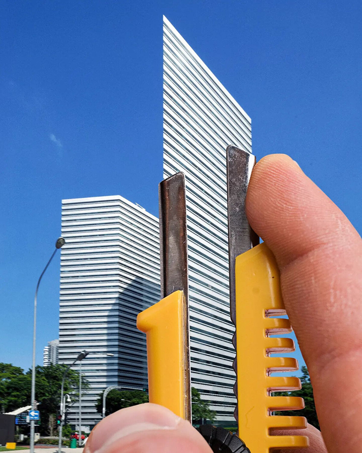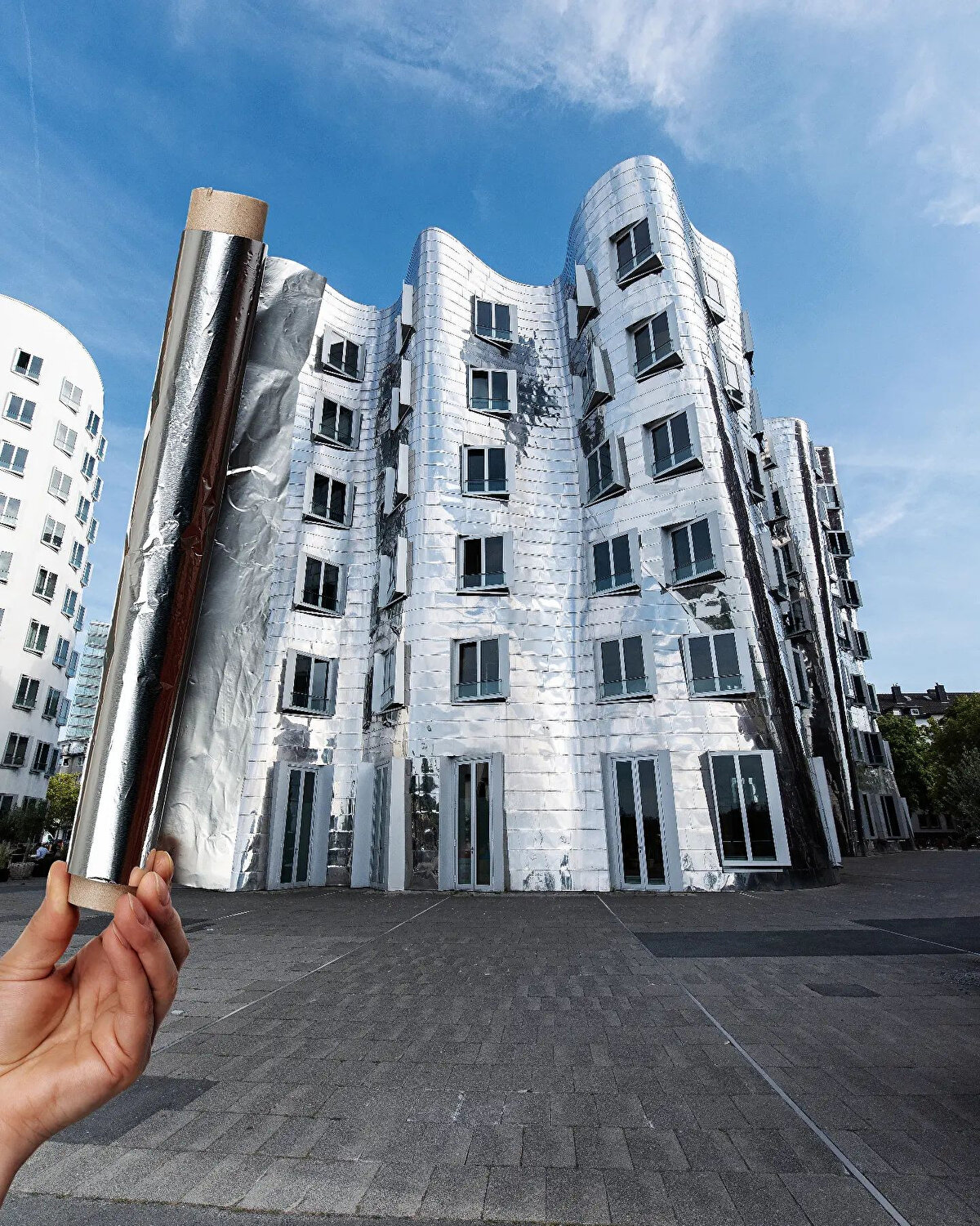 Gündelik nesneler, bu optik illüzyonları oluşturmak için büyük ölçekli ortamlarla yan yana getiriliyor.