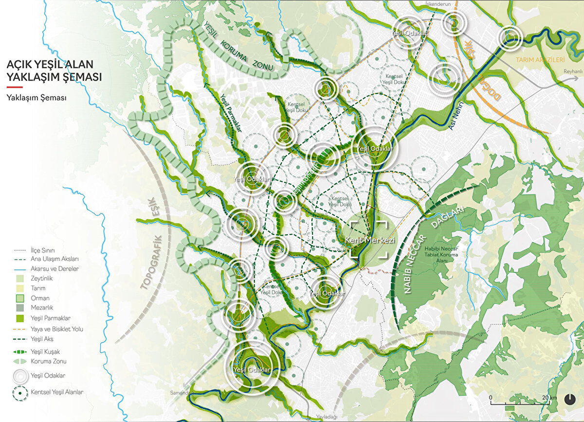 Masterplana göre, nehir kıyısı ve dere yataklarının imara kapatılmasıyla toplam yeşil alan deprem öncesine göre yaklaşık 2 katına çıkarılmıştır.