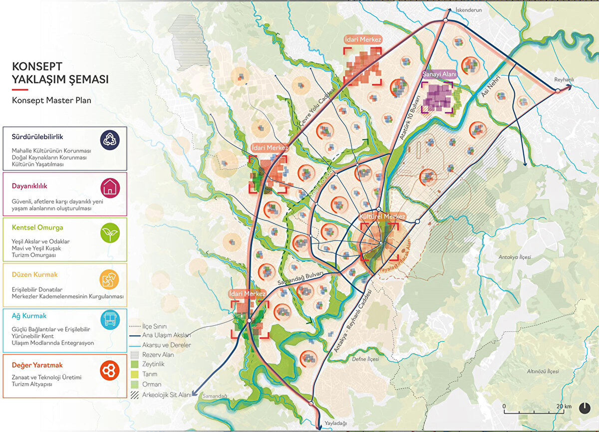 “1920'lerde yapılmış olan Fransız planı izleri temel bir yaklaşım prensibi olarak sürdürülmektedir. Depremin yıkıcı etkisini artıran dere yataklarına yerleşim anlayışı terk edilerek nehir ve su kıyıları yeşil alan olarak ayrılmıştır.