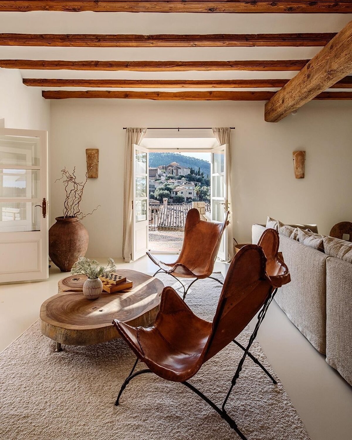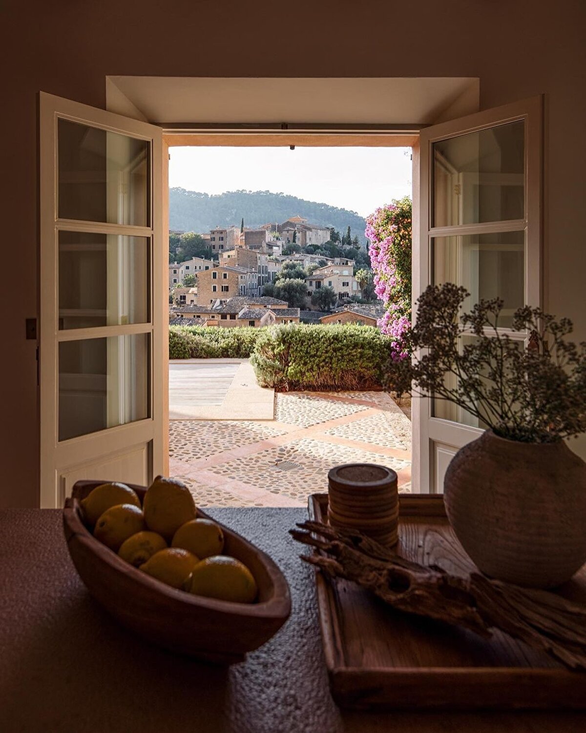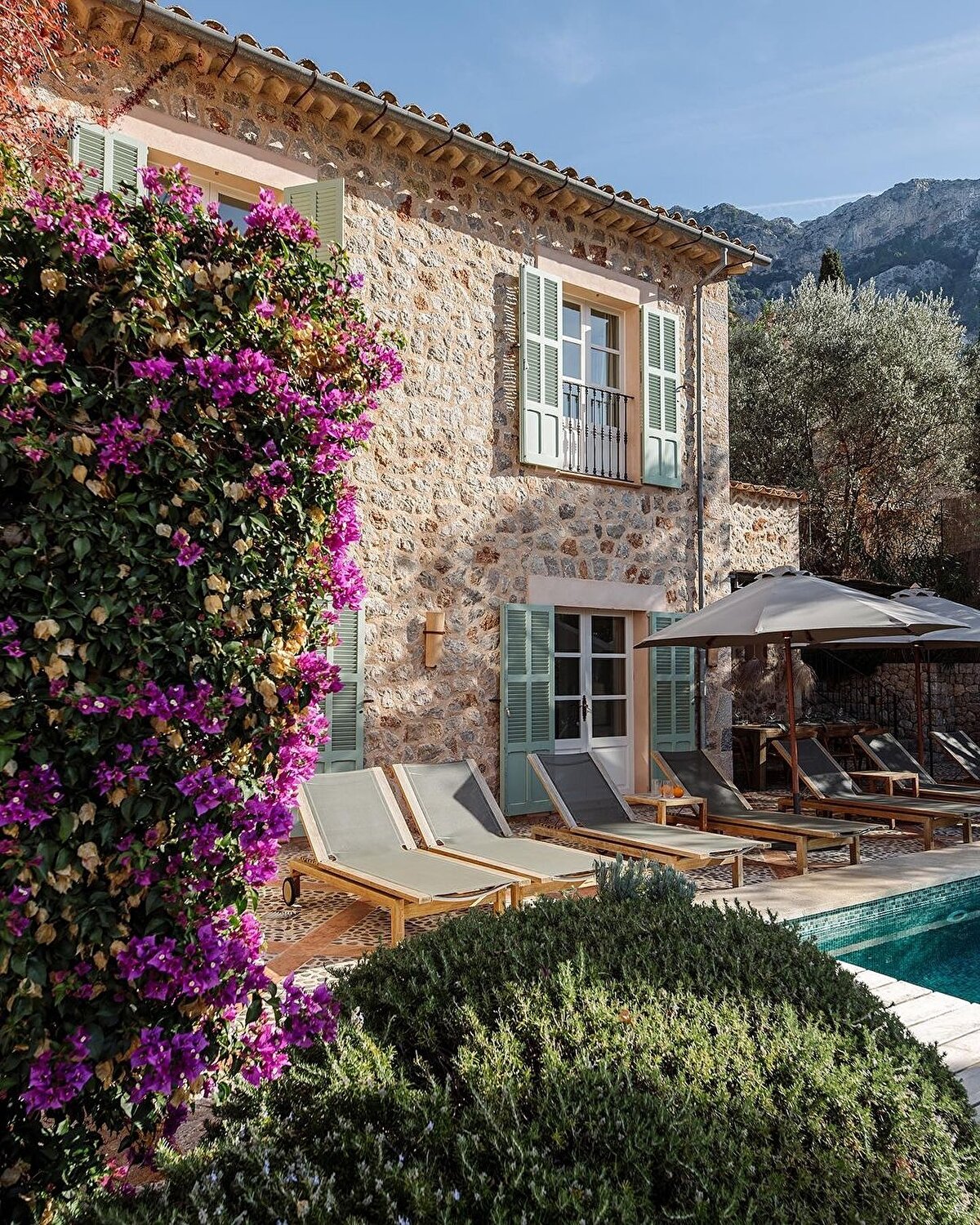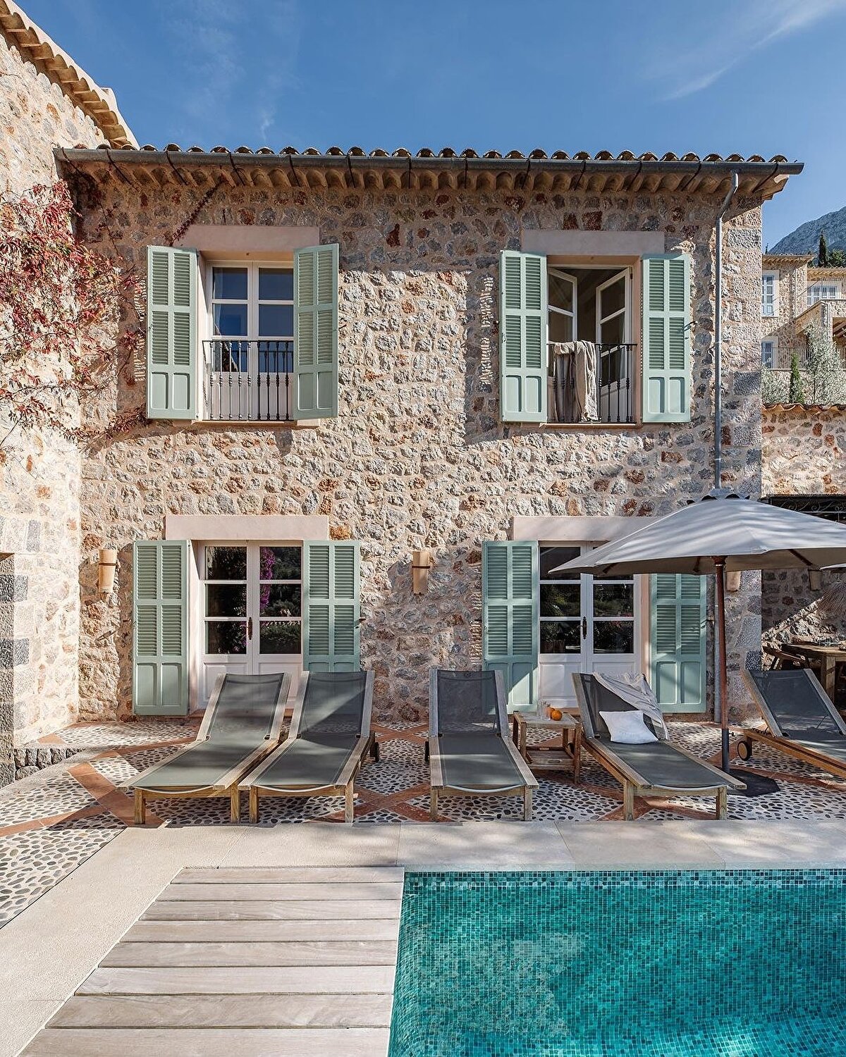 Designed by @soulescapes_mallorca, Sa Llupia is a villa located in the village of Deià, Mallorca, blending the natural texture of the Mediterranean Sea and the Tramuntana Mountains. Its traditional stone walls and green shutters combine rustic charm with contemporary luxury. The interiors, designed in light tones, have a spacious atmosphere supported by large windows. The use of wooden beams and organic forms adds a natural warmth to the space. The pool area, surrounded by natural stone floors, is complemented by modern landscaping elements, offering a perfect outdoor experience.