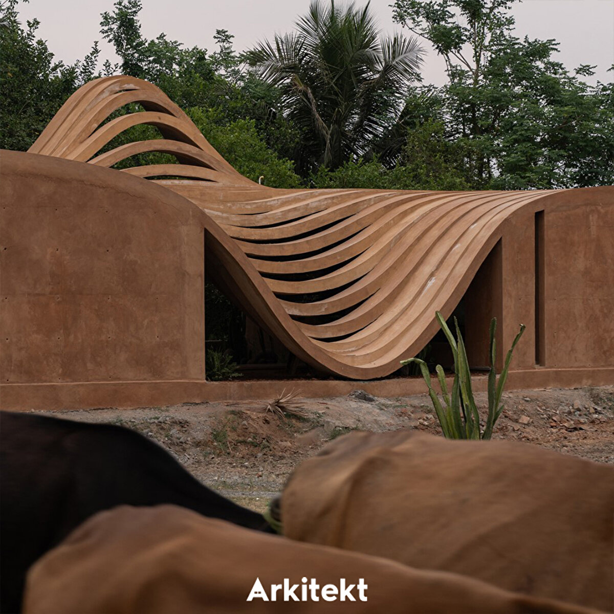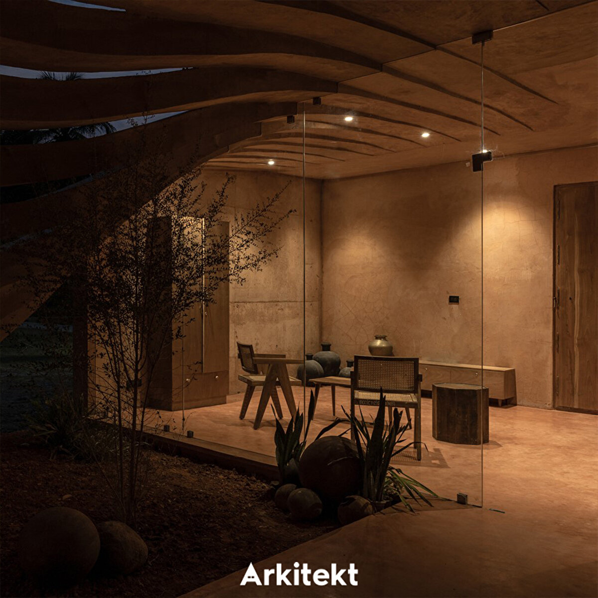 The wall on the west protects the courtyard from the sun, while the curved roof on the east creates an open space for the morning sun. Holes in the roof create patterns in the ground and allow rain to pass through. The curve is not just an architectural element, but a transition point that offers space for play and relaxation. The courtyard provides shelter for birds, insects and animals as well as the family, integrating the house with nature. Raindrops and the starry sky give the space a narrative.