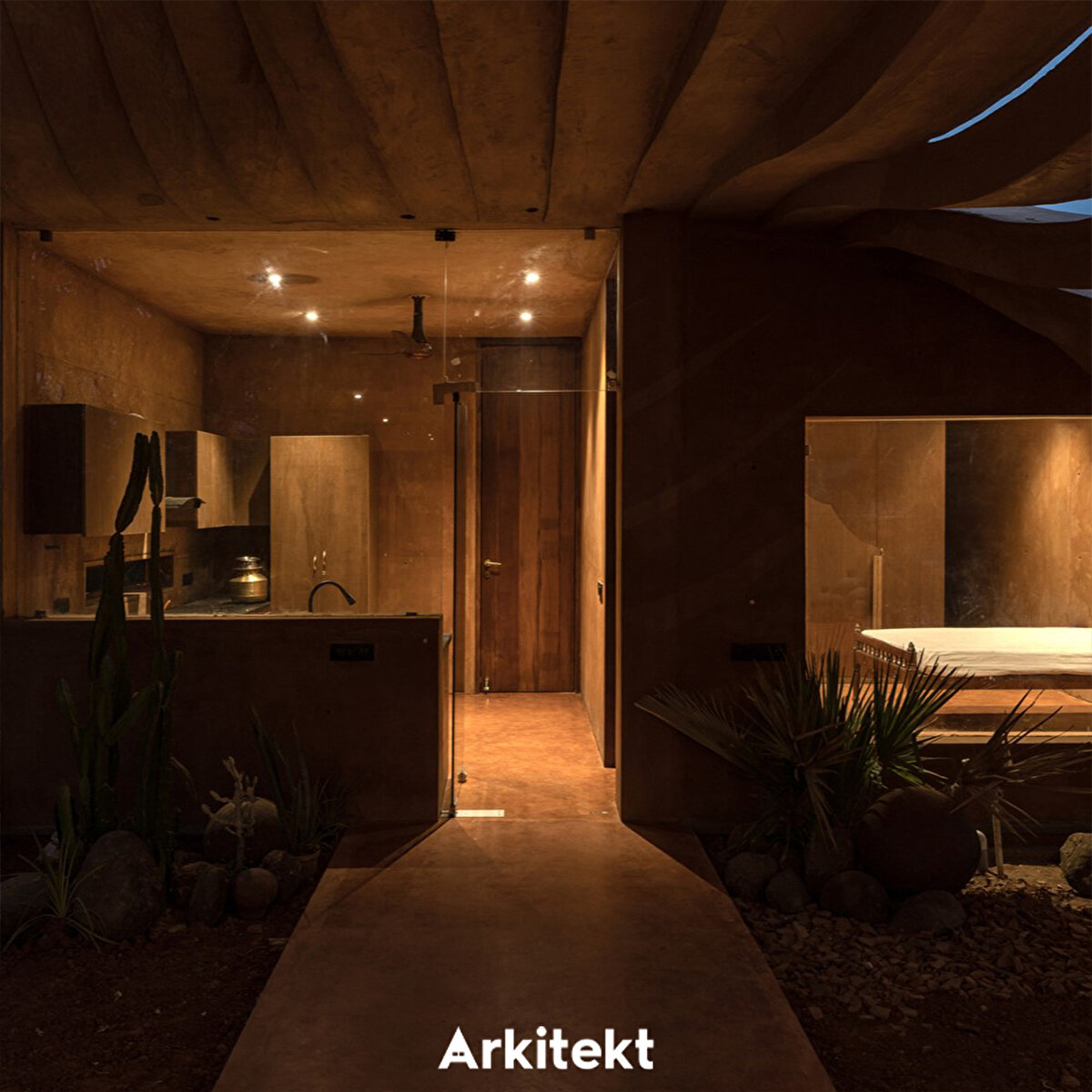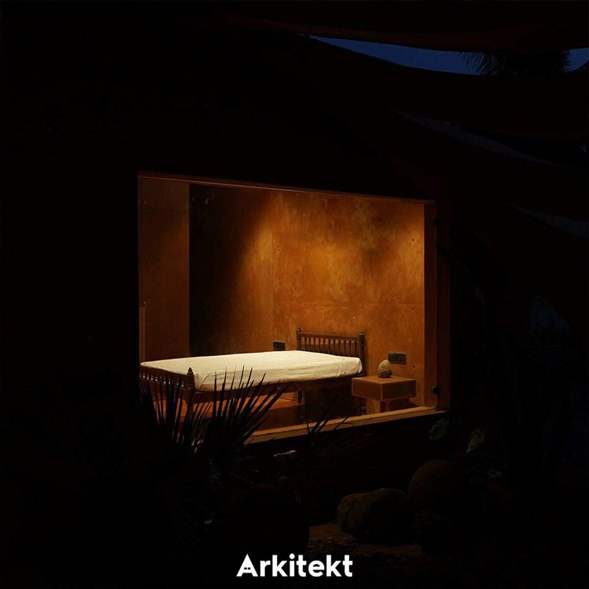 Batıdaki duvar avluyu güneşten korurken, doğudaki eğri çatı sabah güneşi için açık bir alan oluşturuyor. Çatıdaki delikler, zeminde desenler oluşturuyor ve yağmurun geçişine izin veriyor. Eğri, sadece bir mimari öğe değil, oyun ve dinlenme alanı sunan bir geçiş noktası oluyor. Avlu, aileyle birlikte kuşlara, böceklere ve hayvanlara da sığınak sağlıyor, evi doğayla bütünleştiriyor. Yağmur damlaları ve yıldızlı gökyüzü, mekâna bir anlatı kazandırıyor.