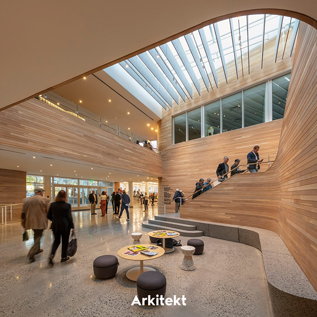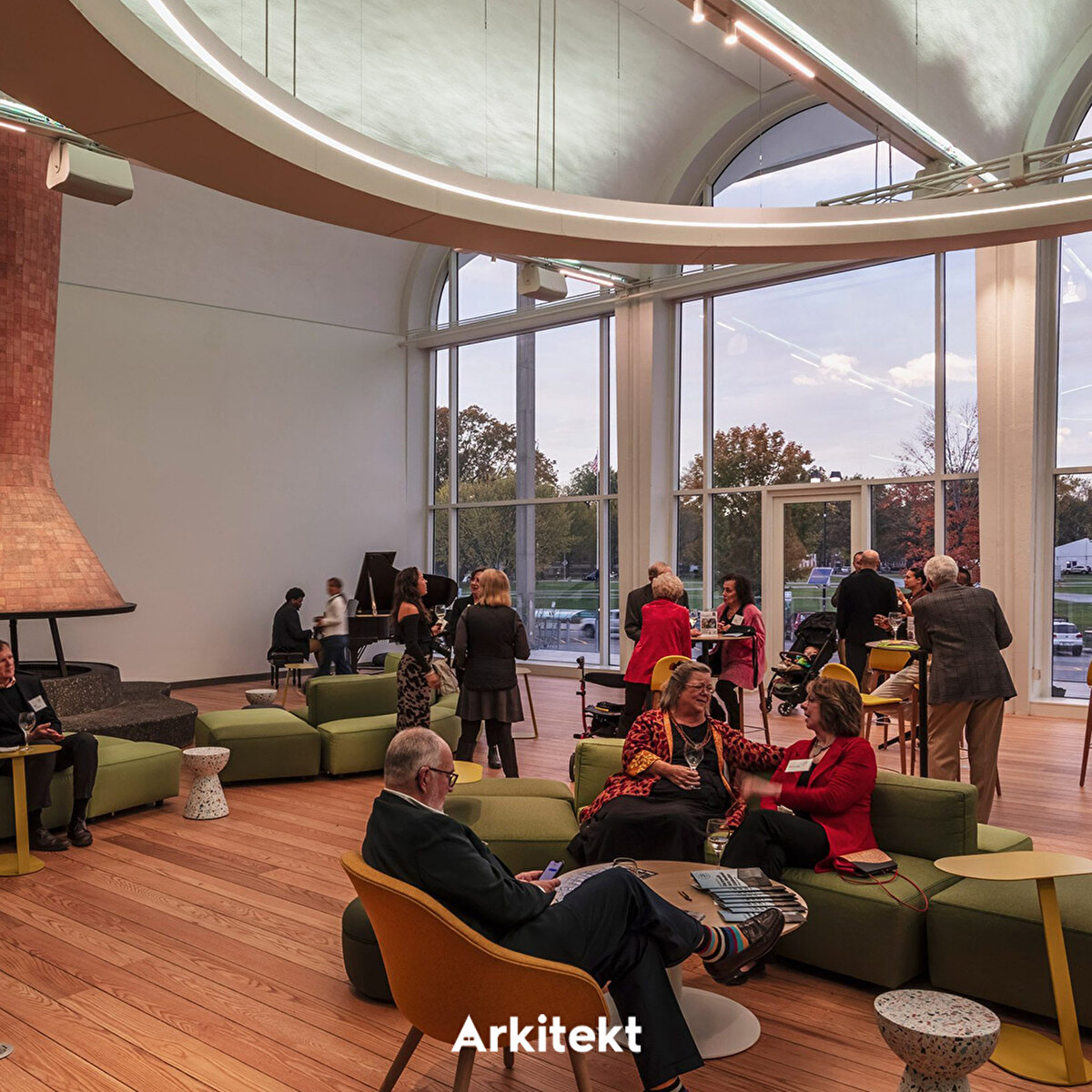 The new volumes offer a rhythmic response to Harrison's arched façade design, presenting an approach that Snøhetta describes as 'dance partners'. The buildings are connected by a shared space called the Forum, clad in glass and wood, which defines a new social focus within the art centre. The expansion project redefines the campus's cultural continuity through a contemporary architectural language while repurposing existing spaces.