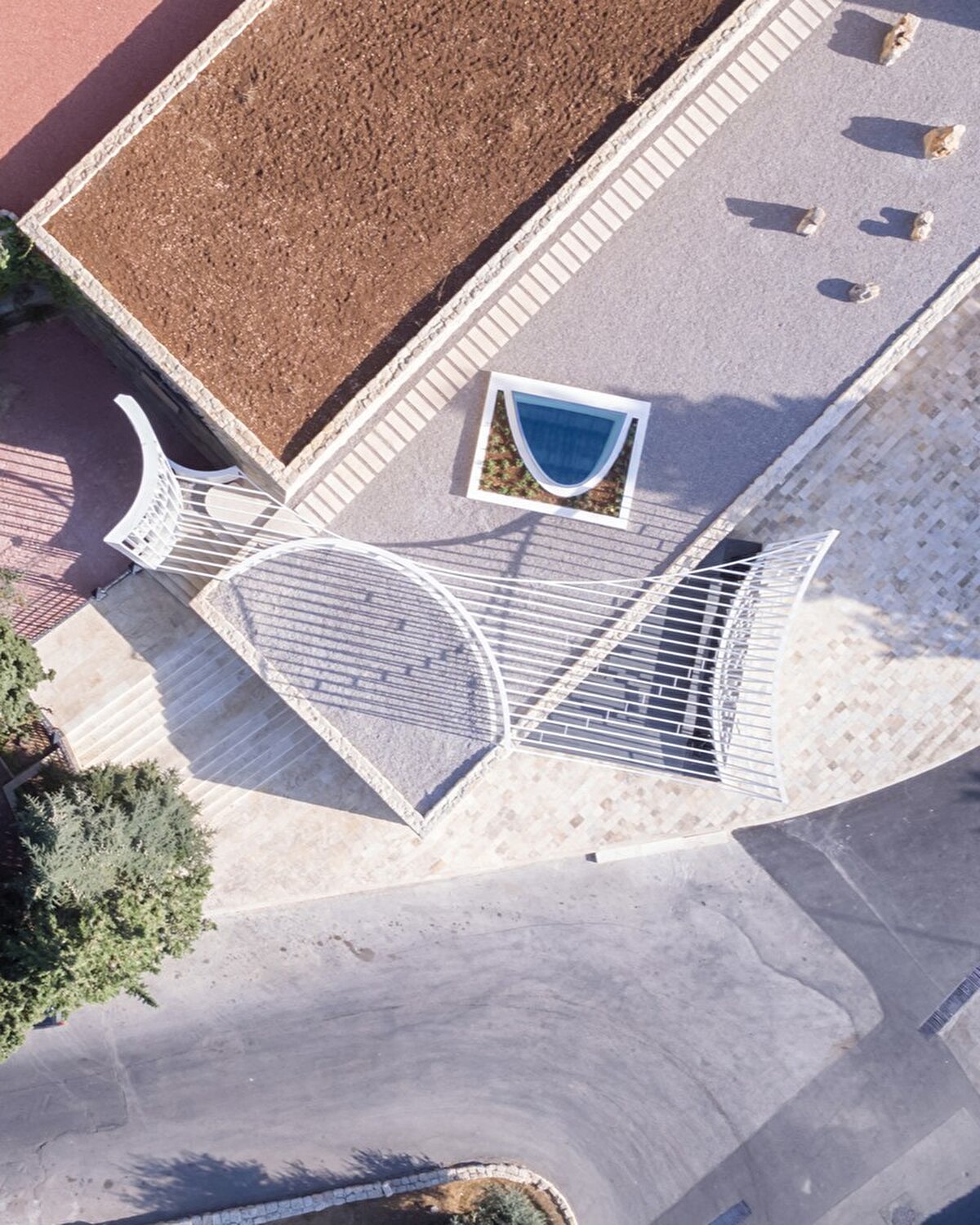 Caminin önündeki eski otopark alanı, şimdi oturma alanları ve çeşmesi olan halka açık bir meydana dönüştürülüyor. Mimarlar, mevcut taş hacmi kısmen kaplayan beyaz metal bir yapı inşa ediyor. Bu yapı, caminin minaresi rolünü üstleniyor ve üzerine yazılmış iki kelimeyi içeriyor. Yapının tepesinde "Allah" kelimesi, gökyüzündeki ilahi varlığı sembolize ederken, yapının alt kısmında yer alan "İnsan" kelimesi, insanı temsil ediyor. Bu tasarım, meydandaki ziyaretçilere hem estetik bir deneyim sunuyor hem de manevi düşünceye teşvik ediyor.