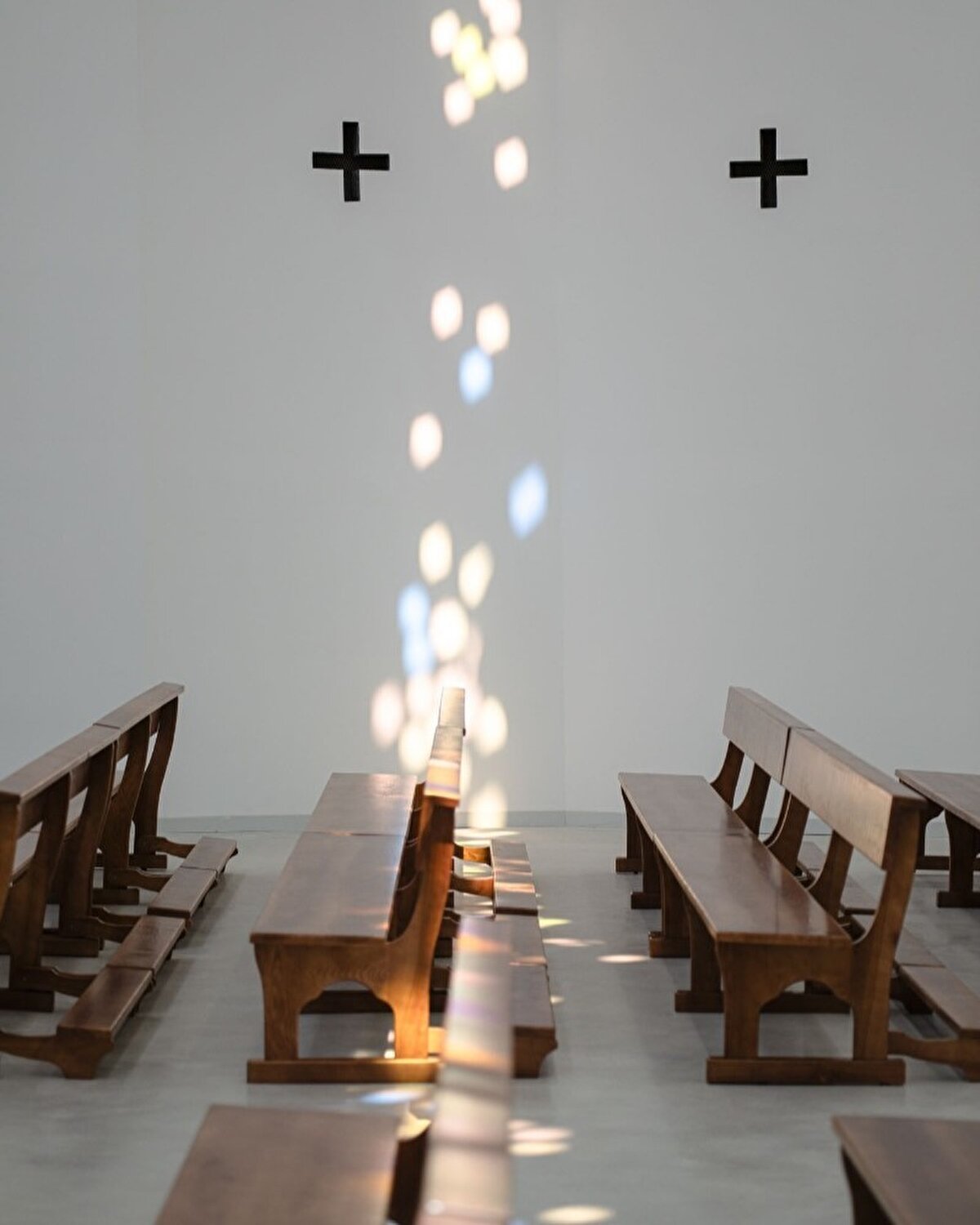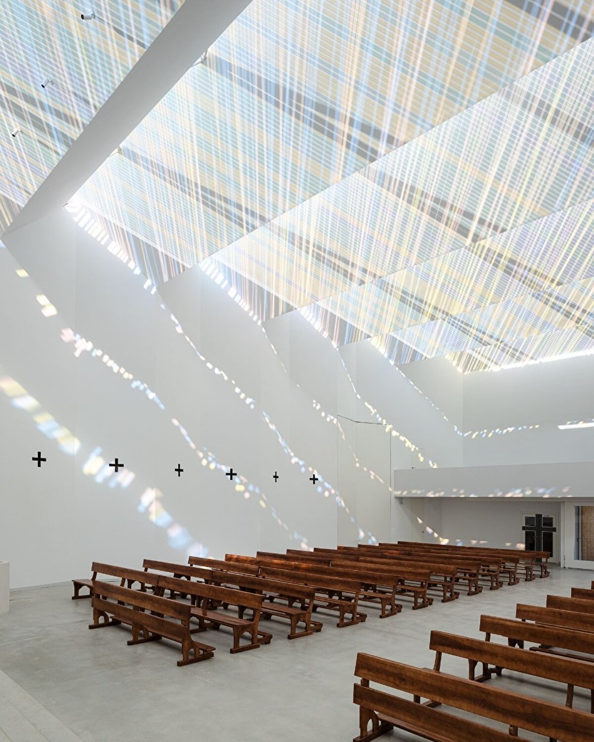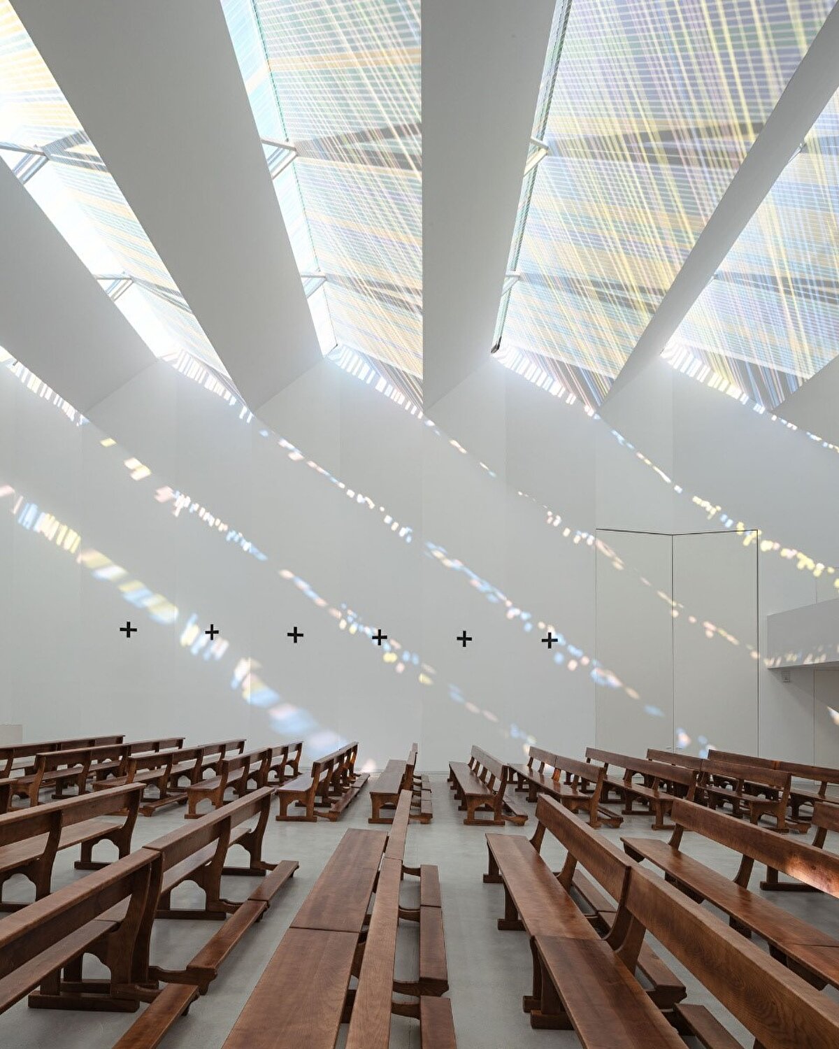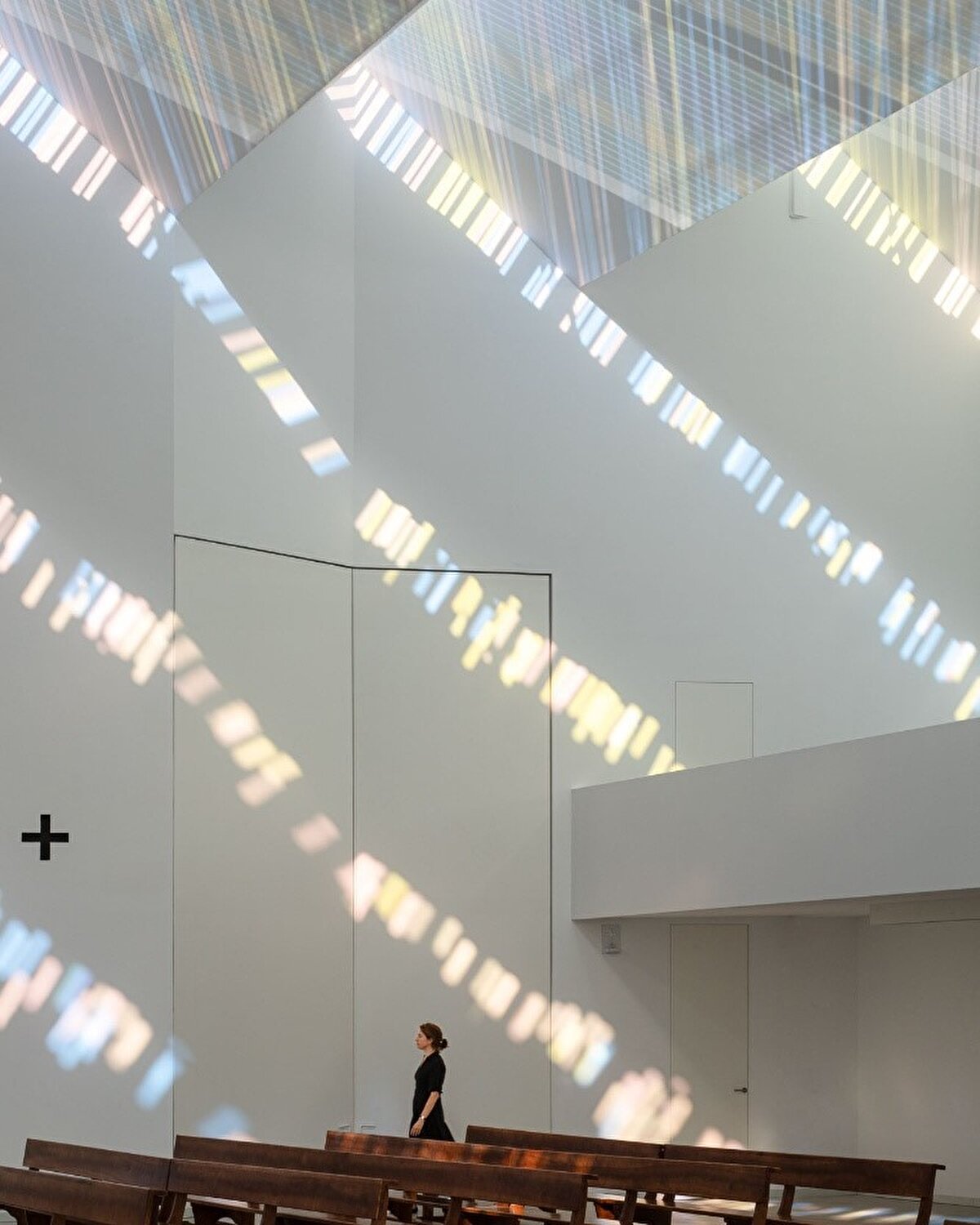 Kilisenin dış cephesi, düzensiz bir çatı ile kaplı olan beton bir hacmi andırırken, yapının köşesinde zarif bir şekilde yükselen ince bir çan kulesi dikkat çekiyor. İç mekanda ise çatı açıklığı ve kullanılan özel cam materyali ile günün çeşitli saatlerinde aradan sızan gün ışığı sayesinde farklı desenler ortaya çıkıyor.