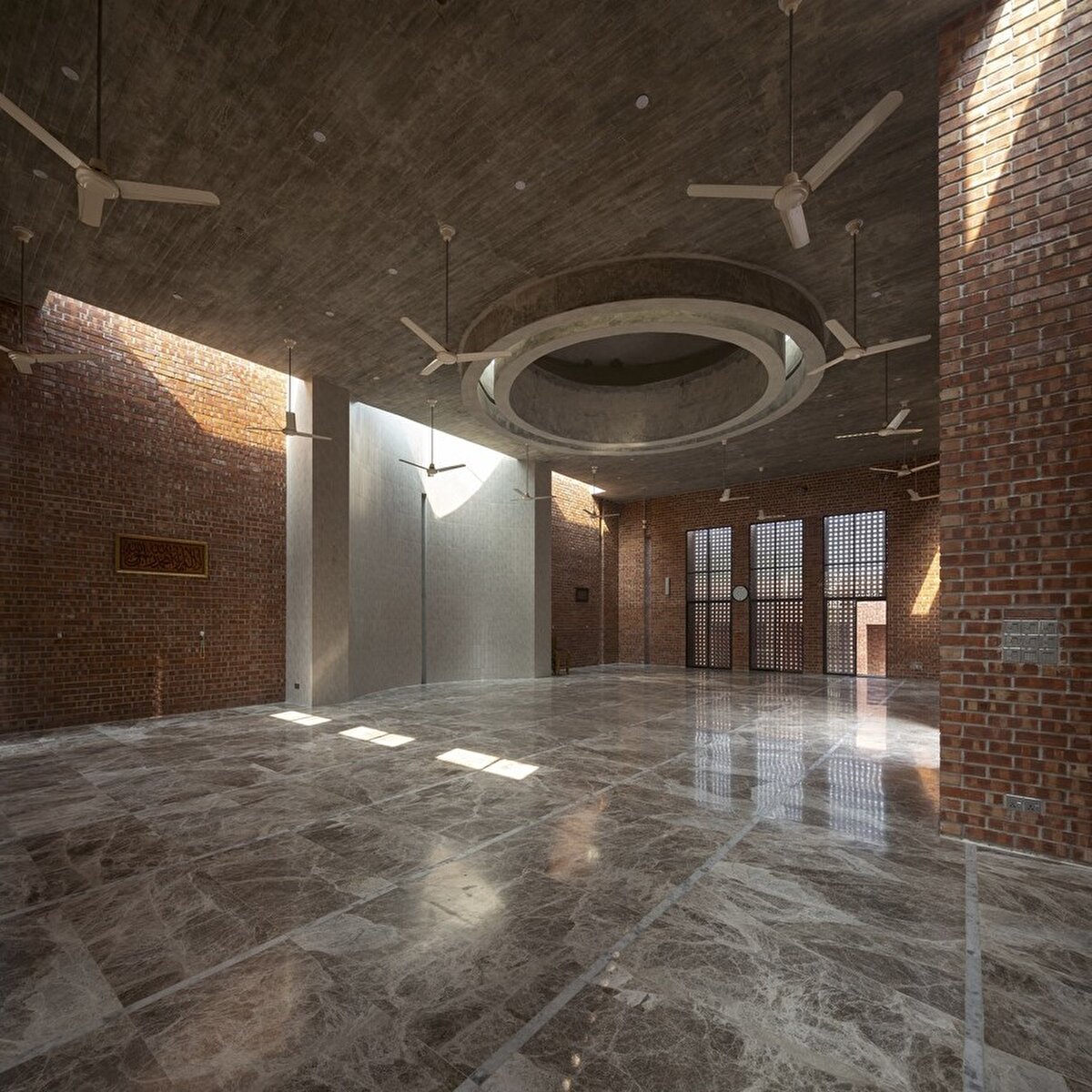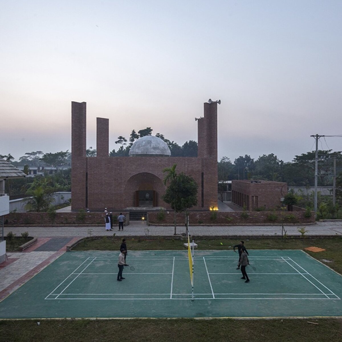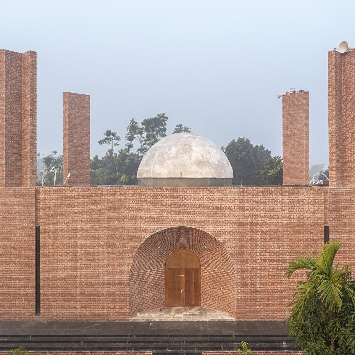 Bait Ur Raiyan Camii, Arial Kha Nehri'nin yakınındaki geleneksel Bangladeş kırsal alanında 464 m² alanda konumlanmış küçük ölçekli bir cami. Bu özel tasarım, İslam Mimarisinin temel sembolizminin soyut yorumunun bir uygulaması olarak, hem formu hem de mekansal kaliteyi dönüştürme açısından geometrik şekilde tasarlanıyor. Caminin manevi varlığını vurgulayan aydınlatma, kutsal ve samimi boyutu korurken, kırmızı tuğla gibi yerel malzemeler kullanılarak insan odaklı bir yaklaşım benimseniyor. Tuğlanın koyu kırmızısı, alanı çevreleyen yeşilliklerle yumuşak bir kontrast oluşturuyor.