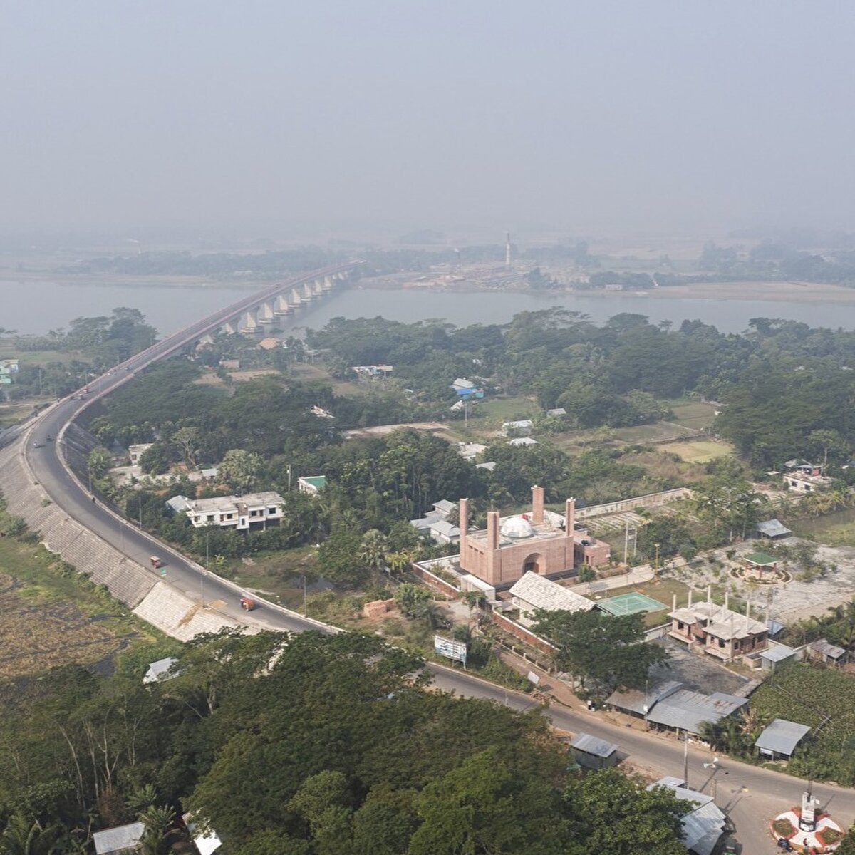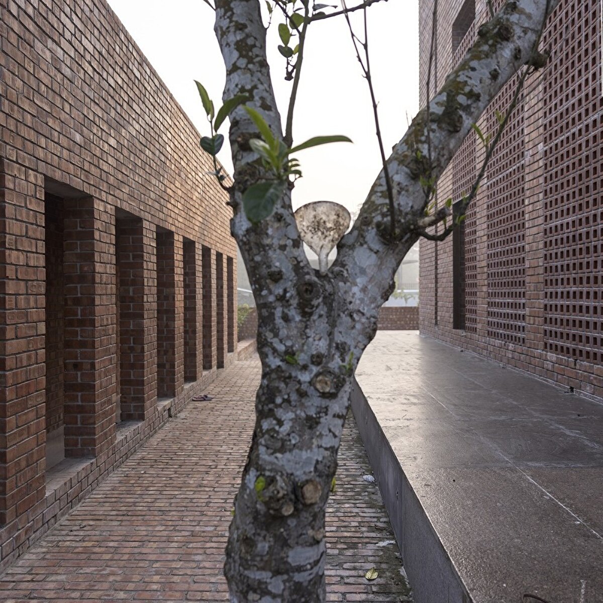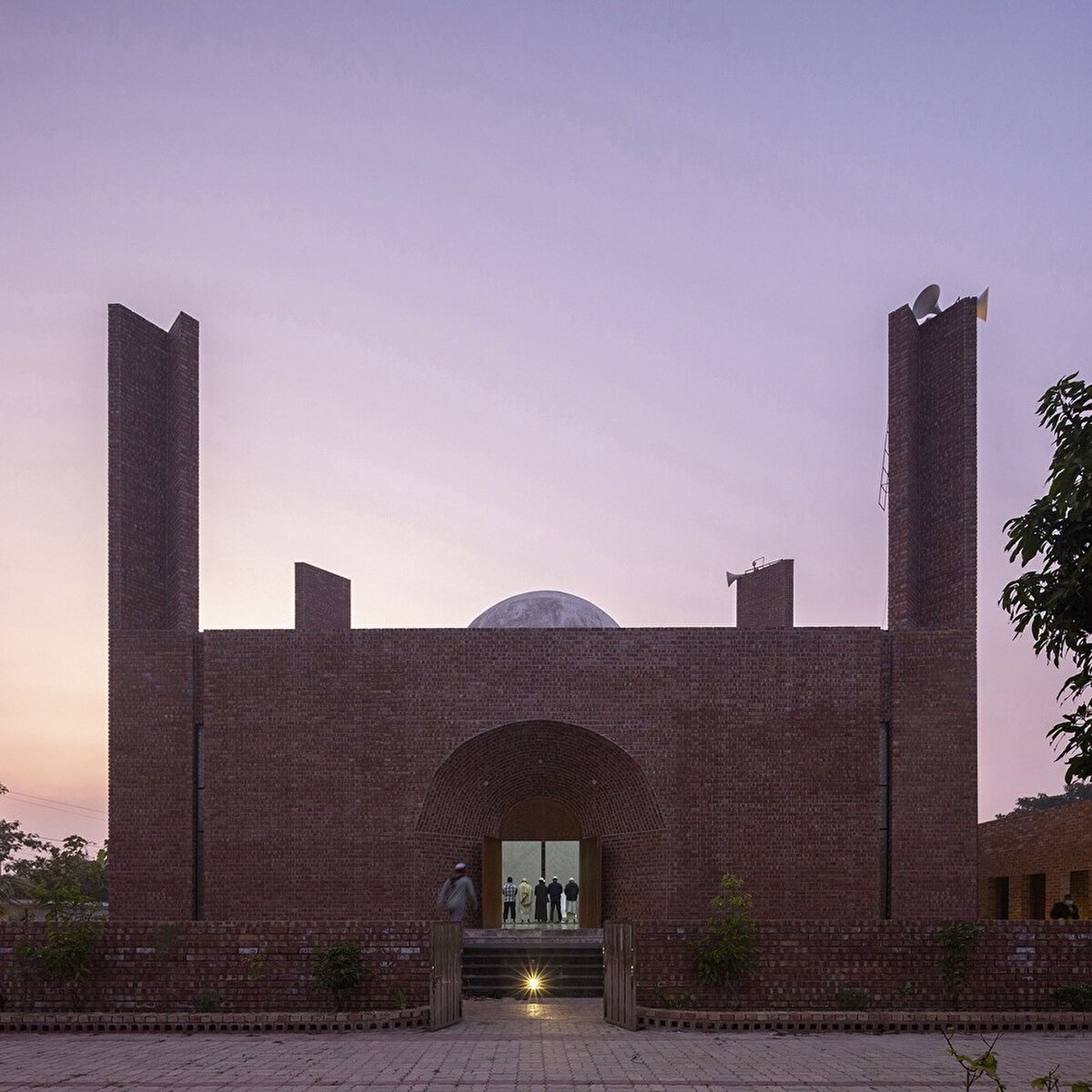 Bait Ur Raiyan Camii, Arial Kha Nehri'nin yakınındaki geleneksel Bangladeş kırsal alanında 464 m² alanda konumlanmış küçük ölçekli bir cami. Bu özel tasarım, İslam Mimarisinin temel sembolizminin soyut yorumunun bir uygulaması olarak, hem formu hem de mekansal kaliteyi dönüştürme açısından geometrik şekilde tasarlanıyor. Caminin manevi varlığını vurgulayan aydınlatma, kutsal ve samimi boyutu korurken, kırmızı tuğla gibi yerel malzemeler kullanılarak insan odaklı bir yaklaşım benimseniyor. Tuğlanın koyu kırmızısı, alanı çevreleyen yeşilliklerle yumuşak bir kontrast oluşturuyor.