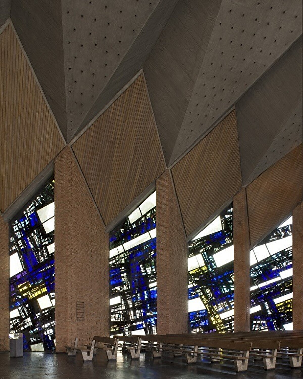 Soyut grafik desenlere sahip vitraylar, heykeltıraş Helmut Lander tarafından tasarlanıyor. Vitraylar, ibadet alanının tek süslemesi olarak dikkat çekiyor. İç mekanda sunağın üzerinde yalnızca basit bir haç bulunuyor. Çağdaş yapı, bariz şekilde 19. yüzyılın yoğun şekilde süslenmiş kilisesiyle bir tezat oluşturuyor. Eski ve yeninin entegrasyonu uluslararası alanda övgüyle karşılandı.