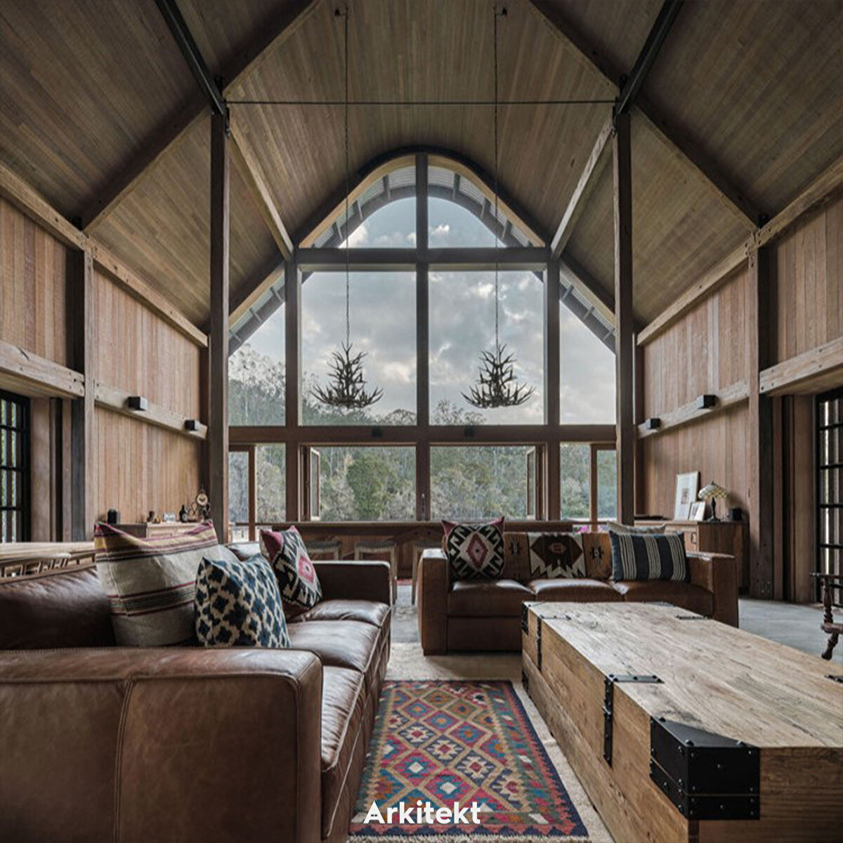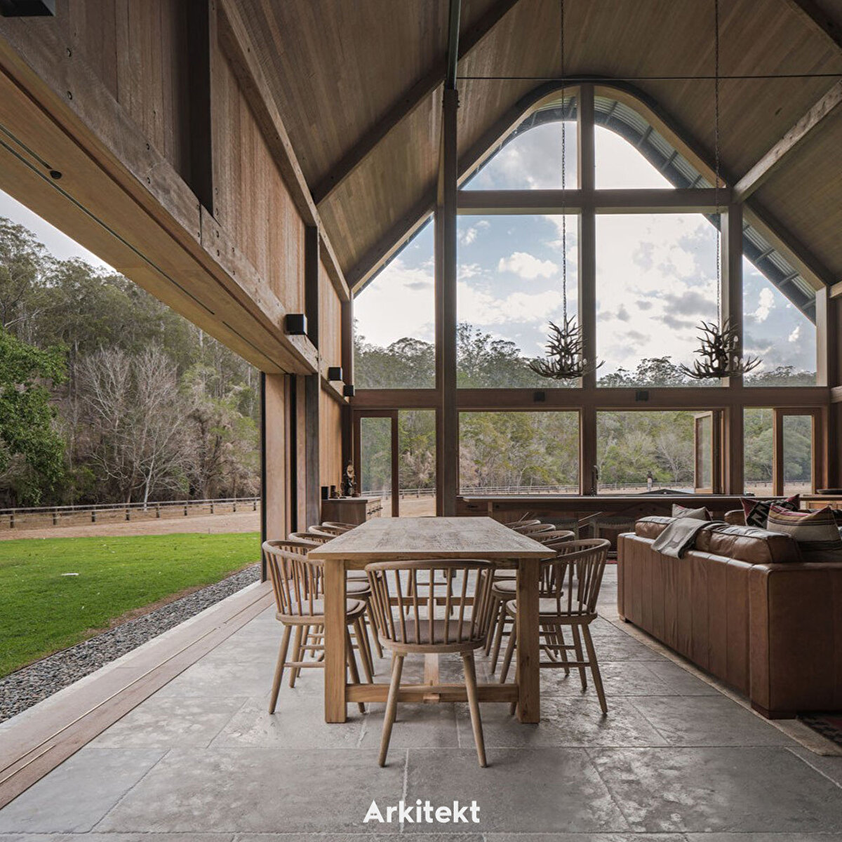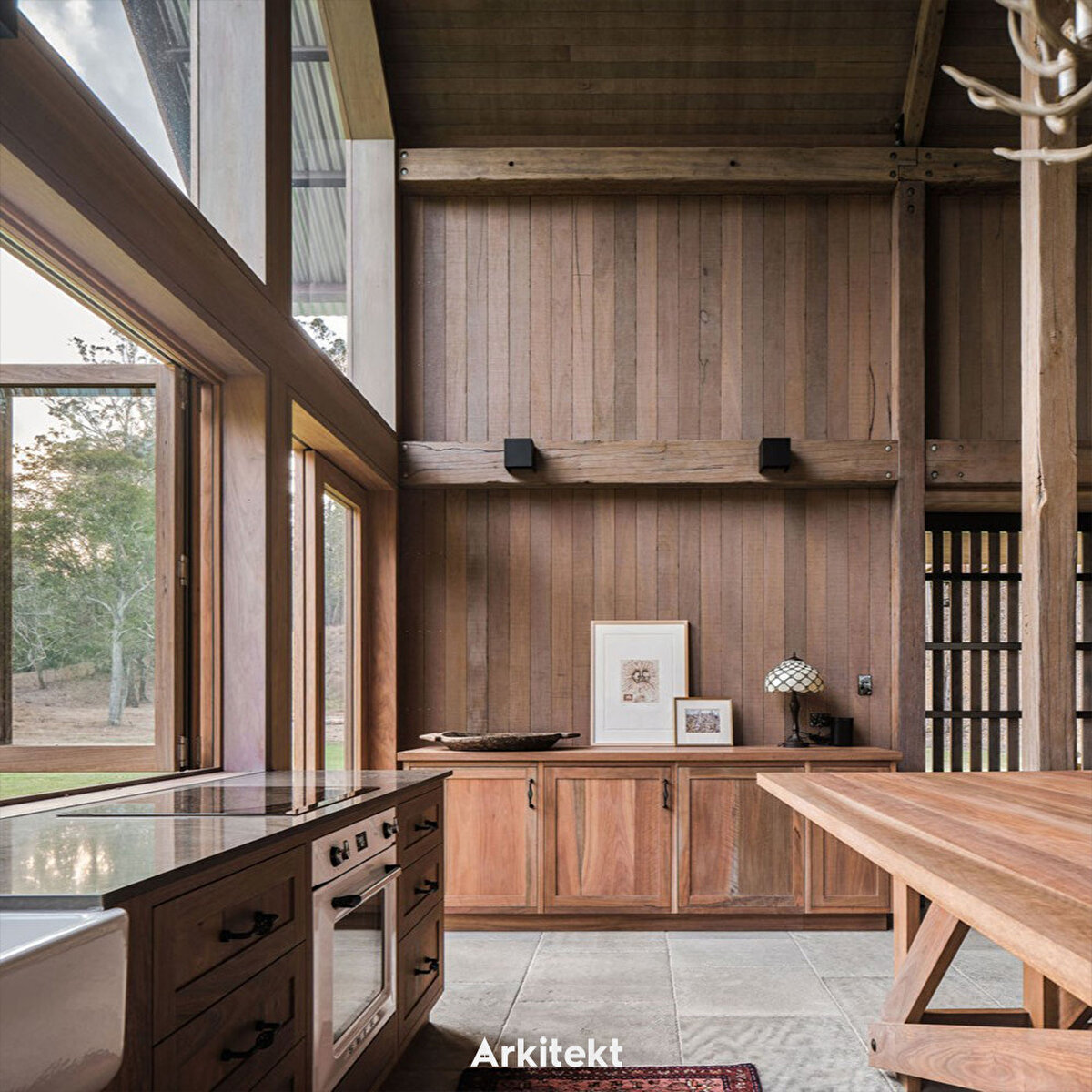 'Ahır' fikri hem dış forma hem de iç mekâna ilham veriyor. Yapının katedral benzeri tavanı, eve genişlik hissi sağlarken ahşap detaylar içerde sıcak bir mekân meydana getiriyor.