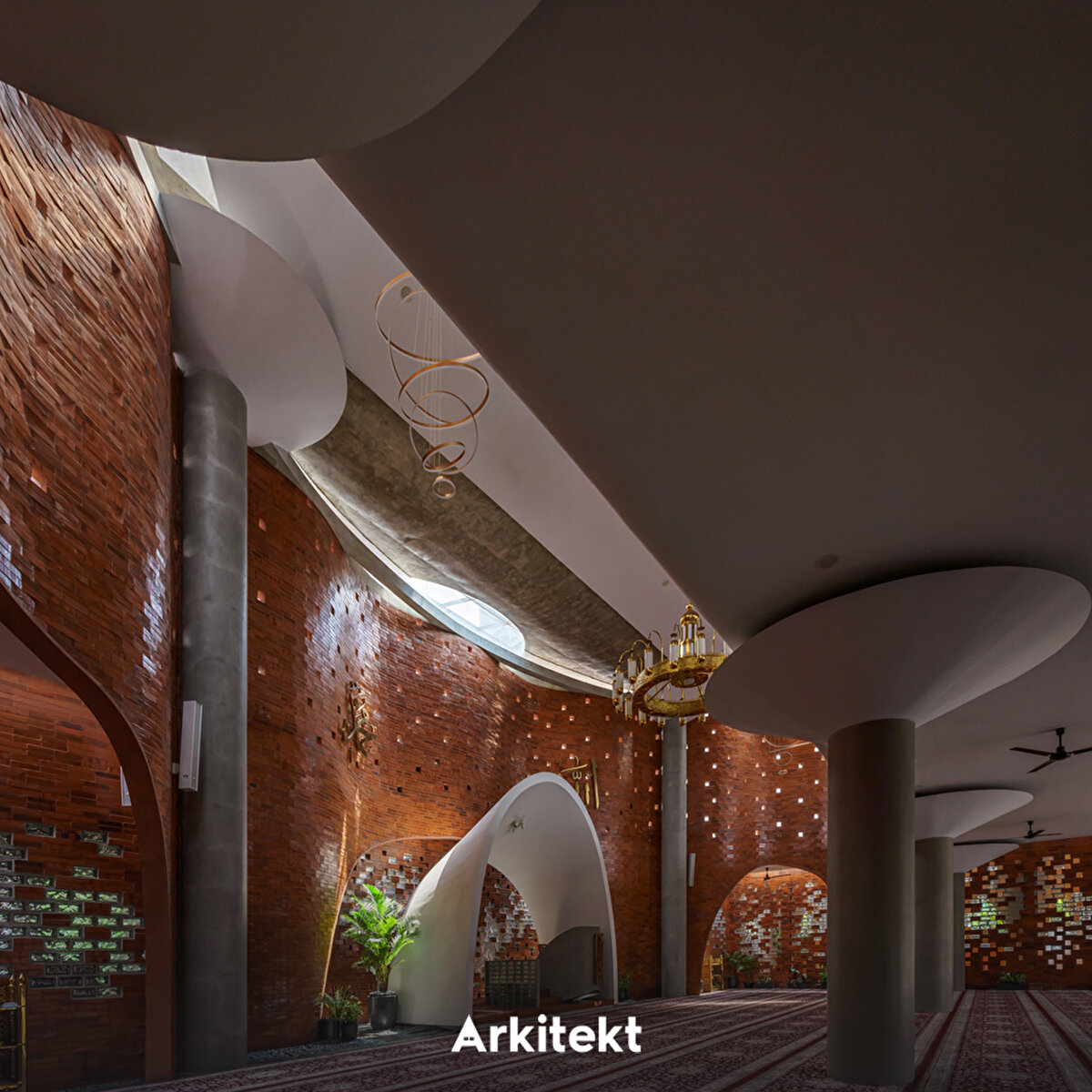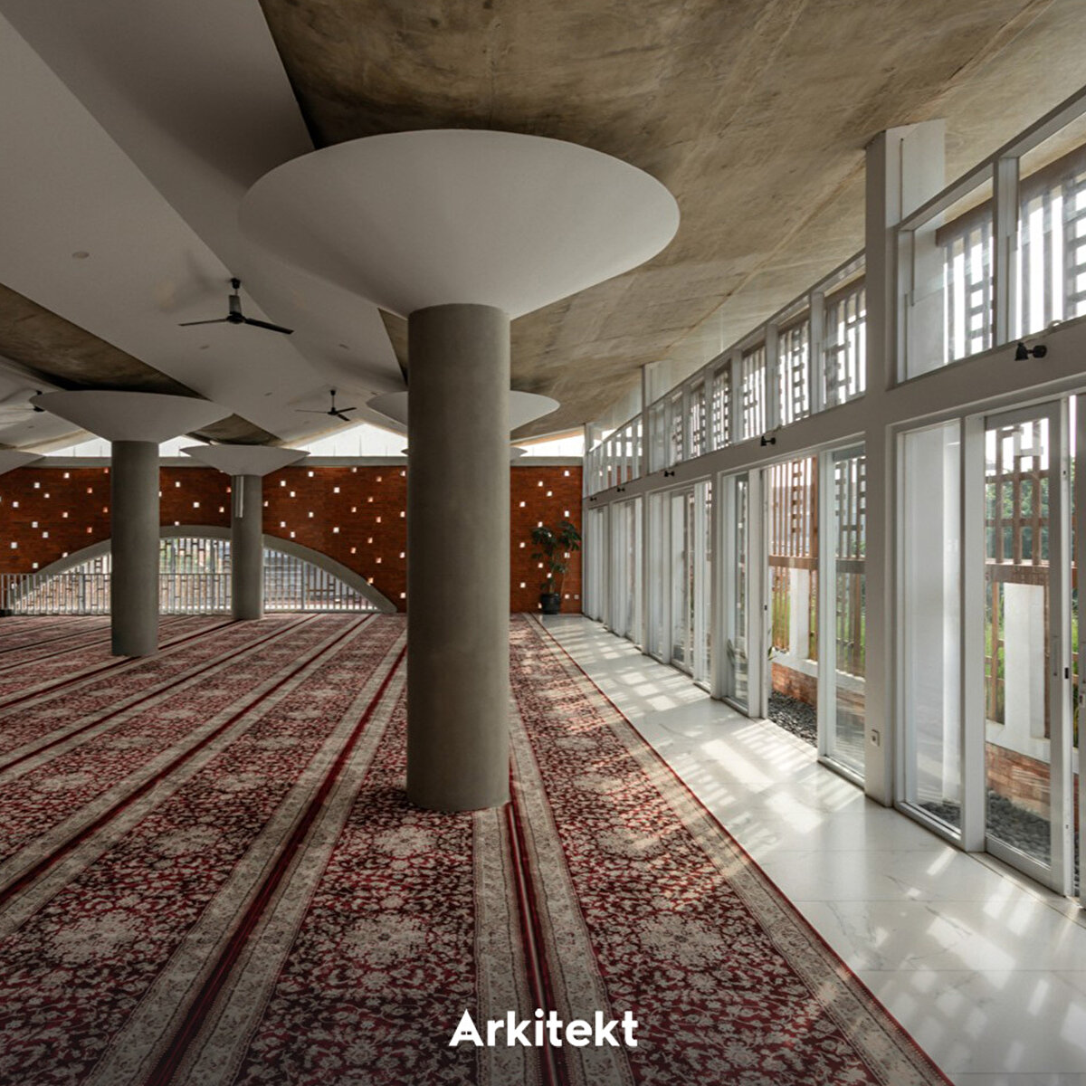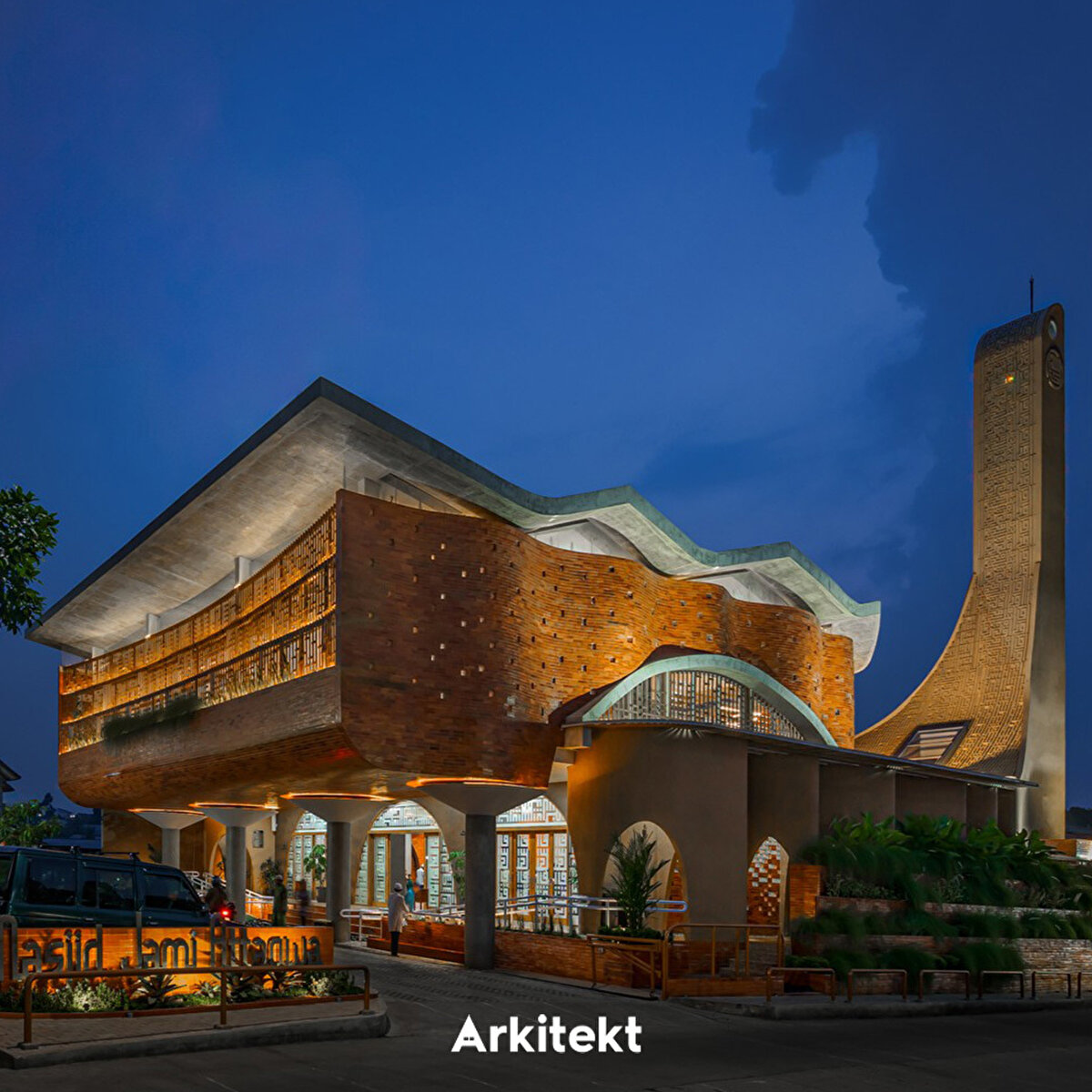 The design of the Cibinong Taqwa Mosque (Jami At-Taqwa Mosque, Cibinong) derives its spatial form from the concept of sujud (prostration), shaping the architecture around its spiritual meaning. Imam Ghazali's approach, which defines prostration as “the folding of the universe," forms the main metaphor of the structure. The “folding" movement used in the facade and structure conveys the idea of closeness to Allah to the space. Located on a busy street, the structure protects the worship space from noise and dust with a porticoed passageway and green buffer fences. The arcade also provides access to the ablution areas and spatially separates the circulation of women and men. The minaret, positioned on the qibla axis, carries the language of the facade upwards, reinforcing the emphasis on direction and worship. The use of perforated brick and exposed concrete in the material selection achieves natural ventilation and a simple spatial atmosphere.