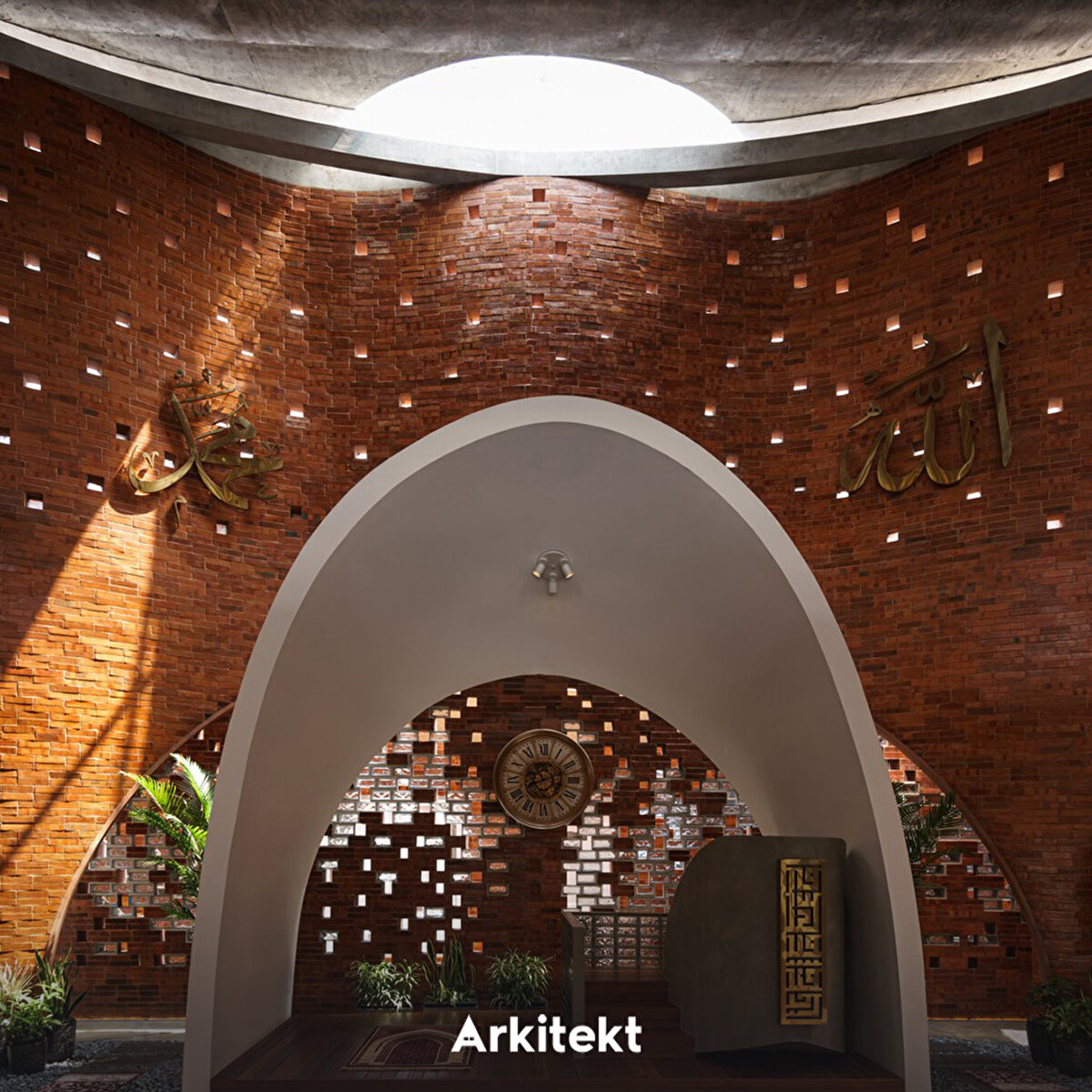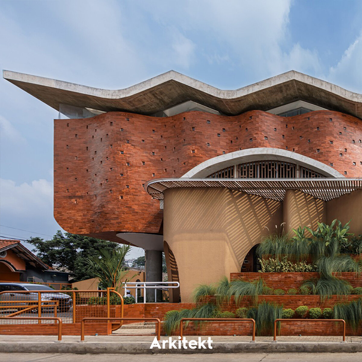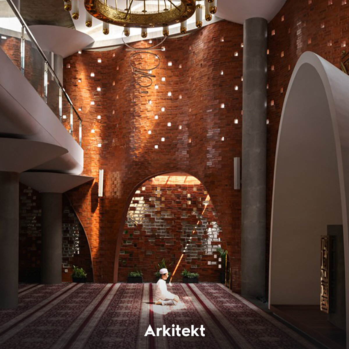 The design of the Cibinong Taqwa Mosque (Jami At-Taqwa Mosque, Cibinong) derives its spatial form from the concept of sujud (prostration), shaping the architecture around its spiritual meaning. Imam Ghazali's approach, which defines prostration as “the folding of the universe," forms the main metaphor of the structure. The “folding" movement used in the facade and structure conveys the idea of closeness to Allah to the space. Located on a busy street, the structure protects the worship space from noise and dust with a porticoed passageway and green buffer fences. The arcade also provides access to the ablution areas and spatially separates the circulation of women and men. The minaret, positioned on the qibla axis, carries the language of the facade upwards, reinforcing the emphasis on direction and worship. The use of perforated brick and exposed concrete in the material selection achieves natural ventilation and a simple spatial atmosphere.