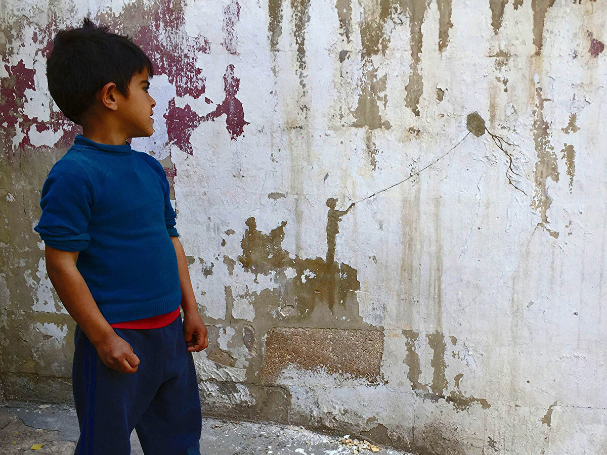 Pejac, duvarlardaki boya katmanlarını incelikle kaldırarak 4 farklı çalışma oluştuyor; Palestine, Kite (Uçurtma), Migration (Göç) ve Throne (Taht).