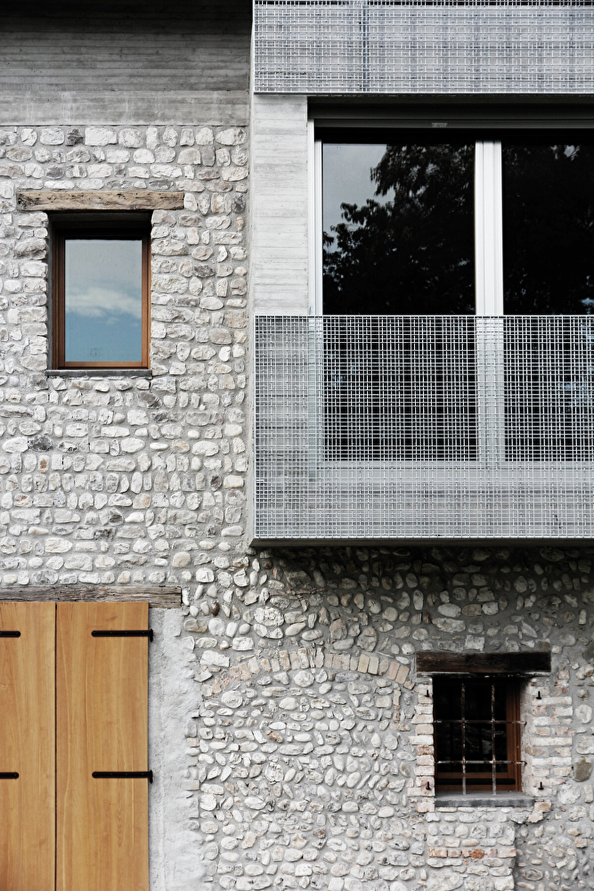 Geleneksel taş duvarların kullanımının yeniden yorumlanması, bölge riskli bir sismik alan olarak kabul edildiği için biraz zorlayıcıydı. Kompleksin ana binası, mimari açıdan önem taşıyan bazı özellikleri korunarak tek ailelik bir konut oluşturmak üzere yeniden yapılandırıldı, ahır kısmı ise tamamen yıkılarak ikinci konut yapısı inşa edildi. Stoned House projesinin bu bölümü; taş duvarlar, kemerli bir revak ve malzemelerin sağlam doğasının uyumlu bir açıklık ile birleştirildiği bir ana cepheyi kapsıyor.