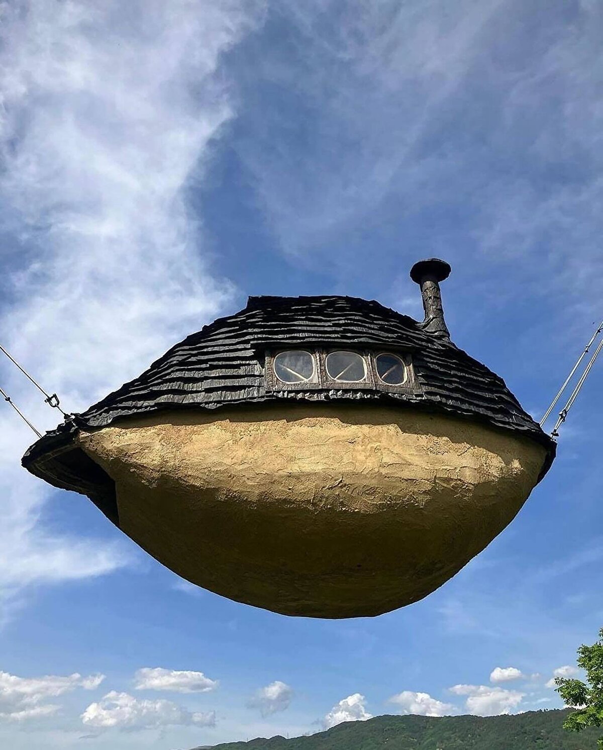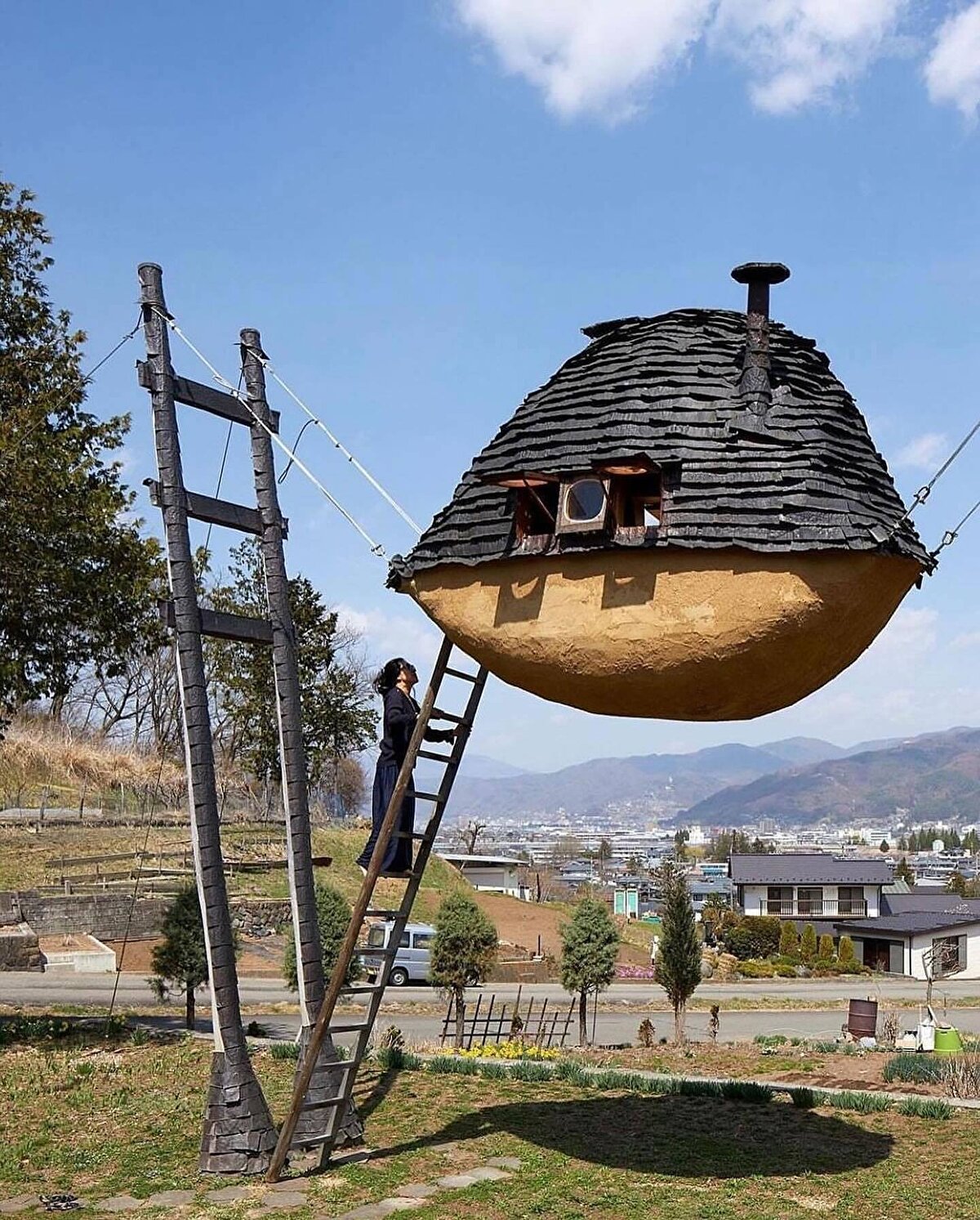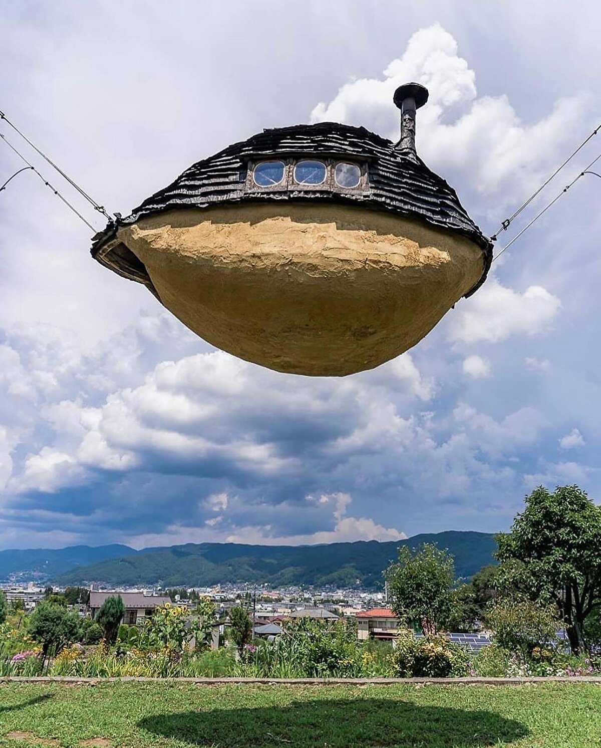 Japon mimar Terunobu Fujimori tarafından tasarlanan Uçan Çamur Evi, her ortama uyum sağlayabilen, çay evi konseptli bir yapı. Ceviz kabuğunu andıran dış görünüşü, üst kısmında ahşap kiremit çatı, alt kısmında ise doğal malzeme olan çamur sıva bulunuyor. Bu organik malzemeler, termal özellikleriyle dikkat çekiyor. İç mekanında ahşap ve dairesel pencereler, rahat ve davetkar bir atmosfer sunuyor. Yapı, ince kablolarla asılı olduğu için yerçekimine meydan okuyan bir görünüm sergiliyor.