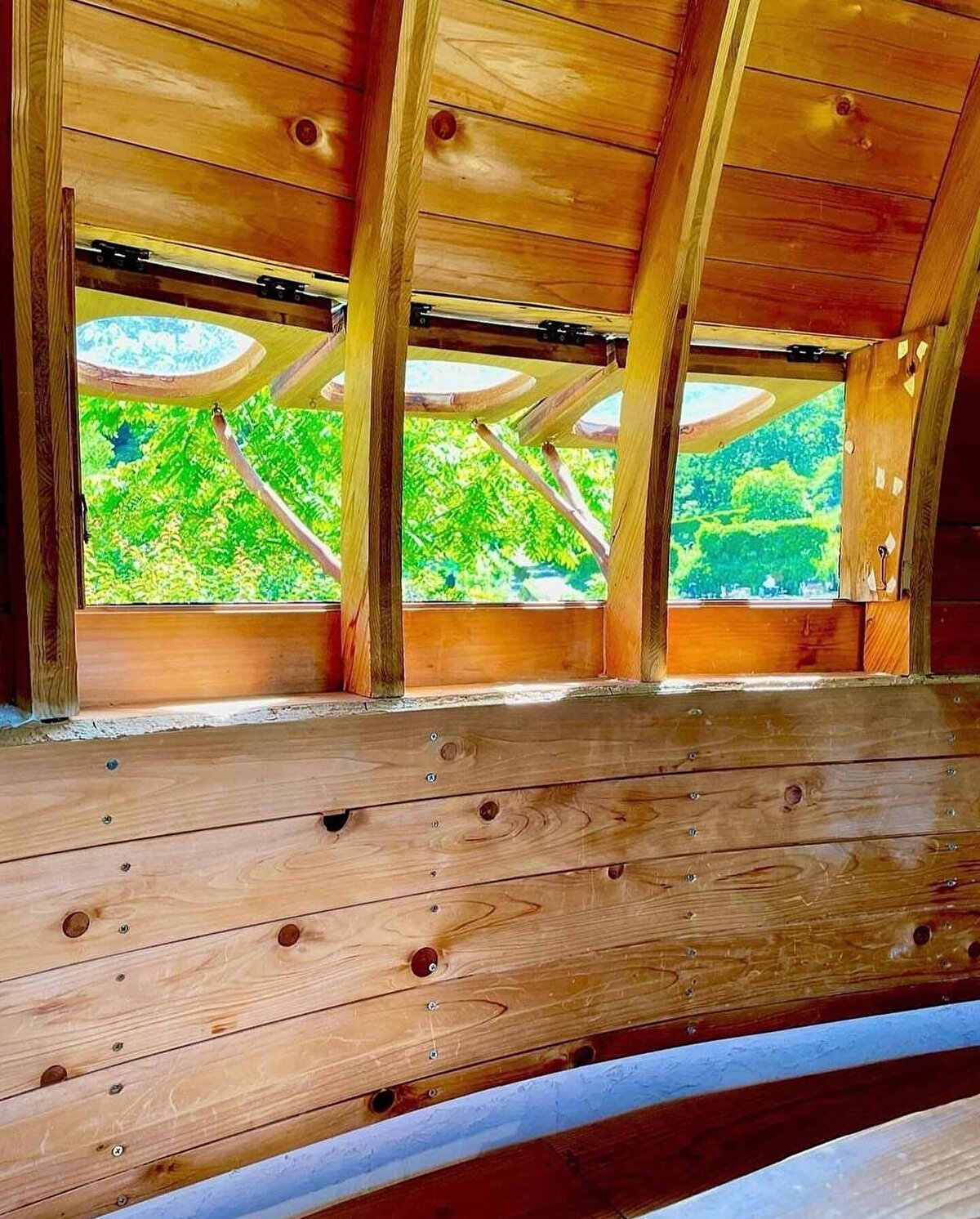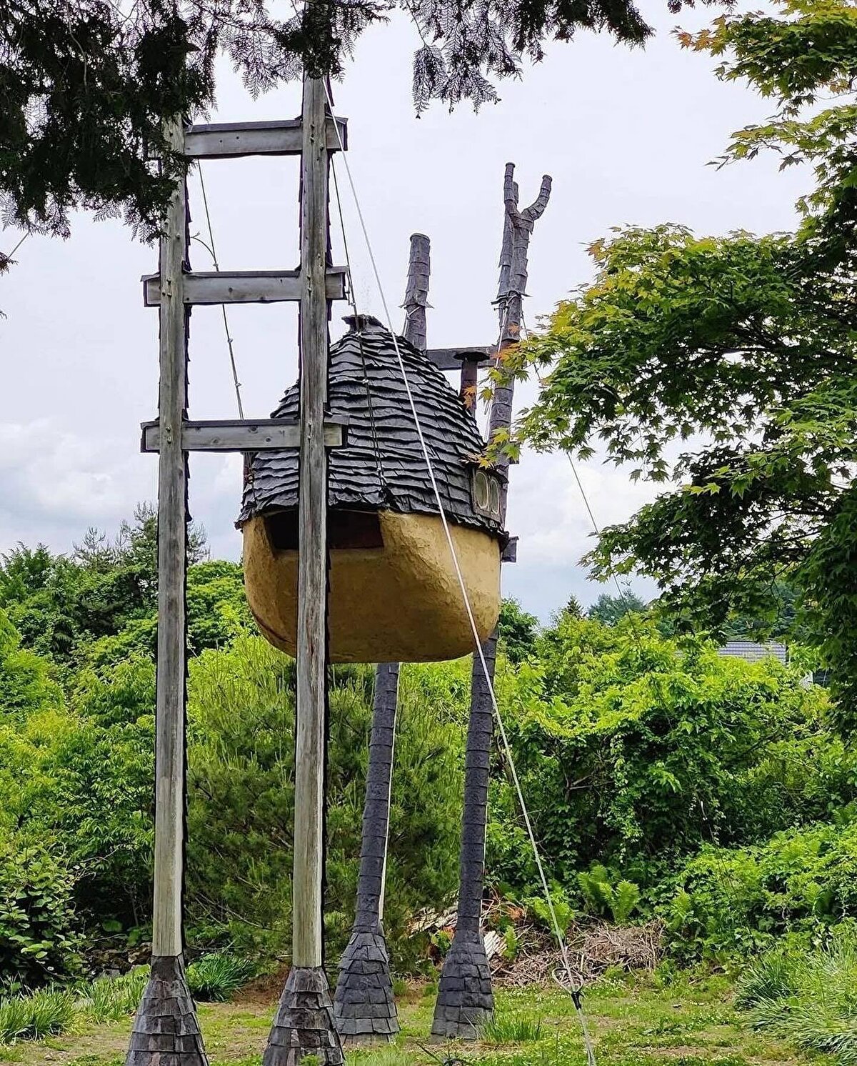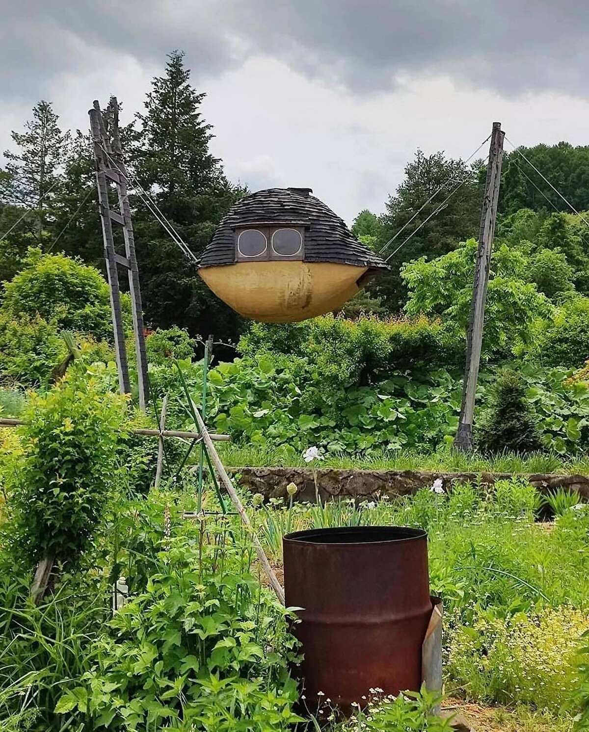 Japon mimar Terunobu Fujimori tarafından tasarlanan Uçan Çamur Evi, her ortama uyum sağlayabilen, çay evi konseptli bir yapı. Ceviz kabuğunu andıran dış görünüşü, üst kısmında ahşap kiremit çatı, alt kısmında ise doğal malzeme olan çamur sıva bulunuyor. Bu organik malzemeler, termal özellikleriyle dikkat çekiyor. İç mekanında ahşap ve dairesel pencereler, rahat ve davetkar bir atmosfer sunuyor. Yapı, ince kablolarla asılı olduğu için yerçekimine meydan okuyan bir görünüm sergiliyor.