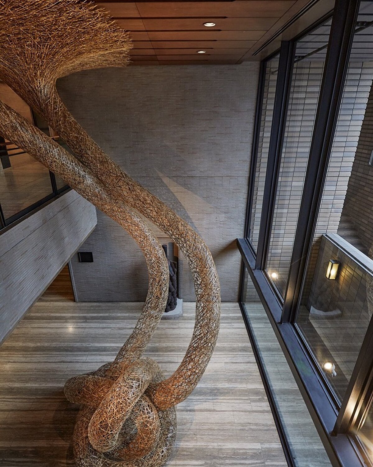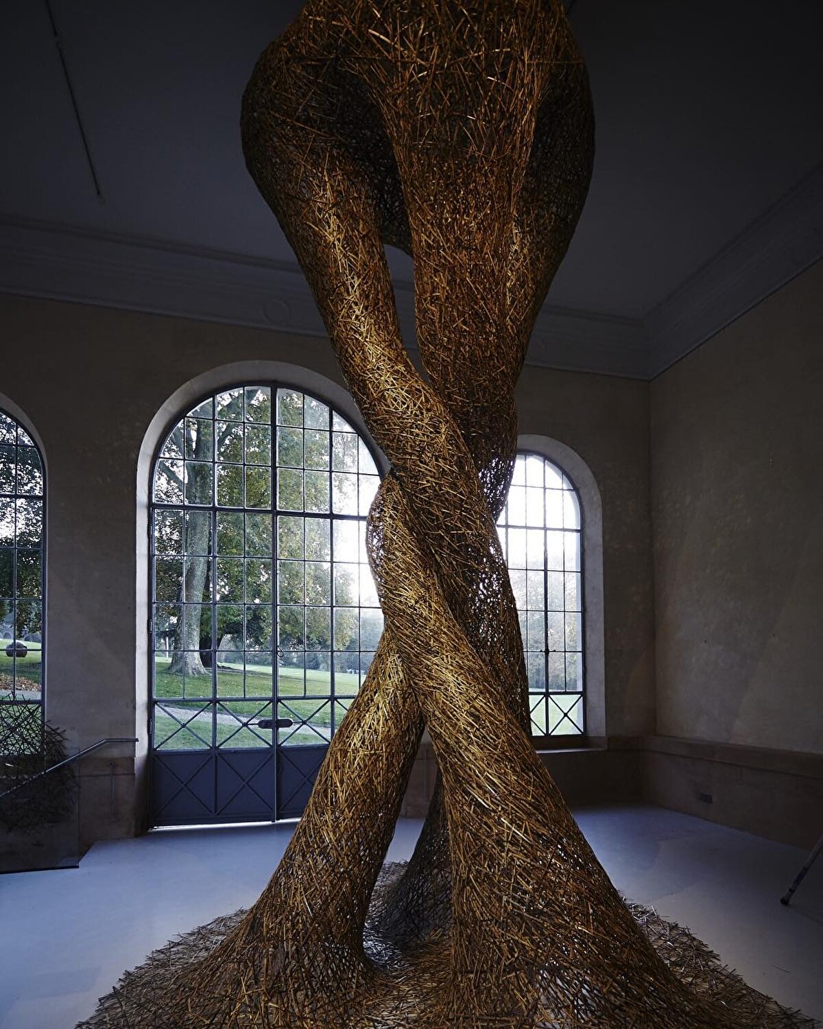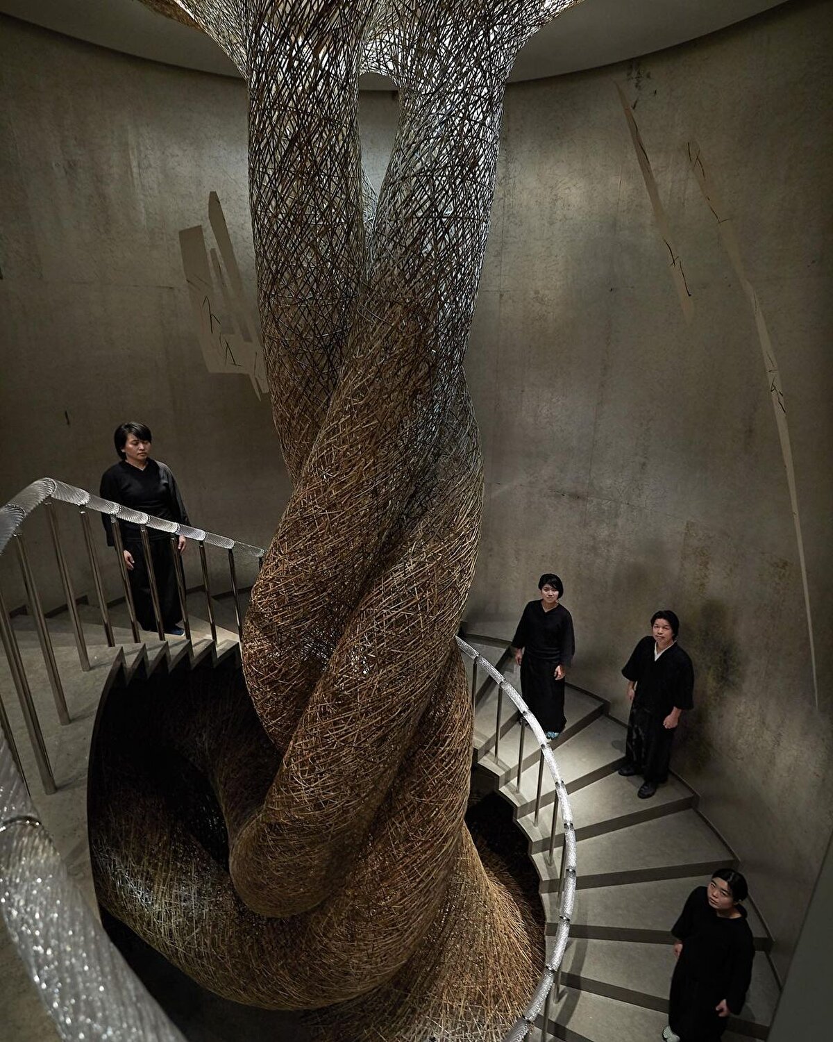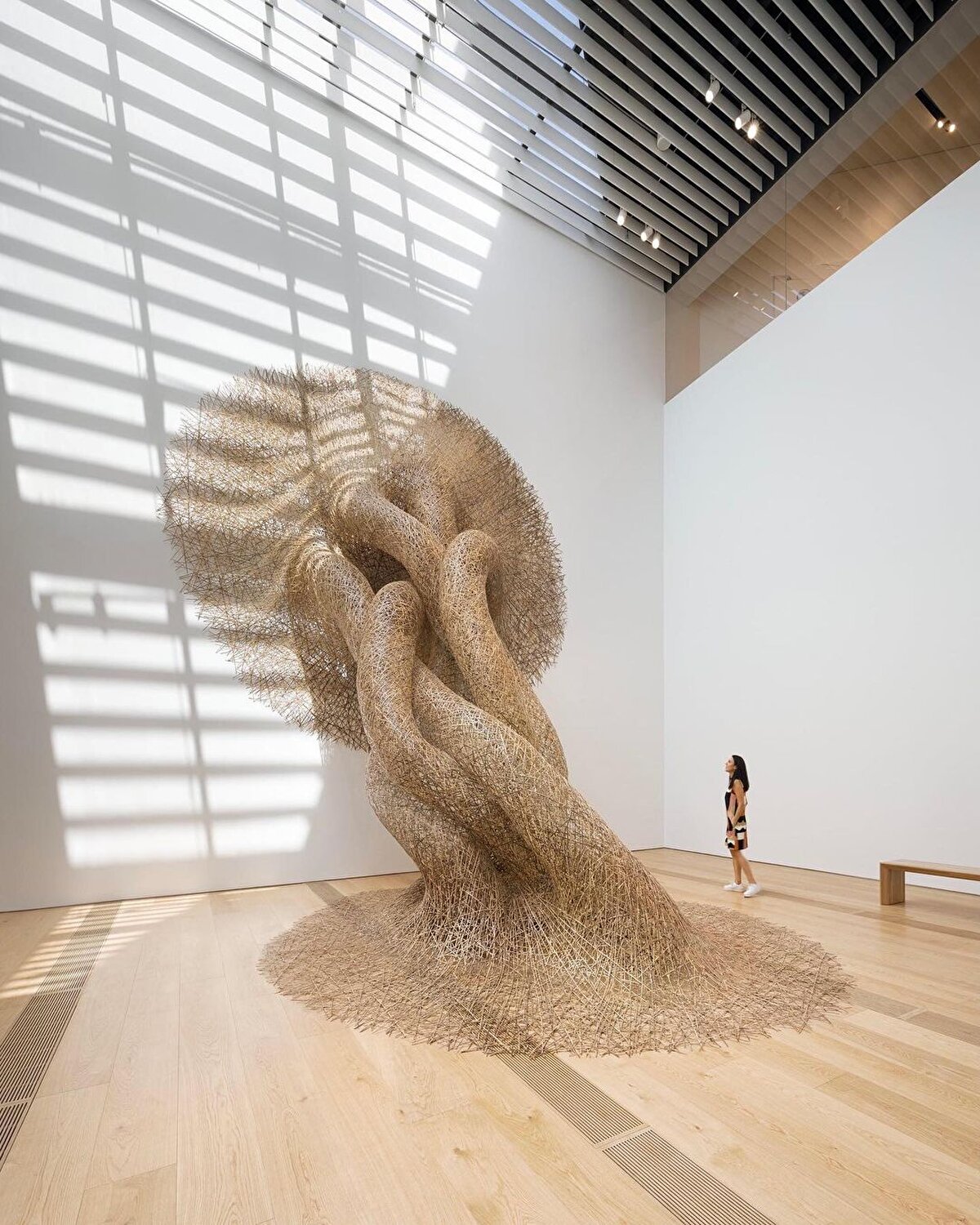 Mimari yapı unsurlarıyla bütünleşen yerleştirmelerde geleneksel sepet örgülerinden ilham alan sanatçı, eserlerini farklı mimari mekanlarda sergiliyor.