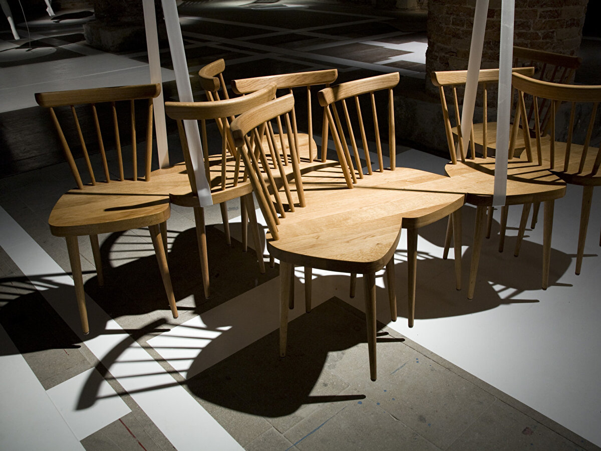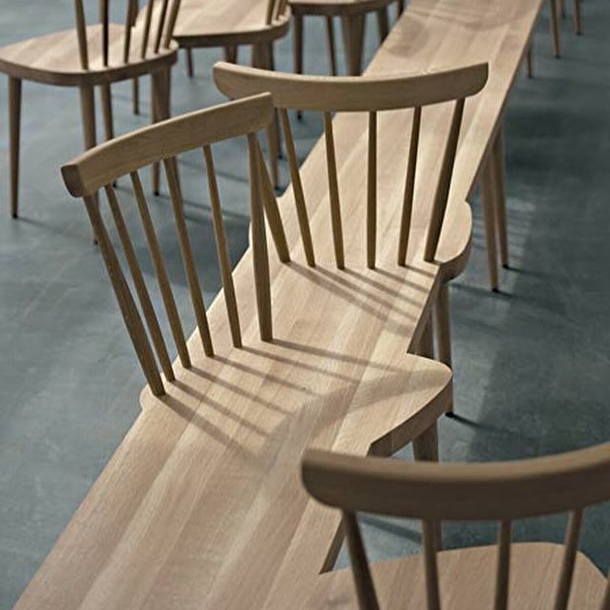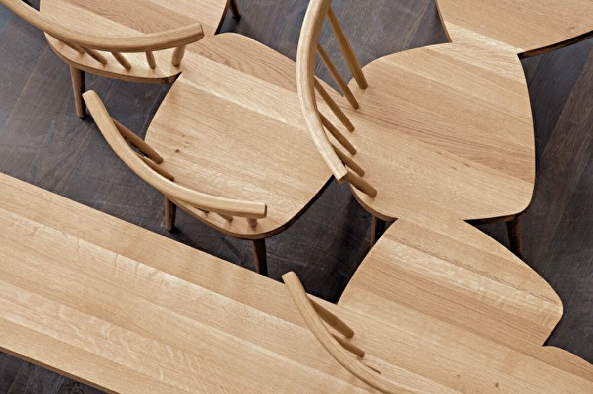 Bu tasarım sandalyeler, diğer mobilya parçalarıyla (sandalyeler, masa, tabureler, banklar) birleşerek bütünsel bir çerçeve oluşturuyor.