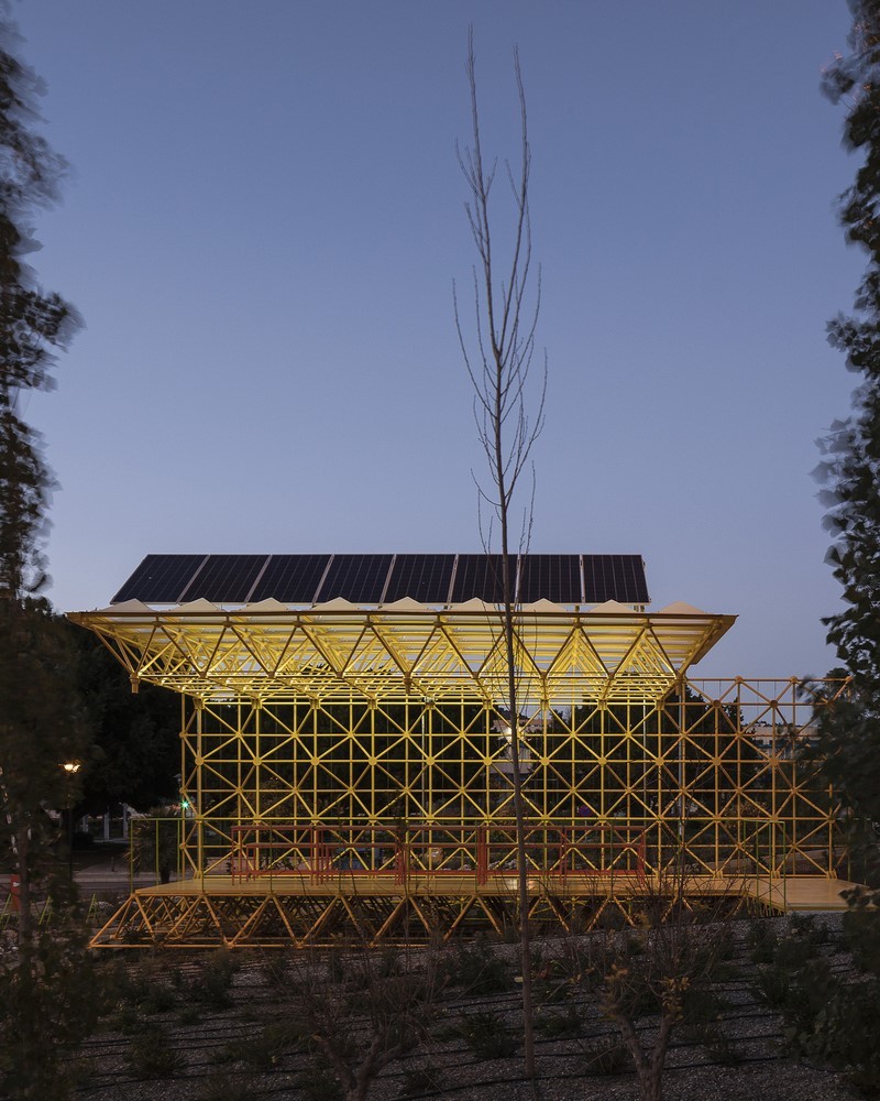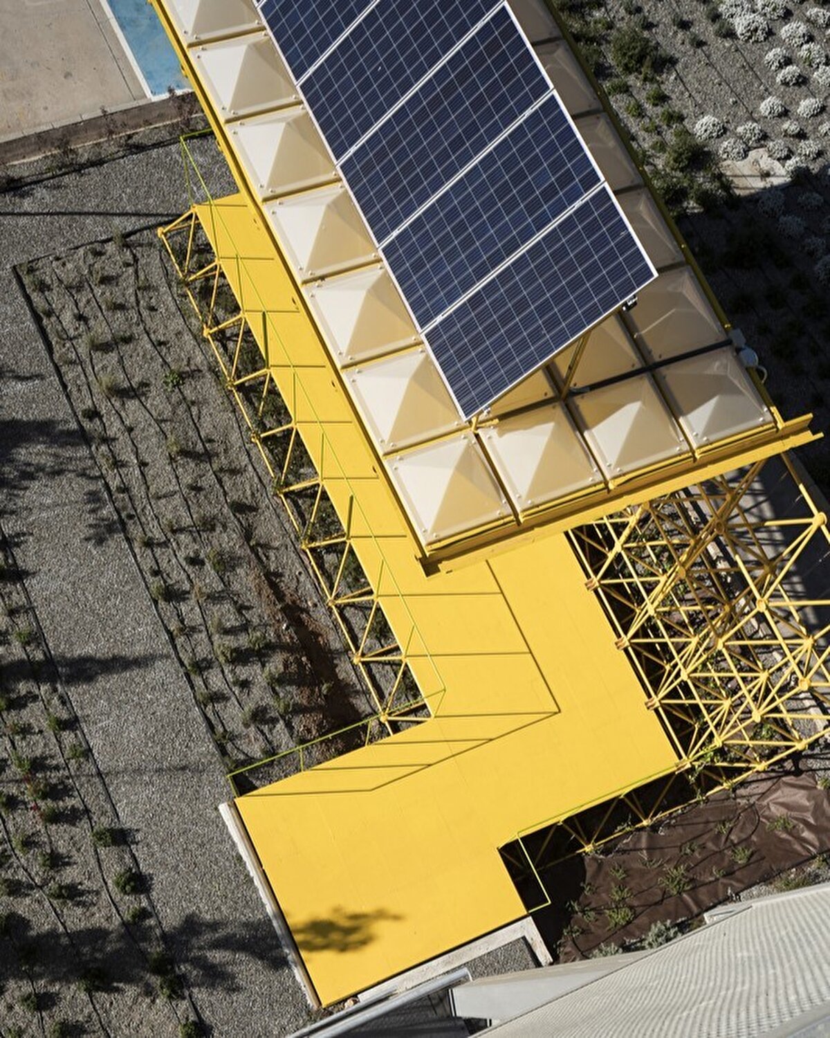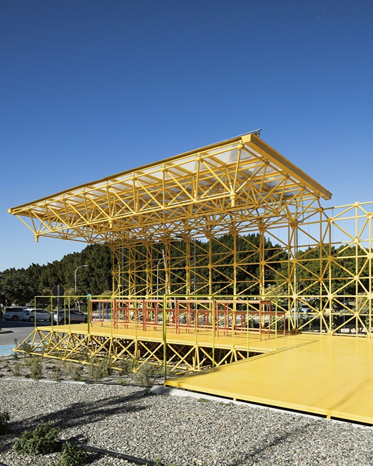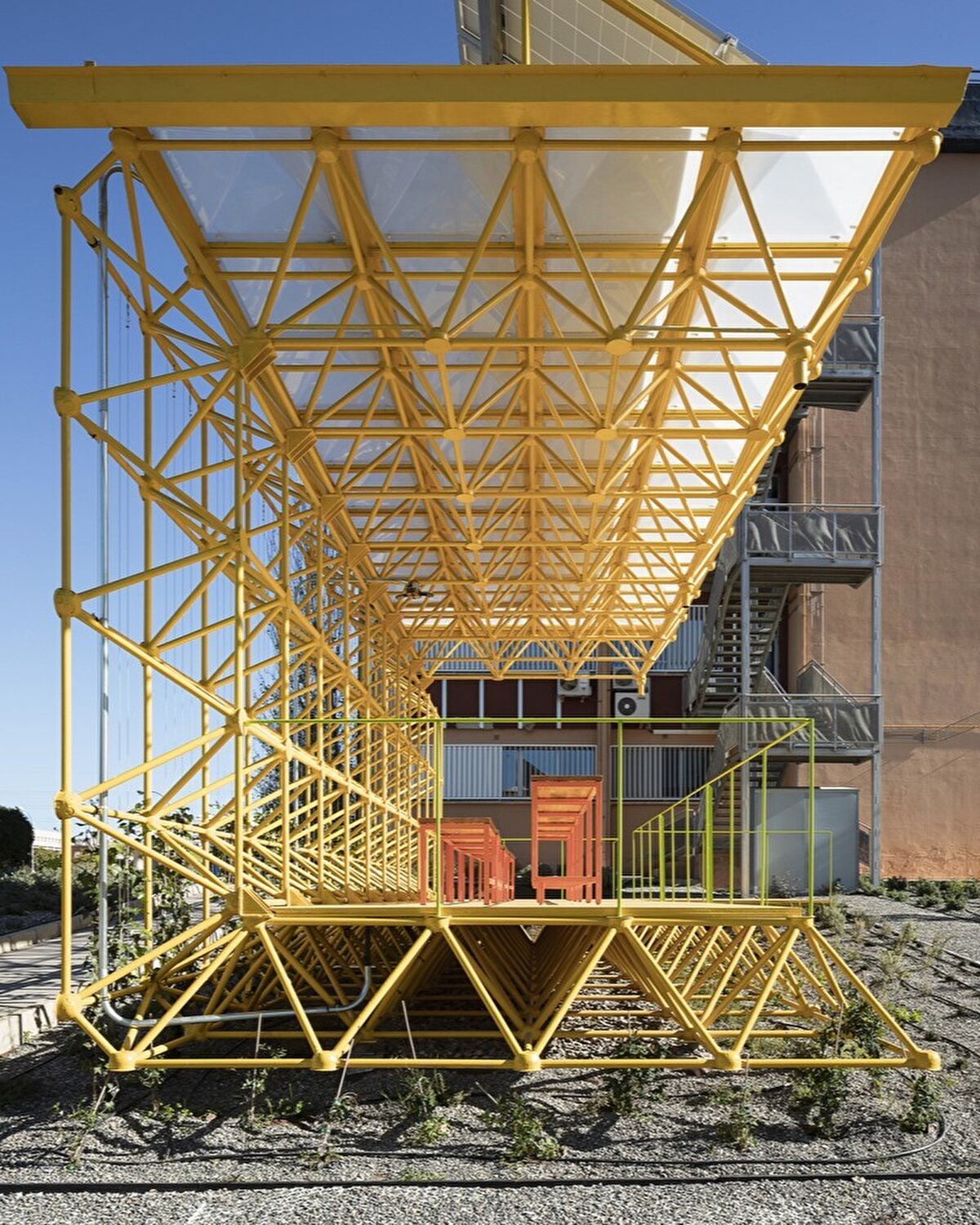 Proje, eski binaların yıkımından kalan parçaları yeniden kullanarak (beton kolonlar, metal çerçeveler, ahşap panolar) bir tür açık hava çalışma alanı “pavyonu" inşa ediyor. Üç adet üçgen biçimli yapı elemanı, yıkımdan gelen pergola çerçevesinden elde ediliyor. Bu yapı elemanları bir kısmıyla zemin platformu, bir kısmıyla düşey taşıyıcı sistem, bir kısmıyla da örtü olarak işlev kazanıyor. Böylece yeni yapı, “yeni eleman eklemeden" oluşturuluyor.